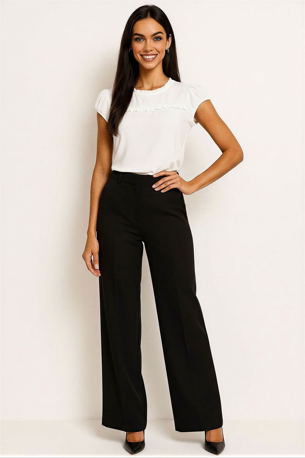 Blusa con escote redondo, manga corta con olan en hombro, detalle calado en pecho, corte recto, textura ligera, ajuste cómodo