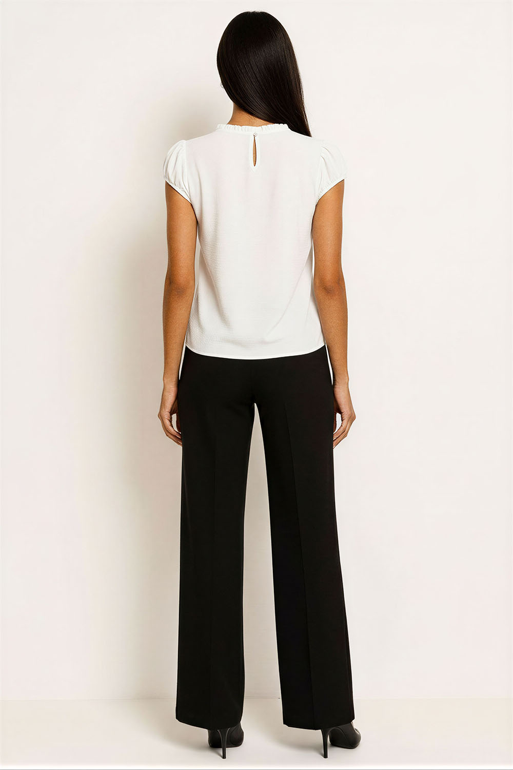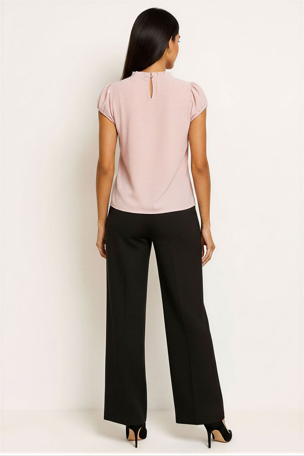 Blusa sin mangas en tela ligera de caída fluida, cuello alto con jareta ajustable lateral para adaptarlo al gusto, volantes en hombros que ofrecen un toque delicado, silueta suelta con sensación de frescura y comodidad