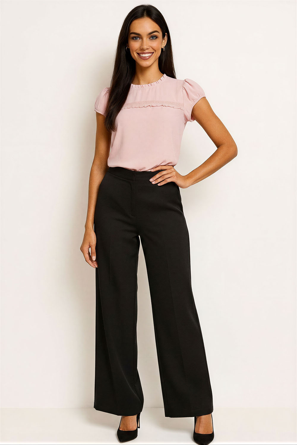 Blusa de corte recto con cuello redondo que aporta ajuste cómodo, manga corta con ligero volumen que brinda movilidad, aplicación decorativa al frente con acabado sutil que añade detalle visual, confección en tejido ligero que favorece la transpiración, largo a la cadera que permite un uso versátil en diferentes ocasiones