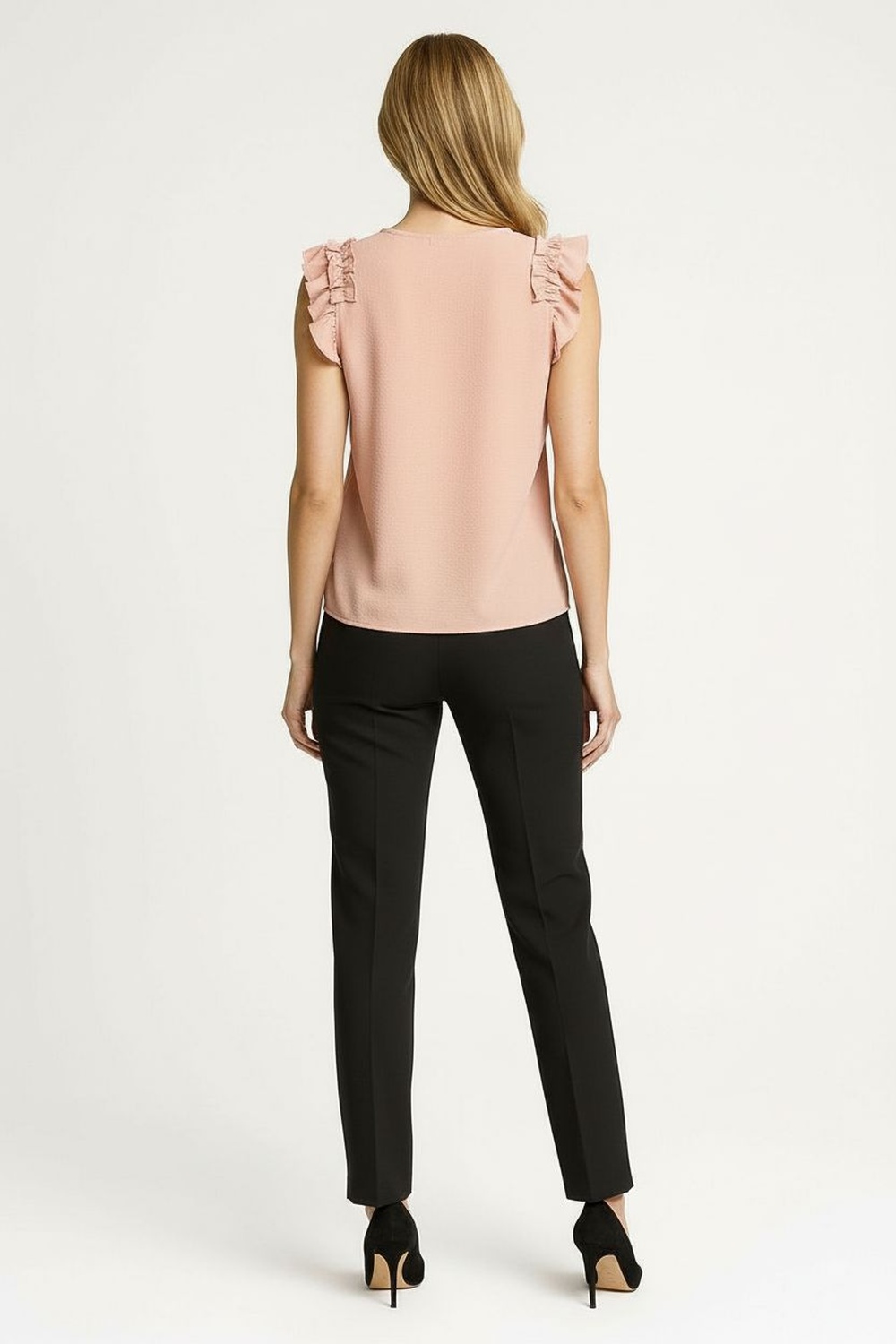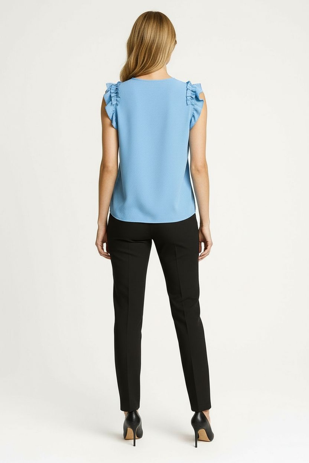 Blusa sin manga con aplicación de volantes en hombros cuello redondo estructura ligera y caída natural que brinda comodidad