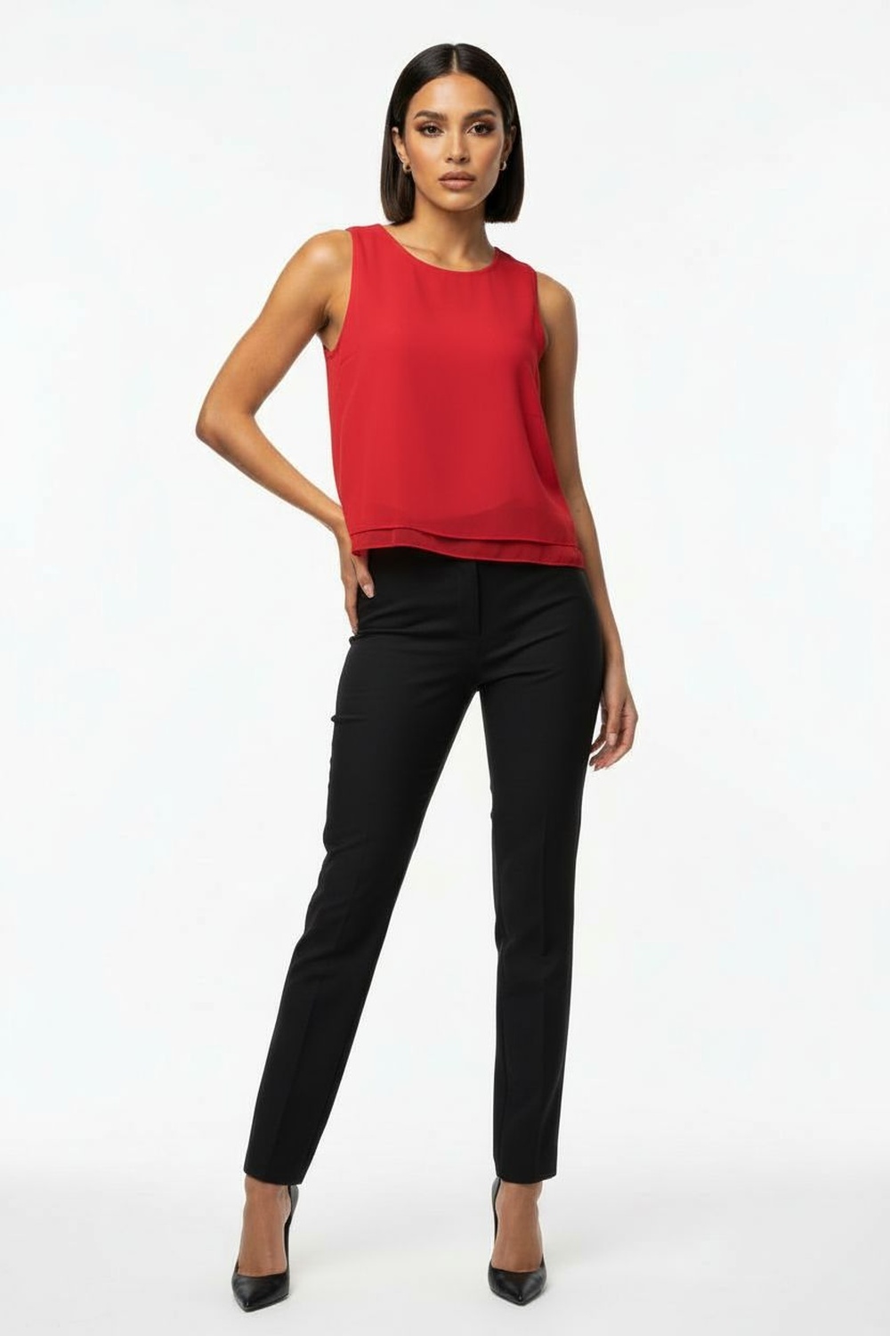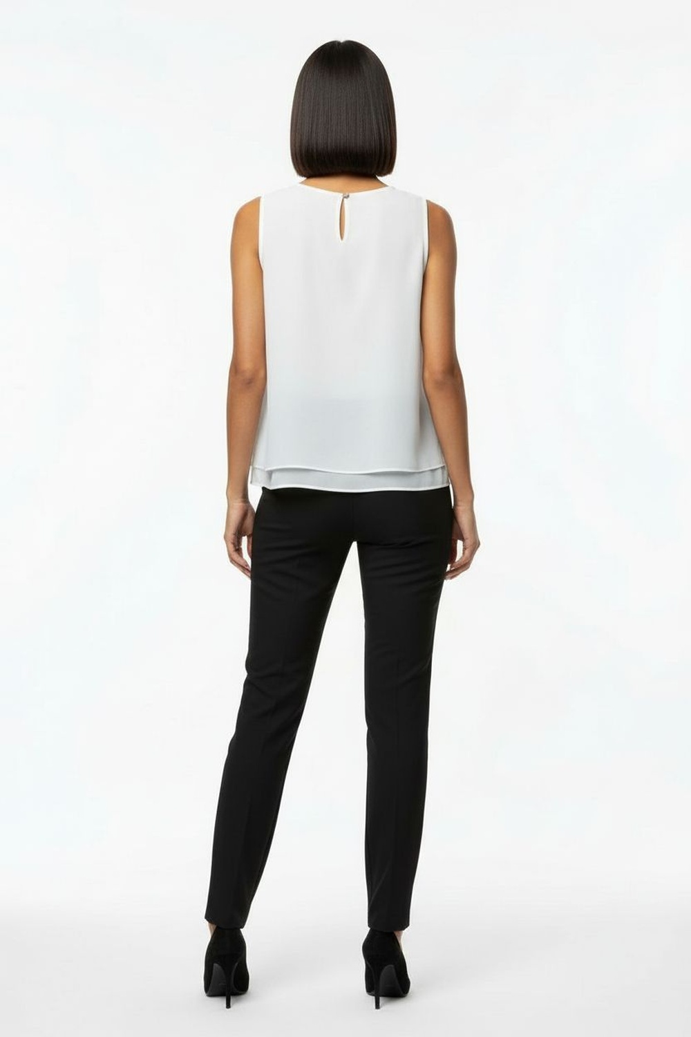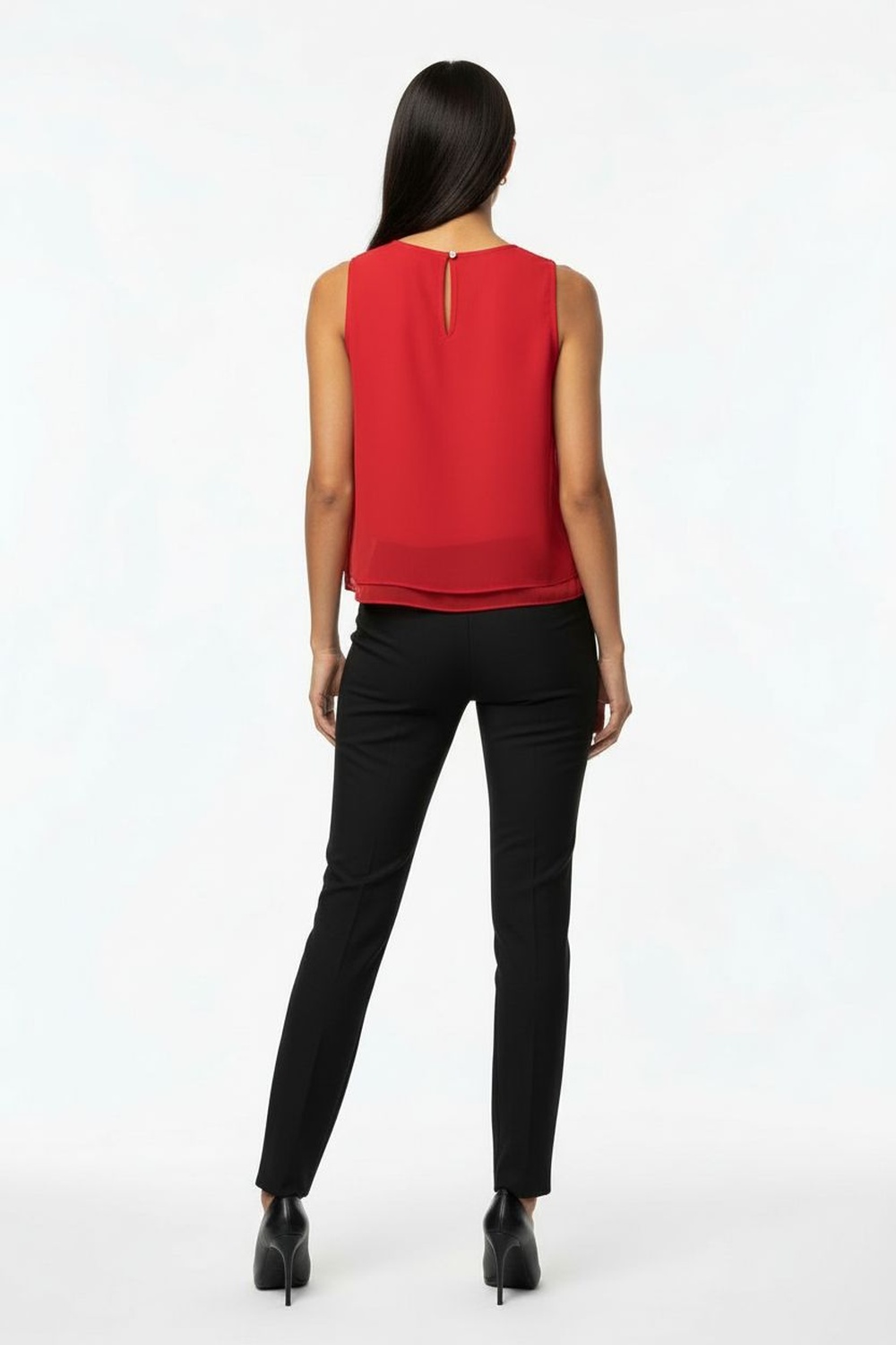 Blusa sin mangas de doble capa, escote redondo, diseño ligero con caída fluida, acabado limpio en orillas, silueta recta