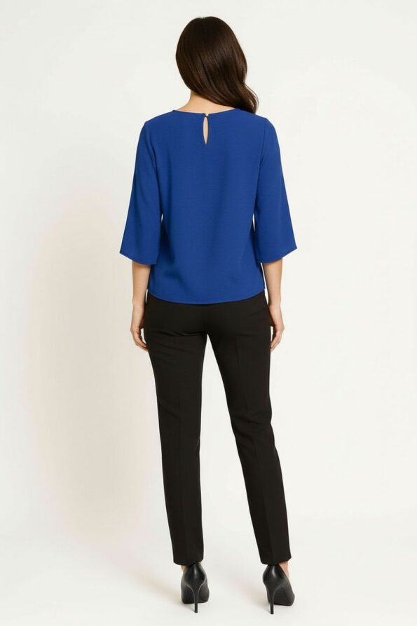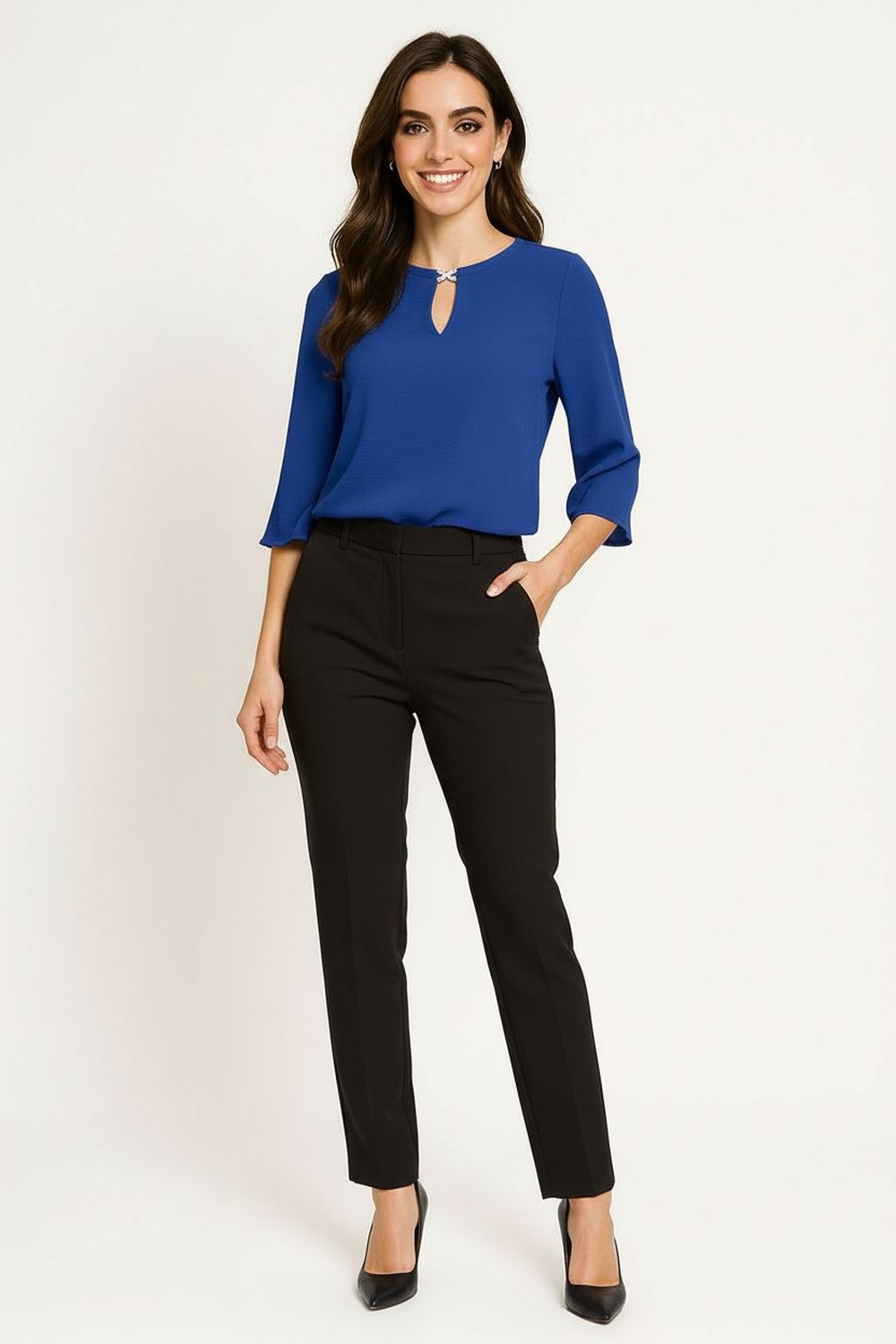Blusa con escote en forma de V decorado con herraje metálico que aporta un detalle moderno y refinado, manga tres cuartos que brinda equilibrio visual y comodidad, caída fluida que favorece la silueta con acabado estructurado para una apariencia pulida, cierre discreto en la parte posterior que garantiza un ajuste firme y funcional