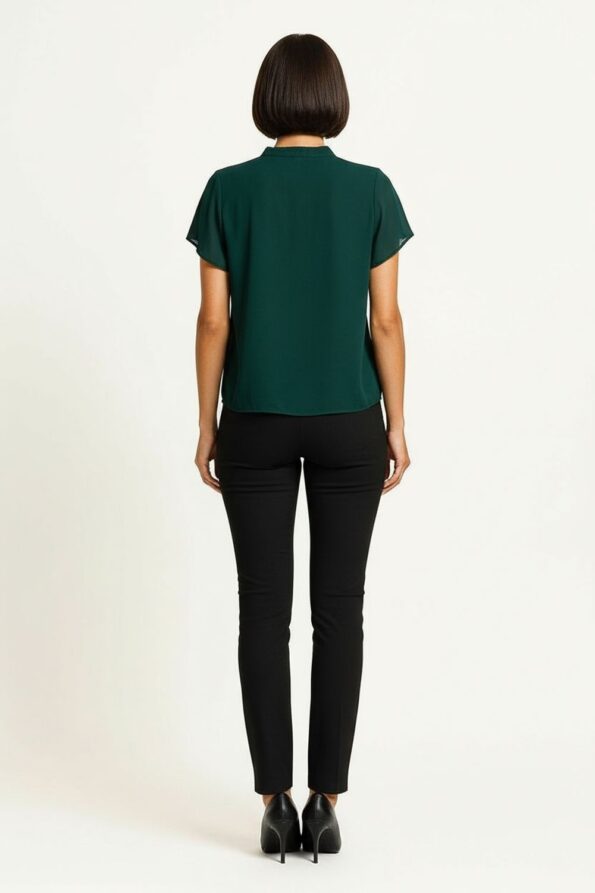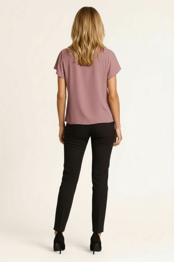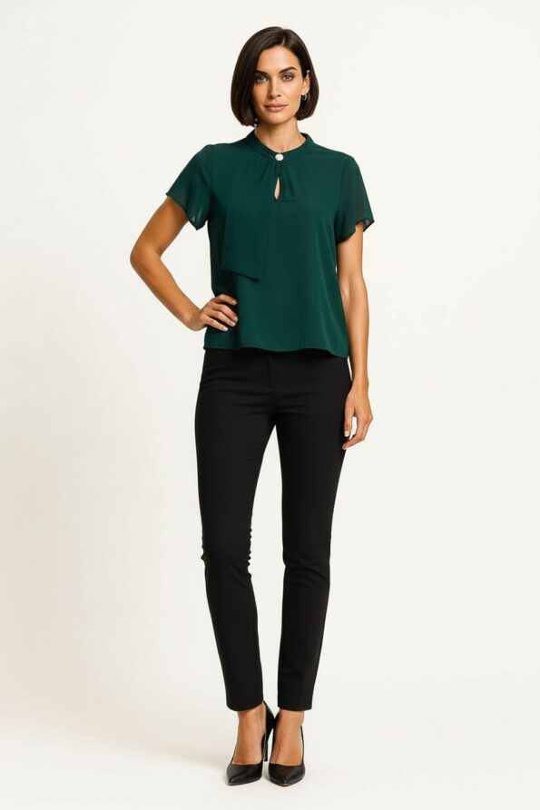 Blusa de manga corta con cuello redondo y abertura central decorada con lazo fijo, caída recta que favorece la silueta con acabado ligero y suave al tacto, costuras finas que aportan durabilidad y detalle de botón en el cuello que realza el diseño, prenda versátil para distintas ocasiones con confección de tejido fluido que aporta comodidad y frescura