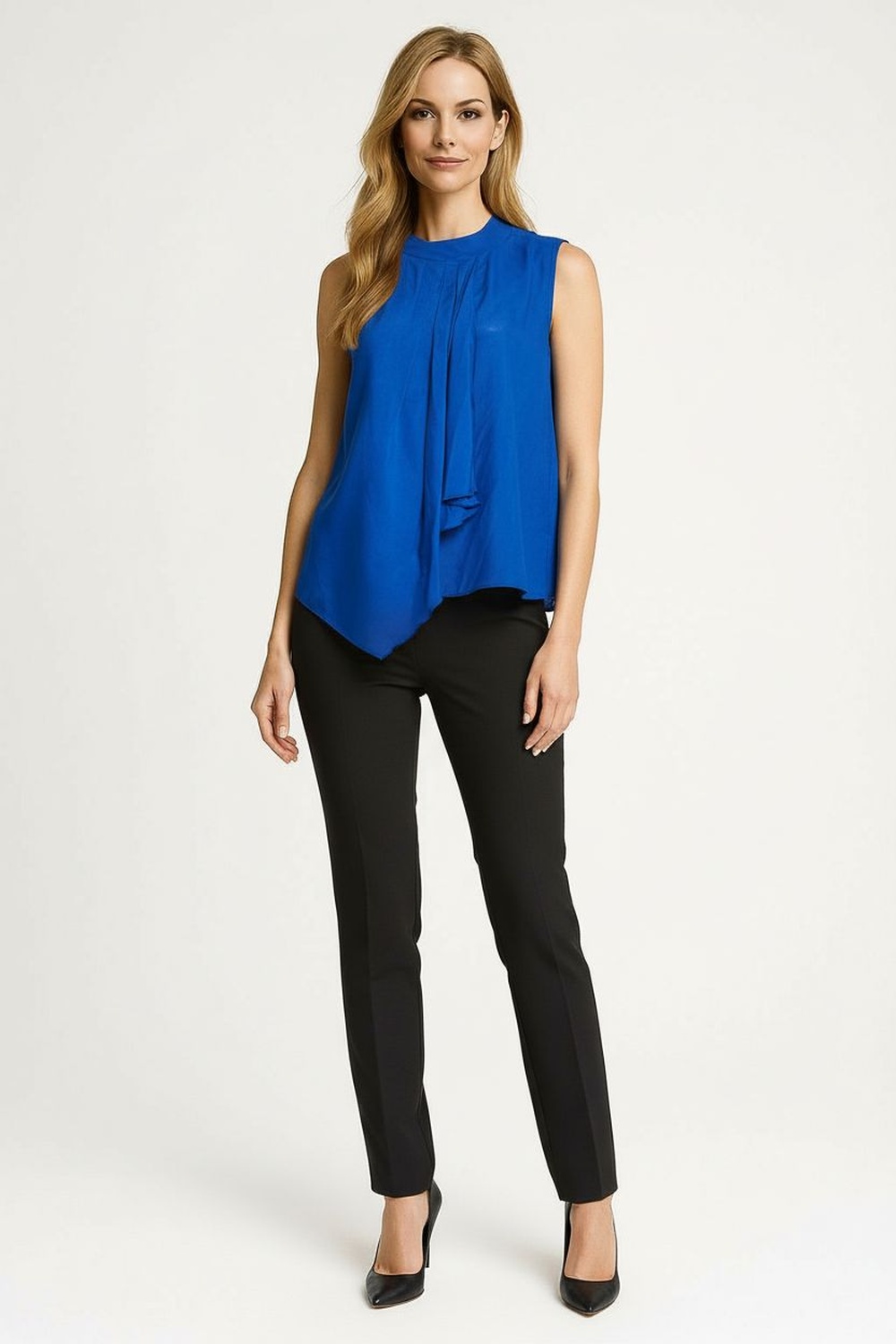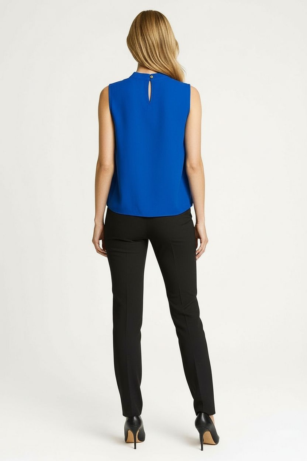 Blusa sin manga cuello alto ligero pliegues frontales ajuste recto caída fluida cierre posterior discreto