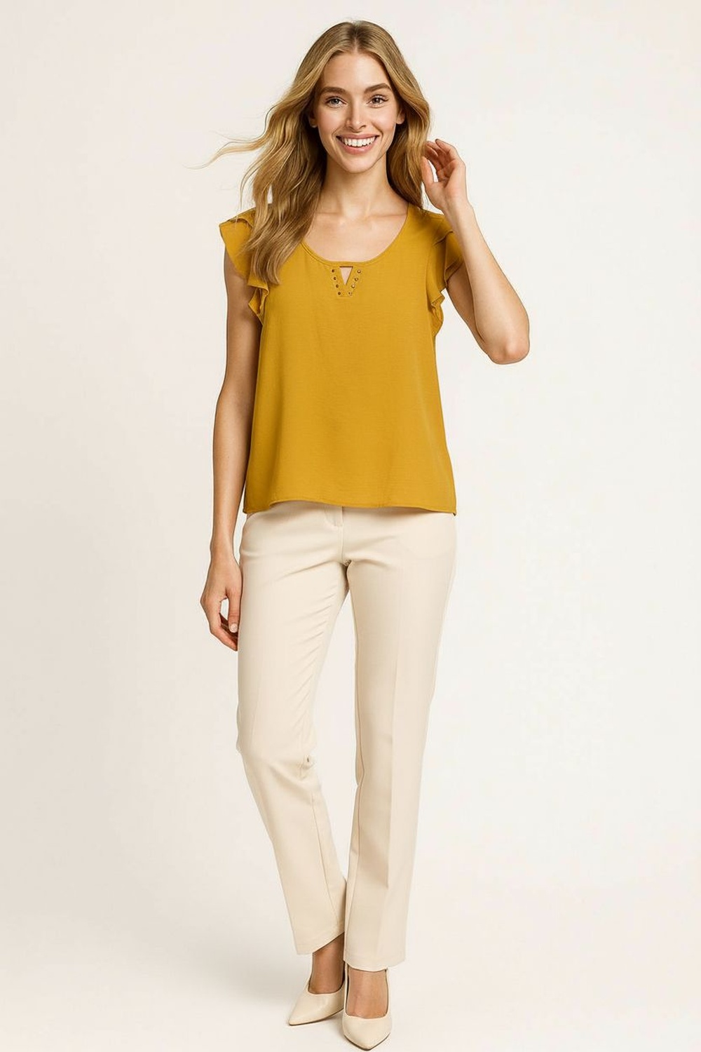 Blusa de manga corta con olanes discretos en los hombros que aportan un detalle femenino, escote redondo con abertura en V adornada con estoperoles metálicos que realzan el diseño, corte recto que favorece la silueta y brinda comodidad, confeccionada en tela ligera de textura suave que ofrece frescura y movimiento, ideal para outfits casuales o de oficina en temporada