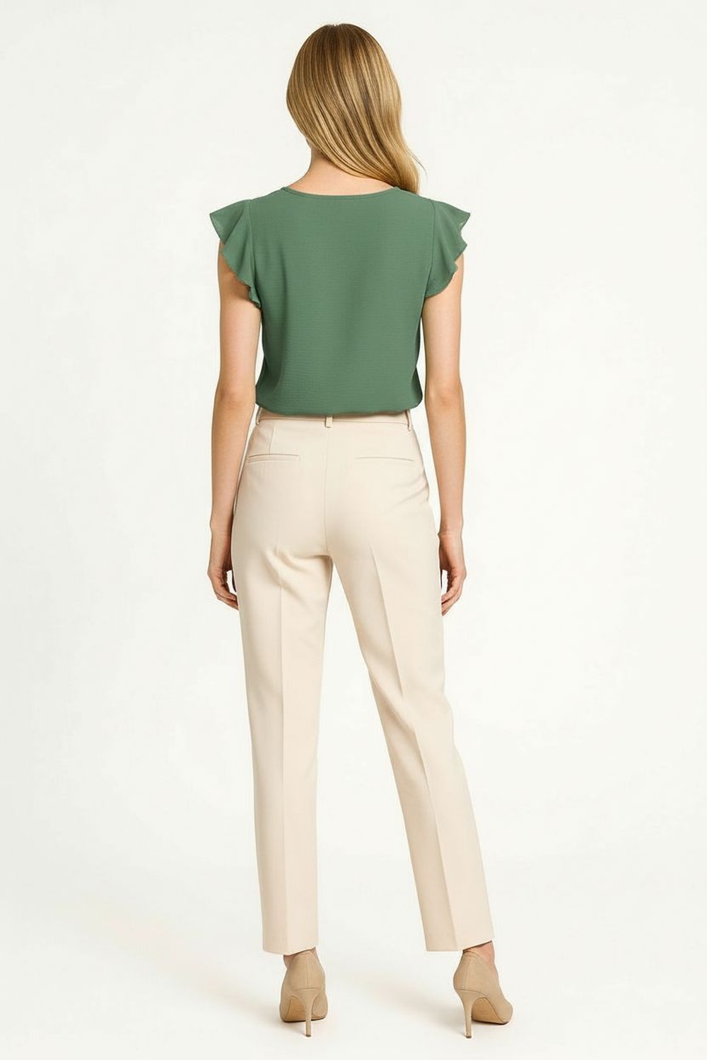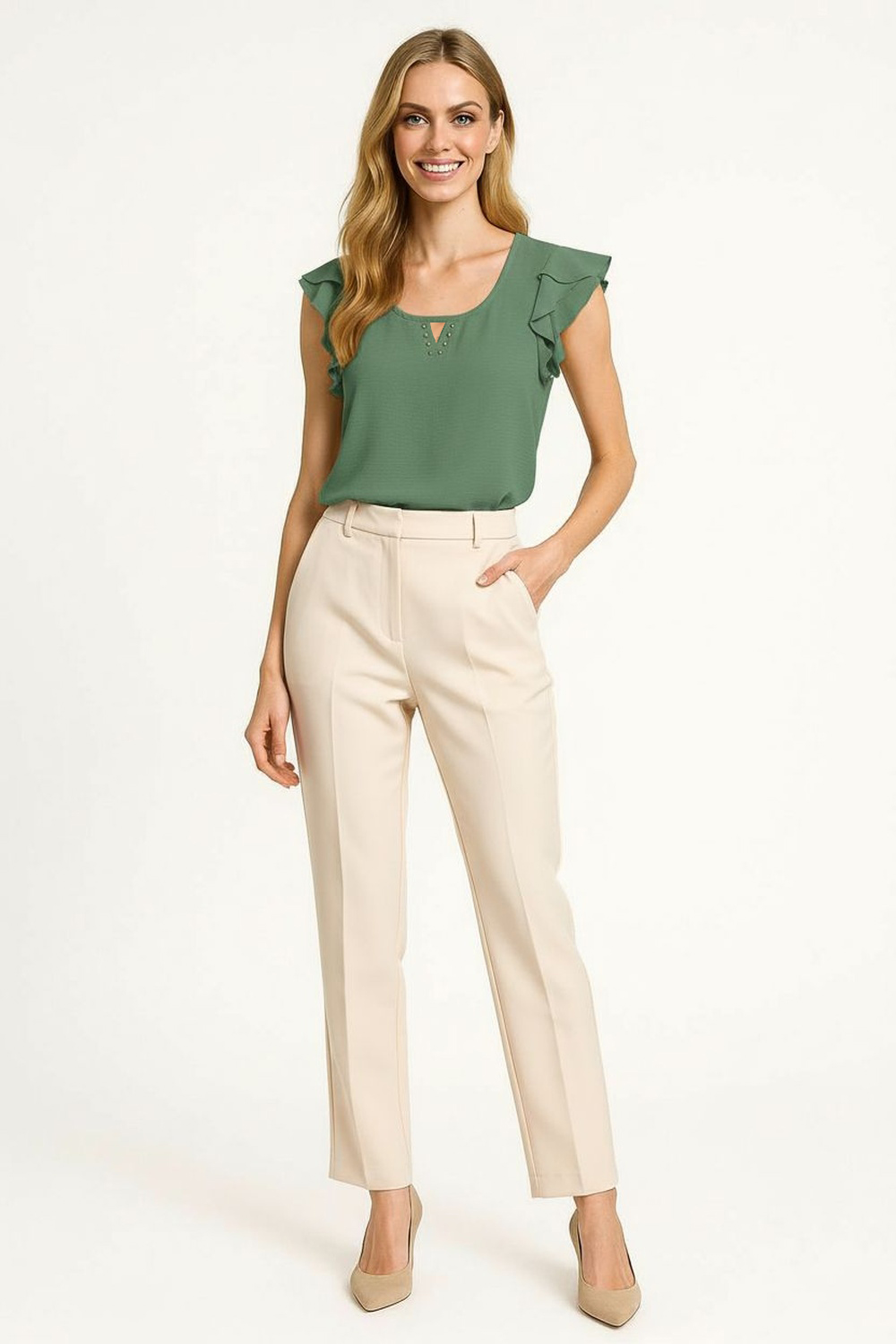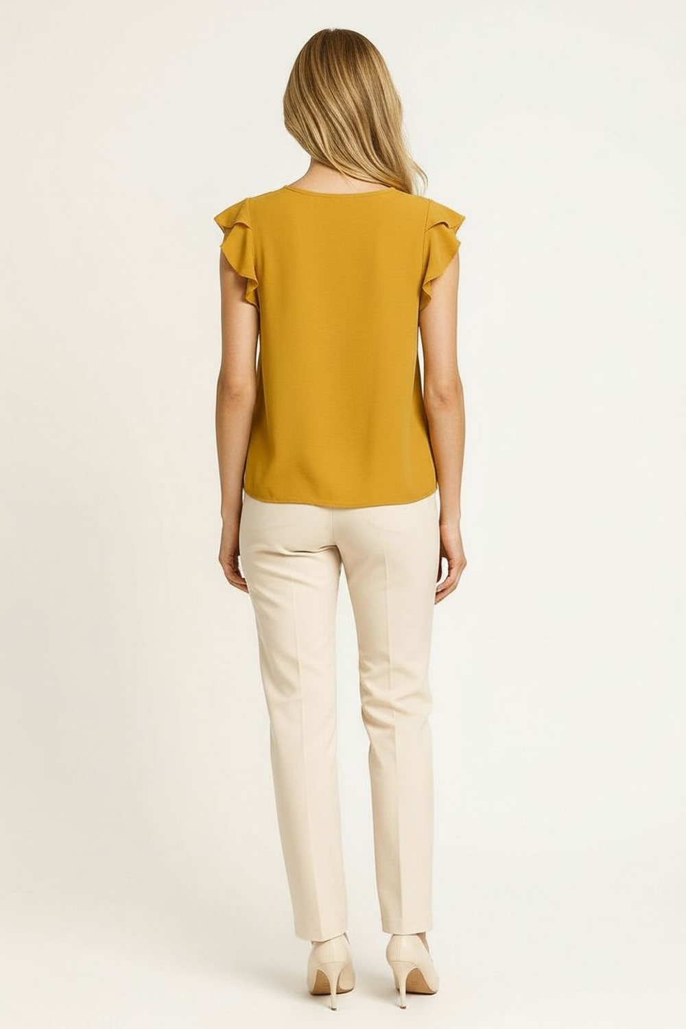 Blusa sin mangas con olanes delicados en los hombros que aportan volumen y feminidad, escote redondo con abertura frontal en forma de gota y detalle trenzado que realza el diseño, corte recto que favorece la silueta y brinda comodidad, confeccionada en tela ligera con textura suave que ofrece frescura y libertad de movimiento, ideal para outfits casuales o combinaciones de oficina de temporada
