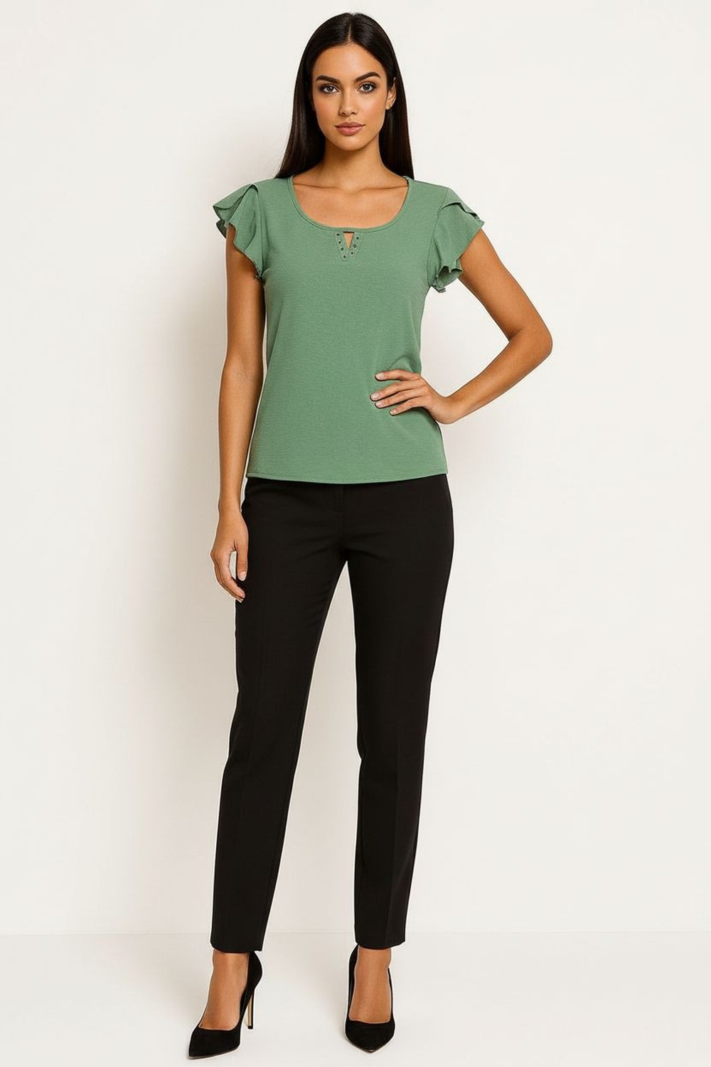 Blusa de silueta recta con escote en forma de gota y aplicaciones metálicas funcionales al frente, manga corta con caída ligera que permite movilidad, estructura cómoda para uso diario, confección en tejido suave de tacto ligero, largo estándar a la cadera