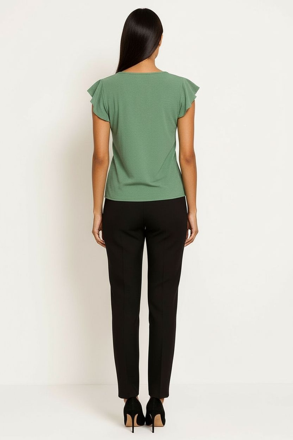 Blusa de corte recto con escote redondo y abertura frontal discreta, detalle de trenza integrada en el contorno del escote que aporta textura, manga corta con terminación amplia que brinda movimiento, confección en tejido ligero con caída suave, largo a la cadera con acabado recto