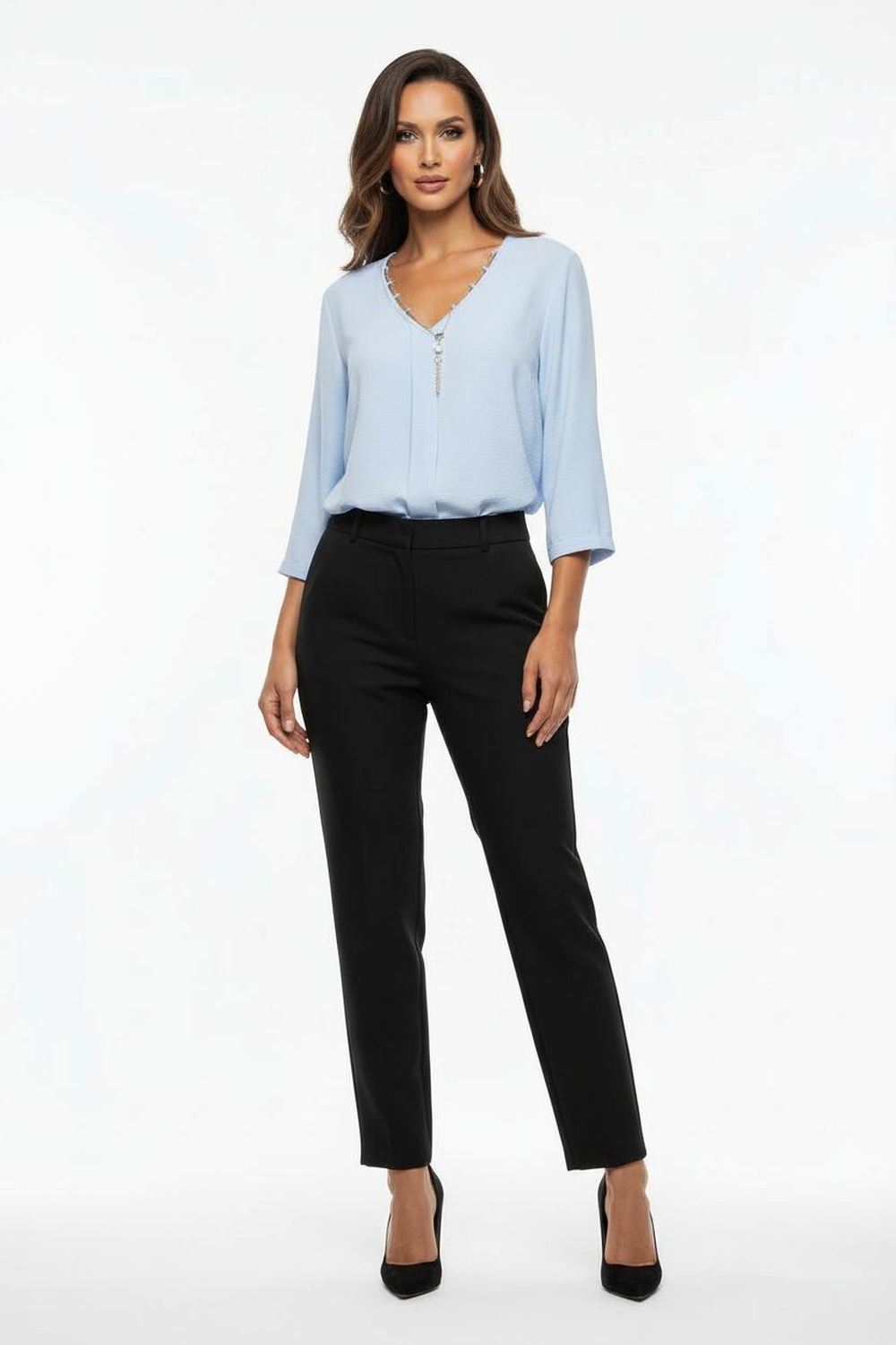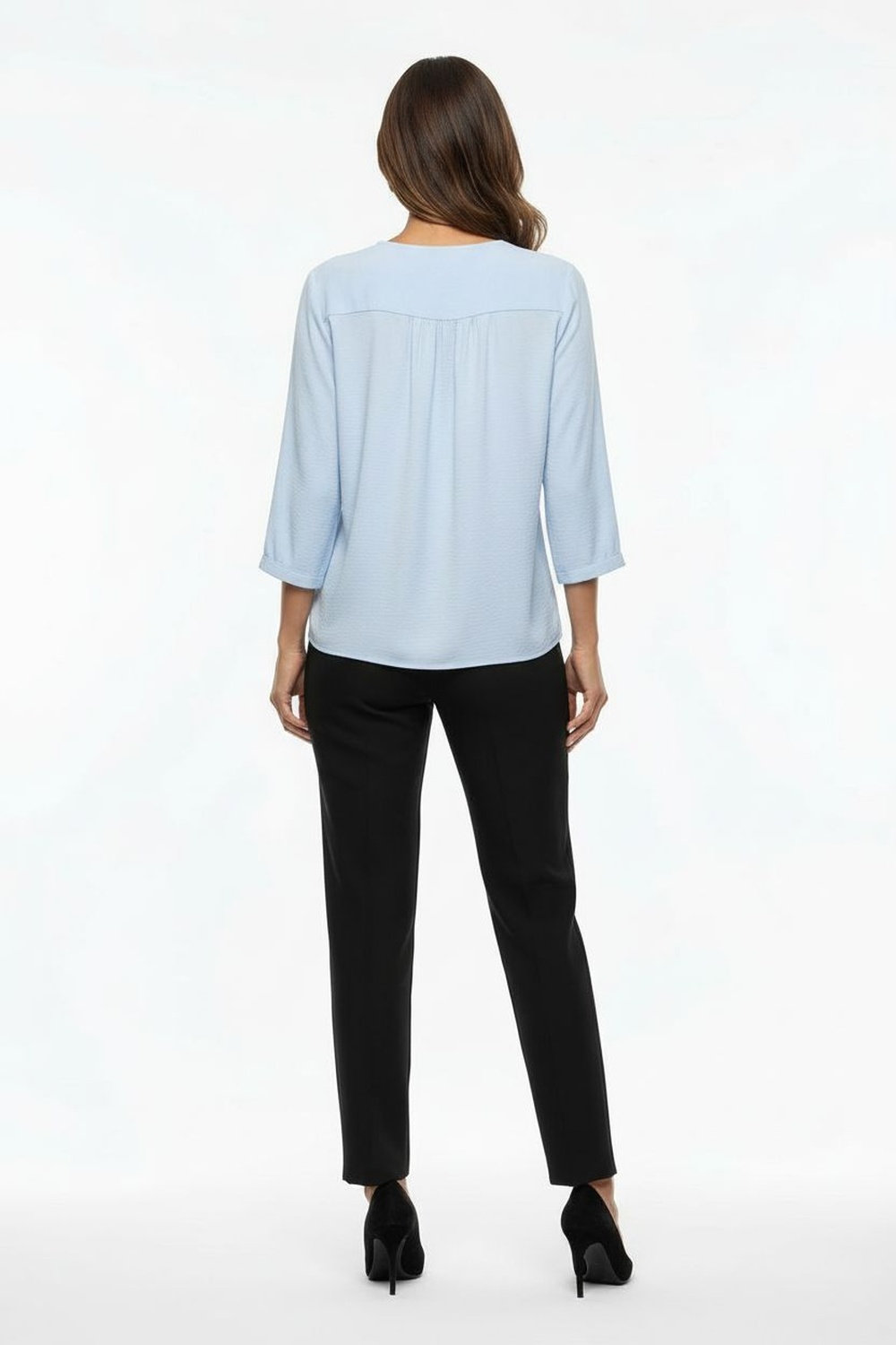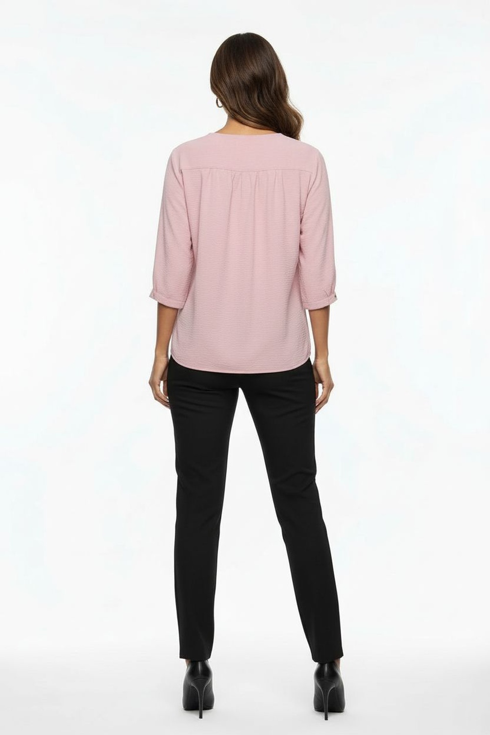 Blusa con escote en v, manga tres cuartos, estructura ligera, caída recta, detalle decorativo en escote, acabado suave