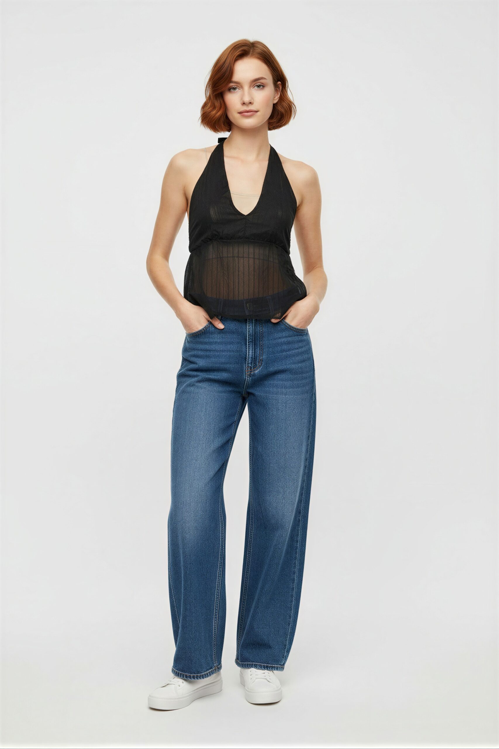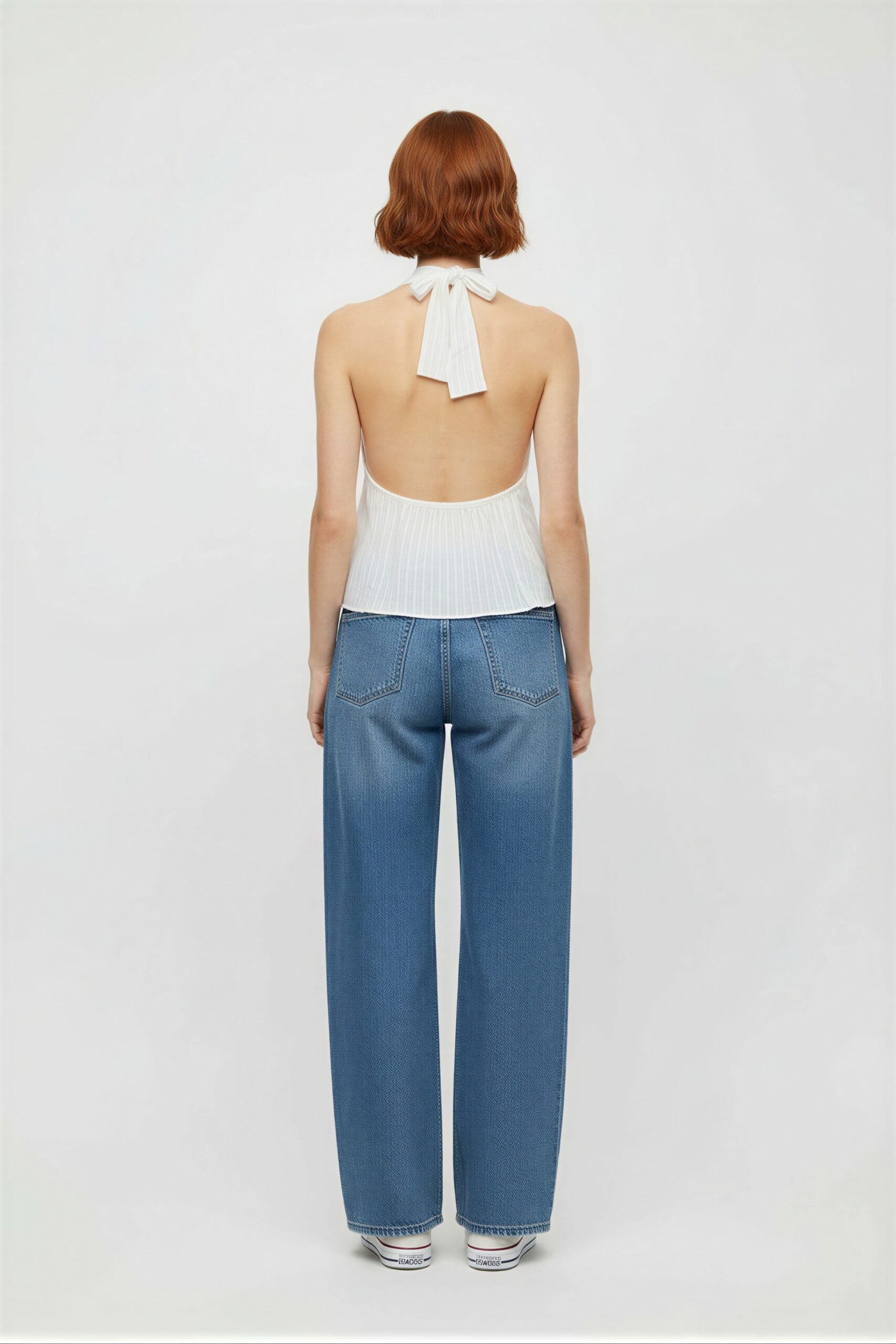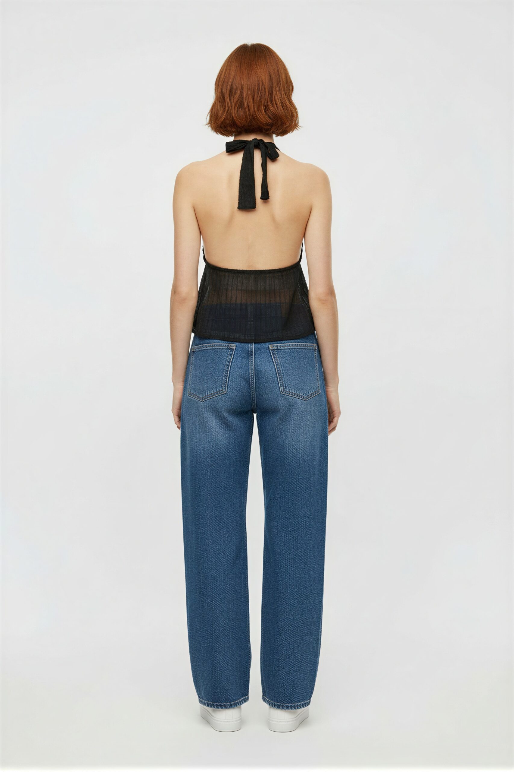 Blusa tipo halter con escote profundo, ajuste al cuello con lazo posterior, estructura ligera, caída suave, terminado con vuelo en el bajo