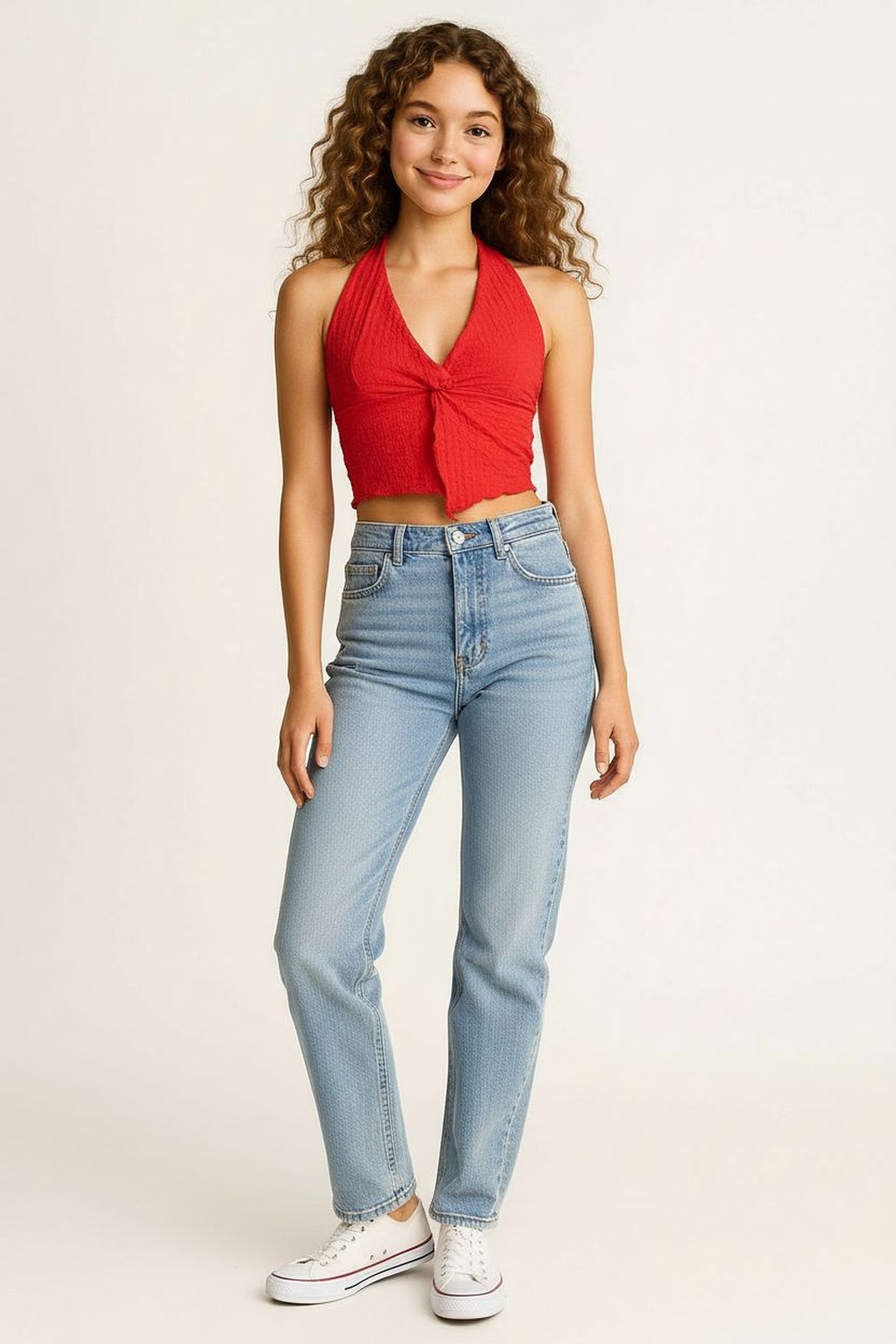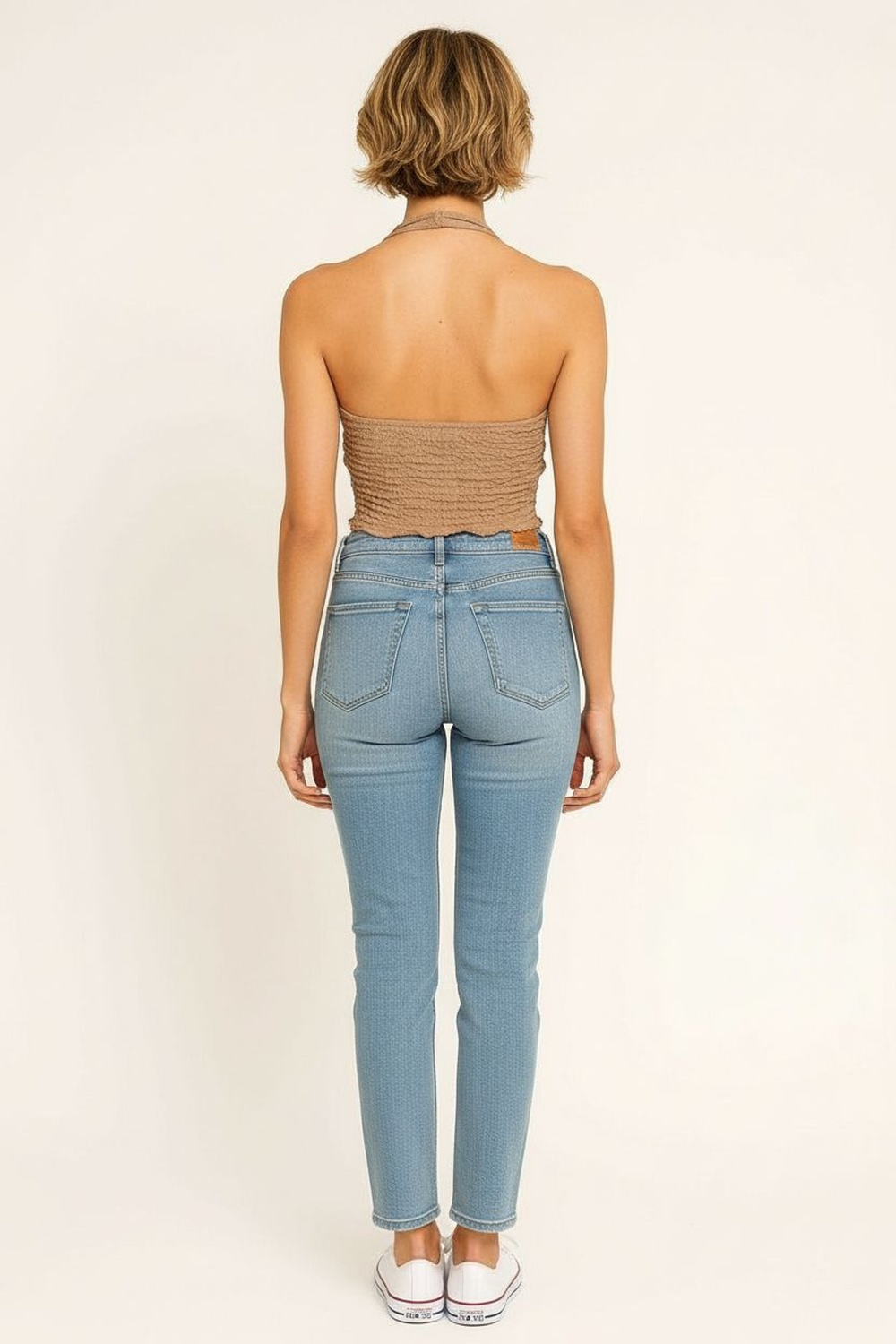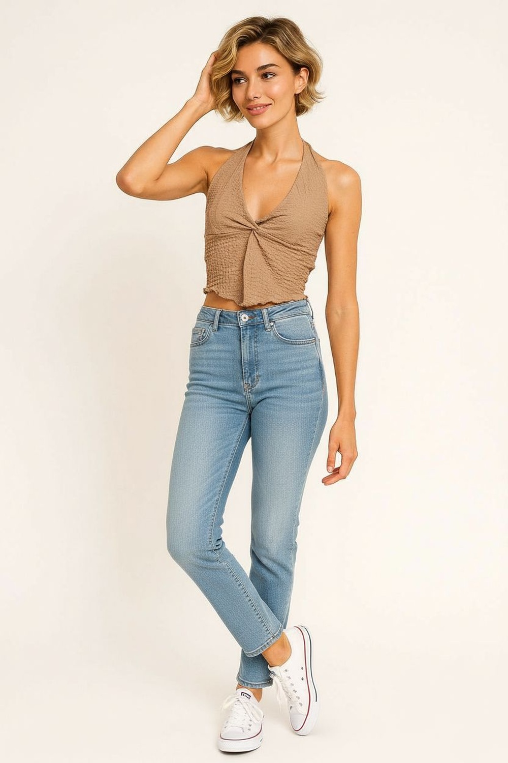 Blusa halter en tela crepón con efecto crunch de textura arrugada, escote profundo al frente que aporta diseño atractivo, amarre en cuello y espalda descubierta que estiliza la parte superior, terminación en pico irregular en el ruedo que agrega movimiento y caída ligera al conjunto