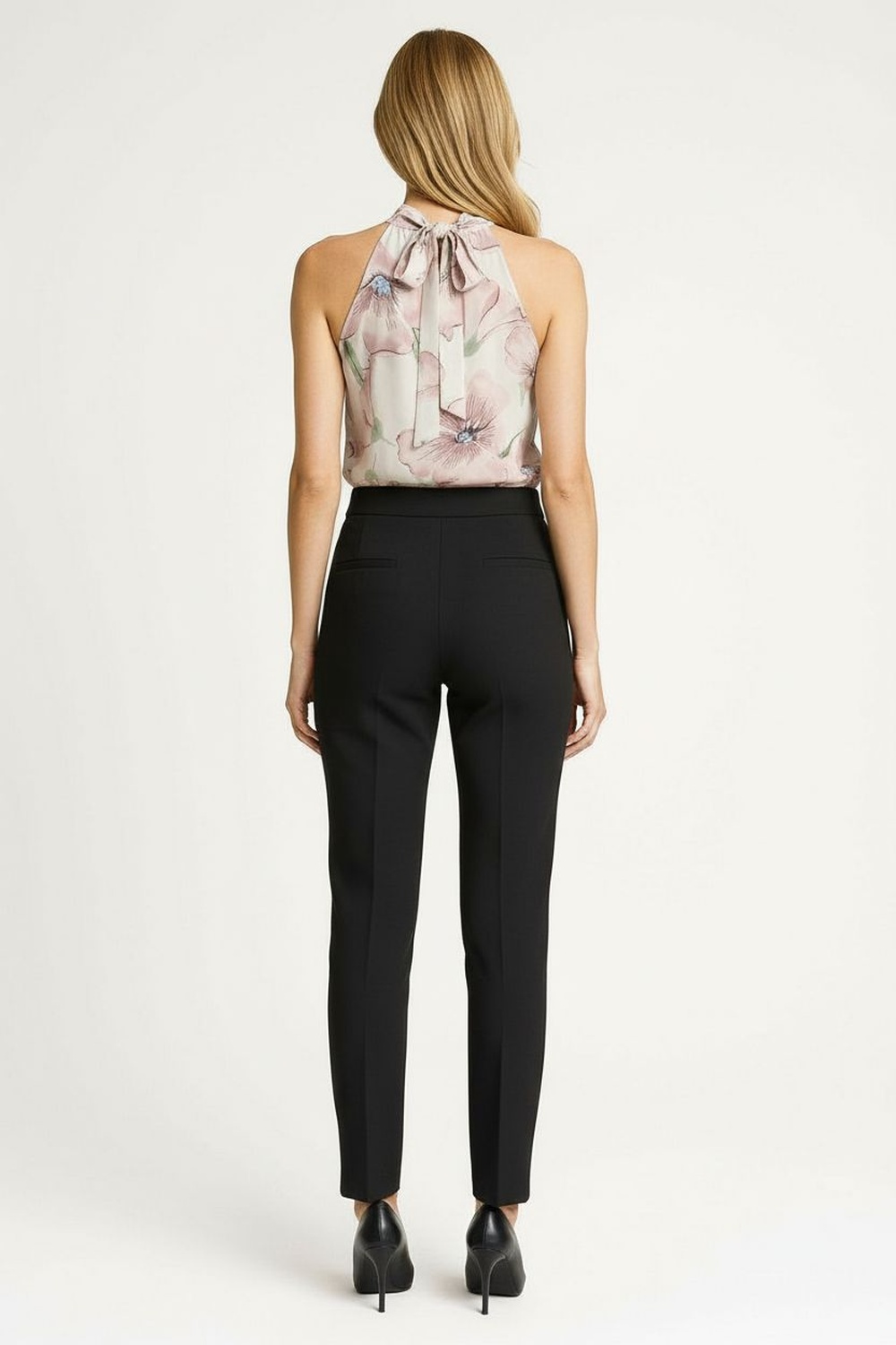 Blusa tipo halter, cuello alto con amarre posterior en lazo, espalda abierta, corte recto con caída ligera, confección suave de ajuste cómodo