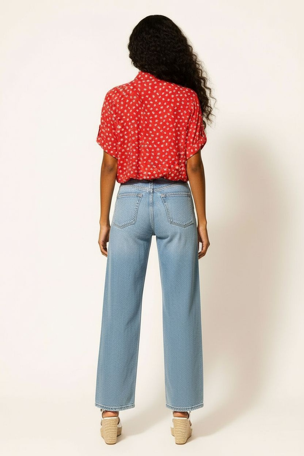 Blusa de cuello camisero con botonadura frontal y manga corta amplia, jareta ajustable en la parte baja que permite regular el ajuste a la cintura, corte recto con largo a la cadera que aporta comodidad, confección en tela ligera de tacto suave que favorece la frescura y libertad de movimiento
