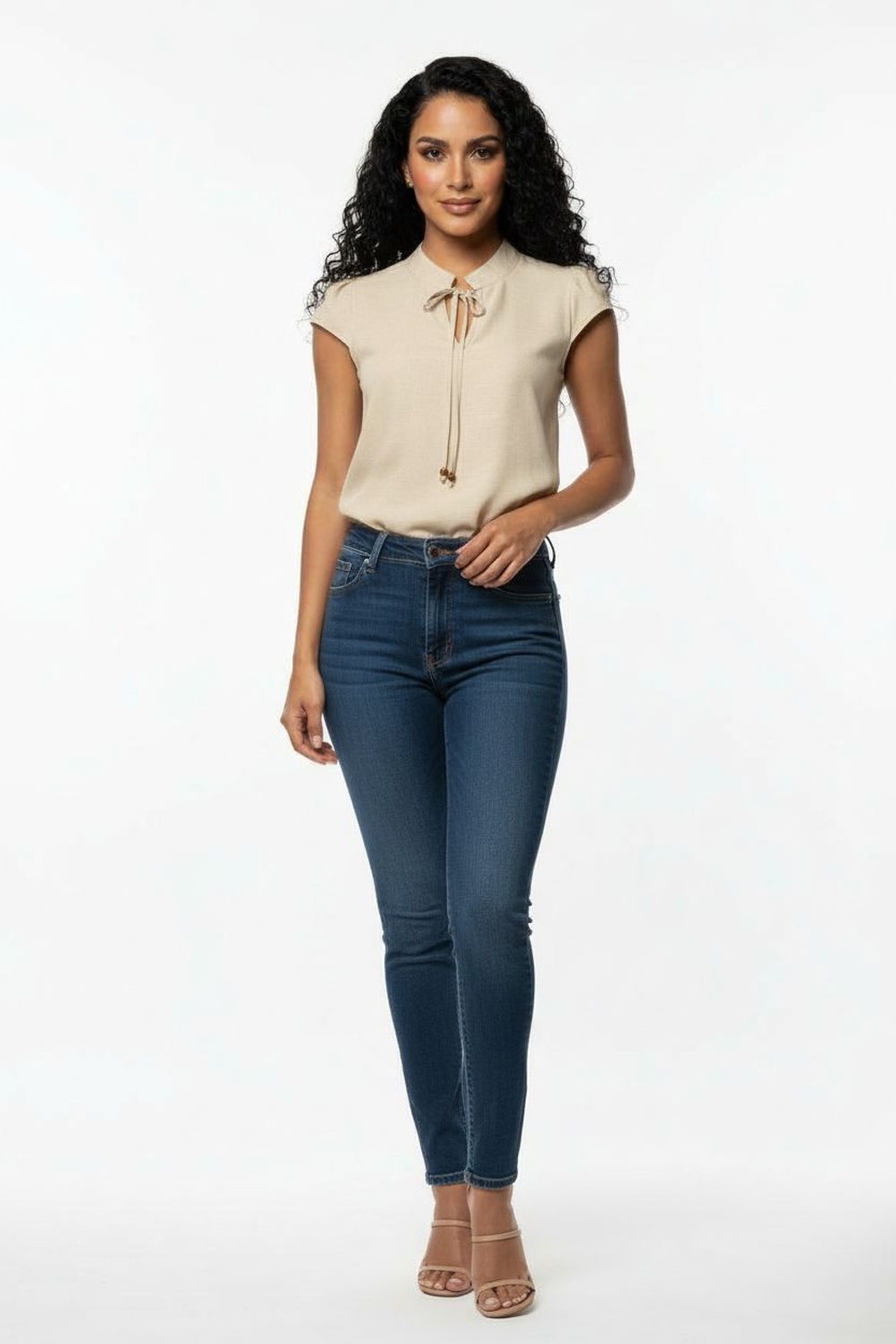 Blusa jareta con cuello alto, abertura frontal con lazo ajustable, manga corta con ligero volumen, caída recta, terminación lisa