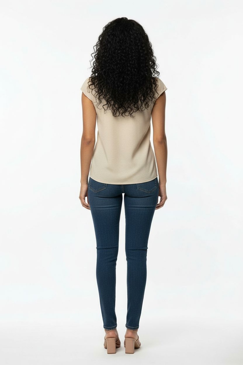 Blusa sin manga con escote en v, botonadura parcial al frente, detalle de olan en hombros, caída ligera, corte recto
