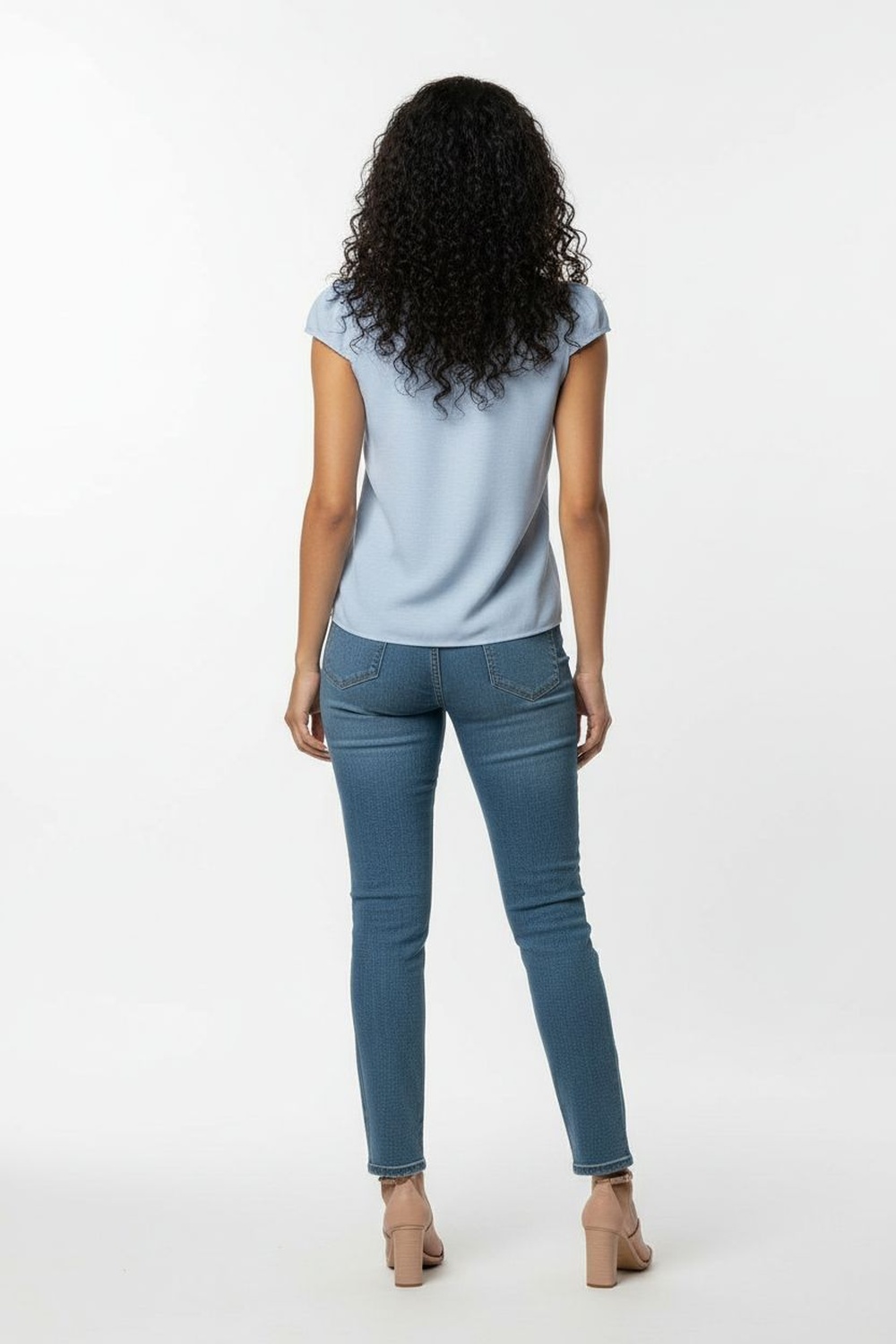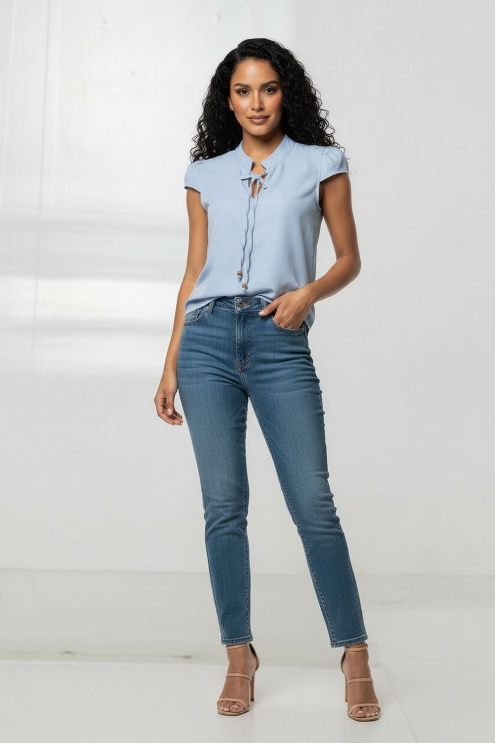 Blusa sin mangas con olanes en hombros, cuello alto con lazo frontal, corte recto con caída ligera en torso, confección suave de ajuste cómodo