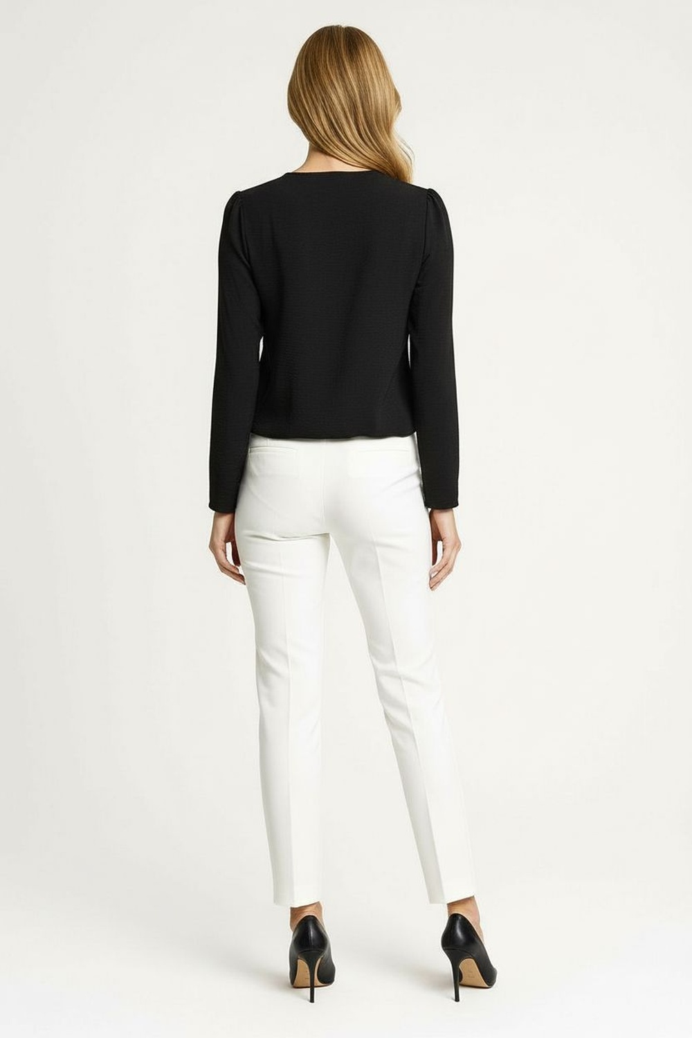 Blusa de manga larga con escote en V y diseño con olanes verticales al frente, silueta semiajustada que aporta estructura sin rigidez, largo a la cadera que permite uso versátil, confección en tejido ligero con textura sutil y caída natural