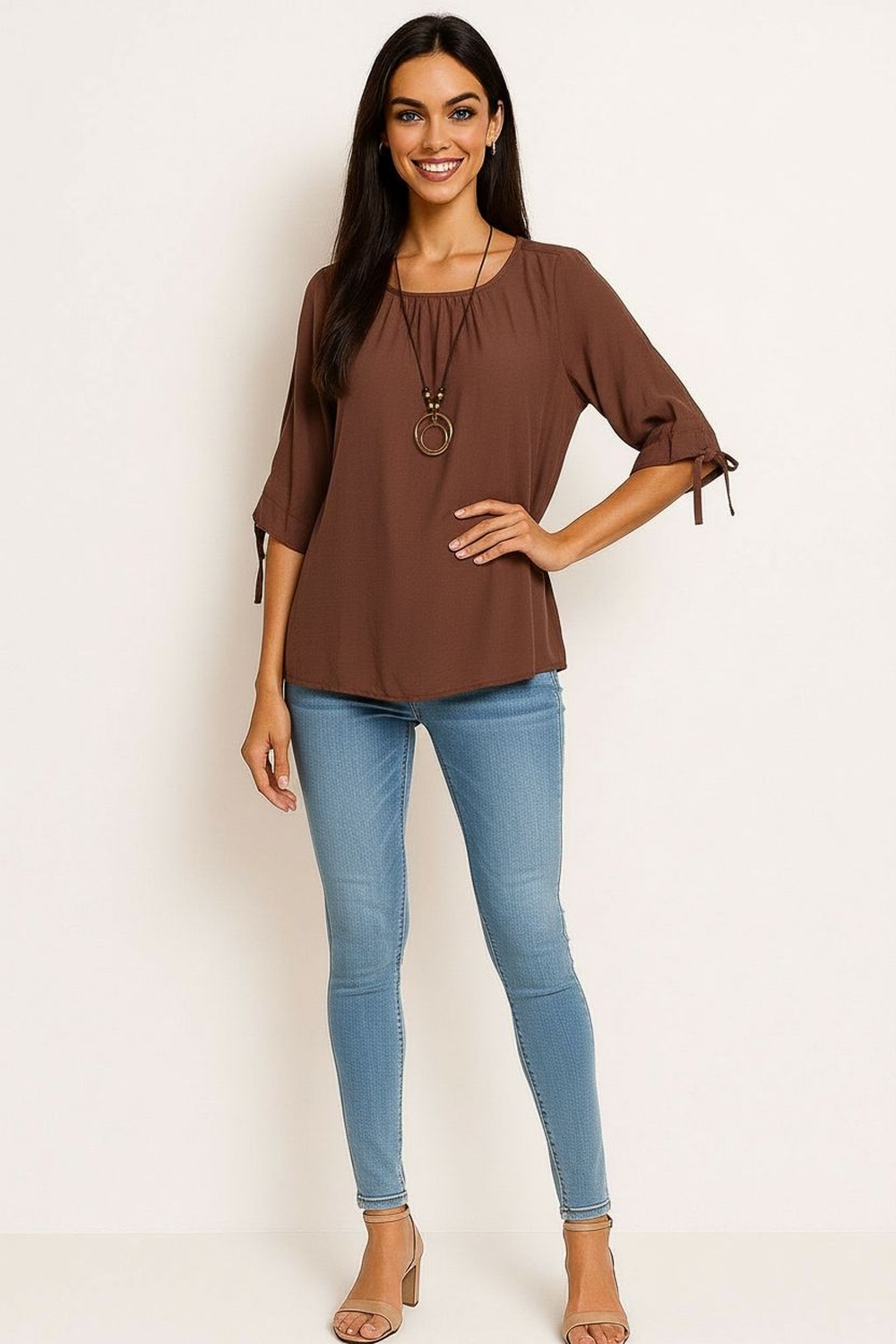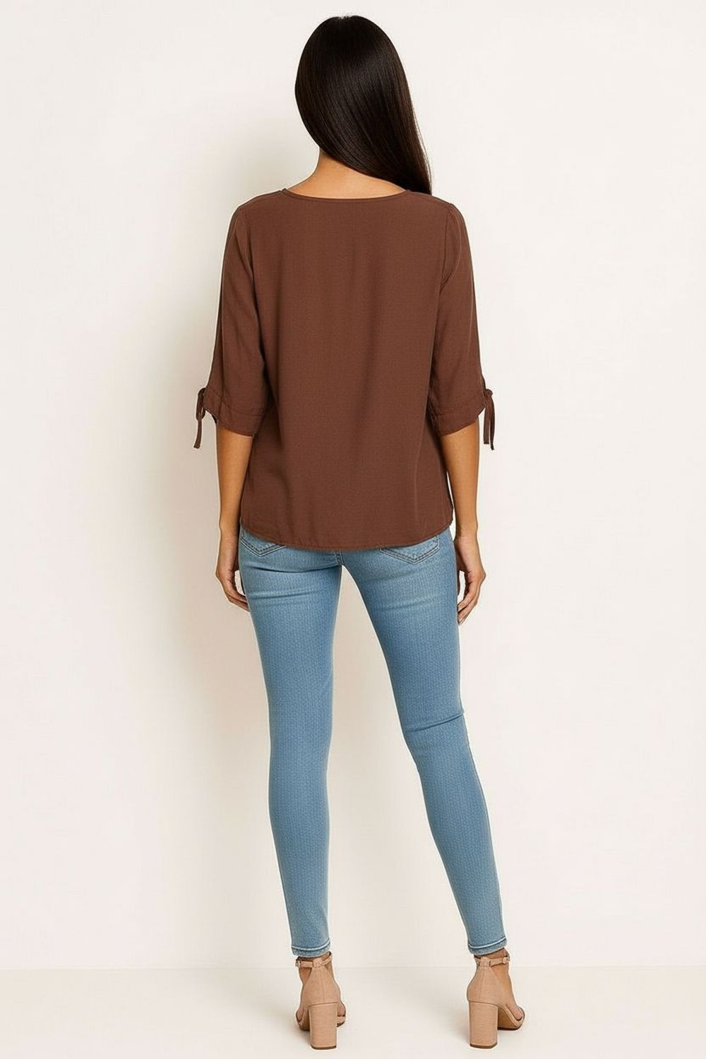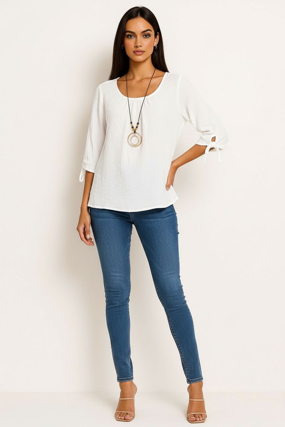 Blusa de corte recto con jaretas funcionales en escote que permiten ajuste personalizado, manga corta de caída relajada que brinda comodidad, largo a la cadera que facilita el uso diario, confección ligera con textura suave al tacto