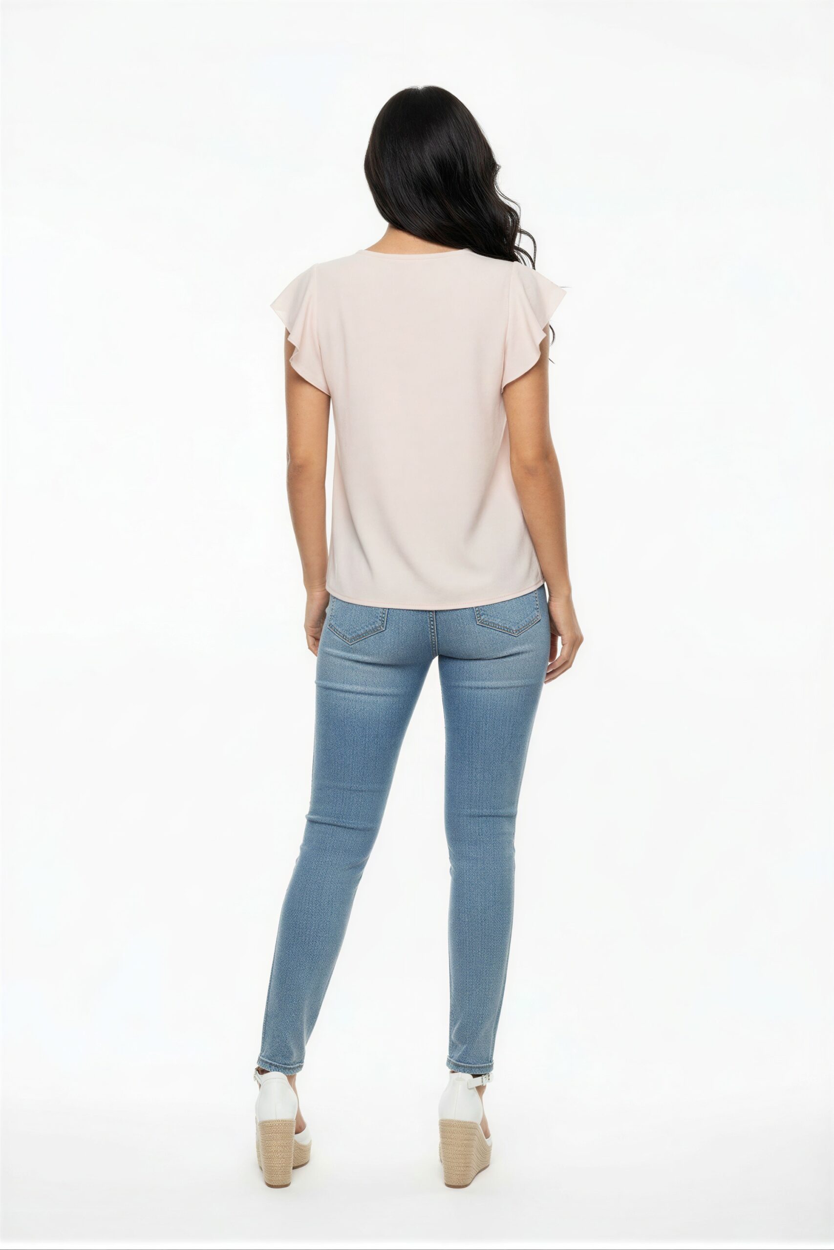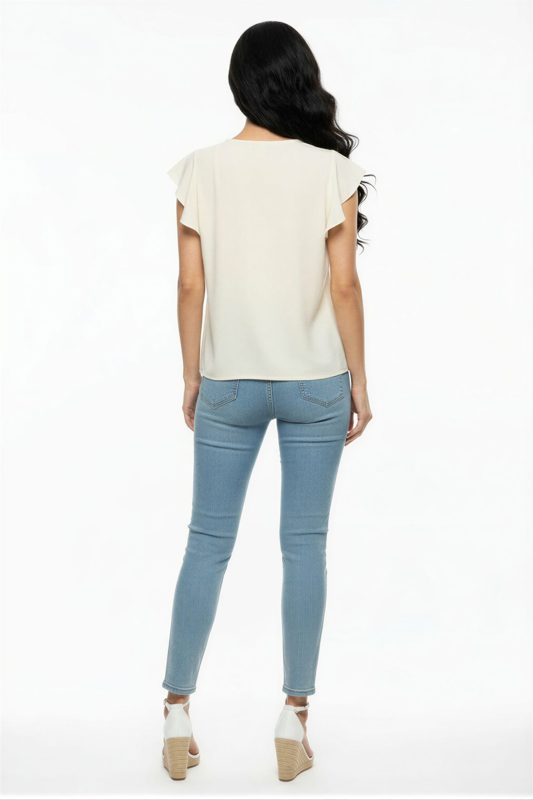Blusa con cuello redondo y abertura frontal, manga corta con olan ligero, corte recto, caída ligera, ajuste cómodo