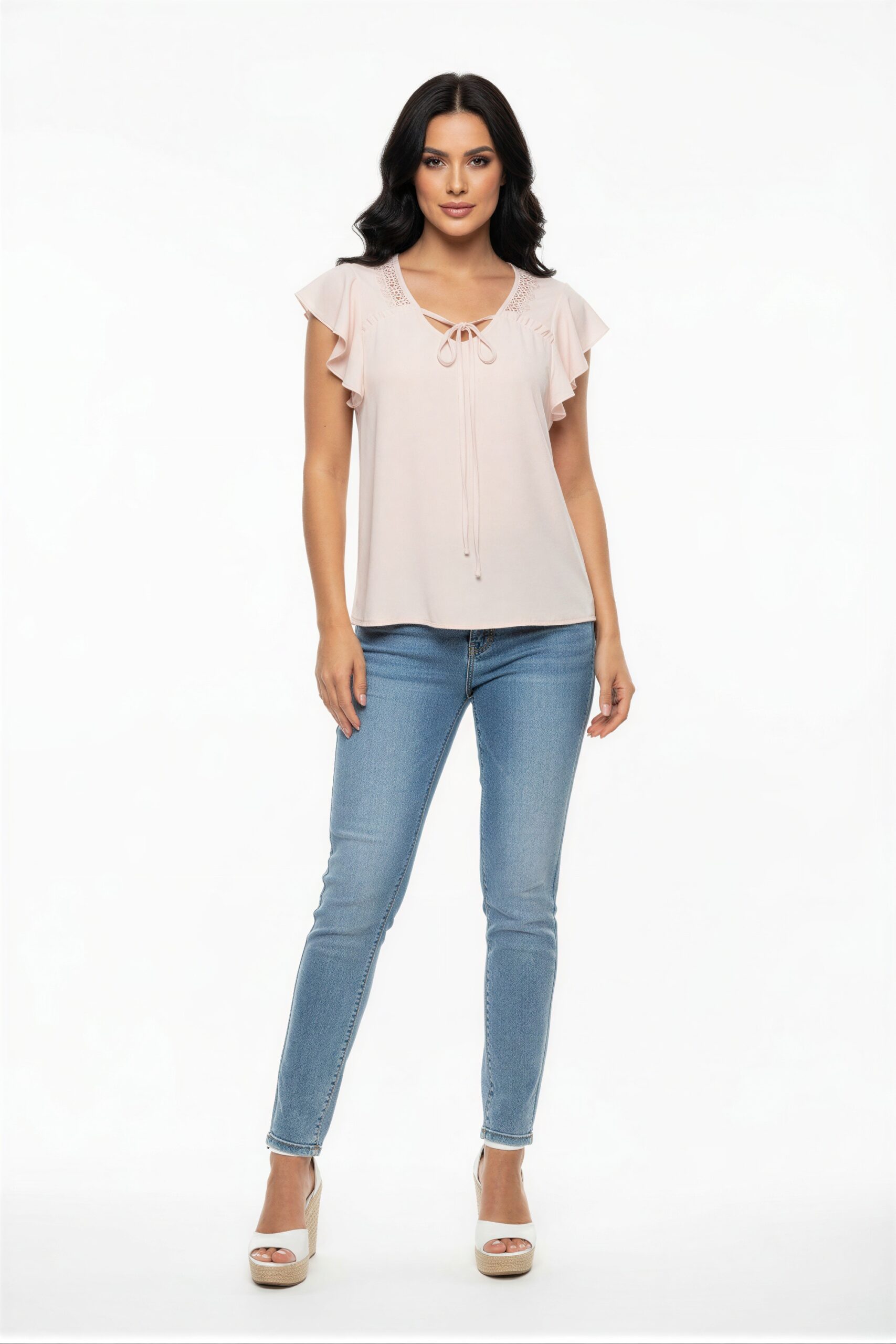 Blusa con lazo ajustable en cuello, manga corta con volumen, detalles decorativos en parte superior, caída ligera, ajuste cómodo