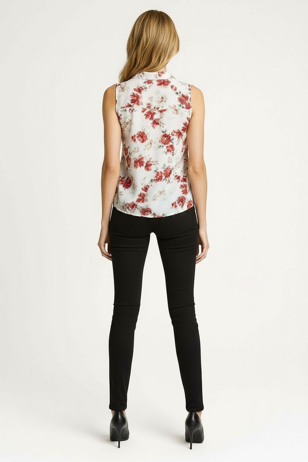 Blusa sin mangas con cuello camisero estructurado y botonadura frontal funcional, corte en línea a que aporta amplitud y caída equilibrada, largo medio que cubre la cadera con movimiento natural, confección ligera con terminaciones limpias que mantienen forma y presentación, diseño práctico con presencia visual definida