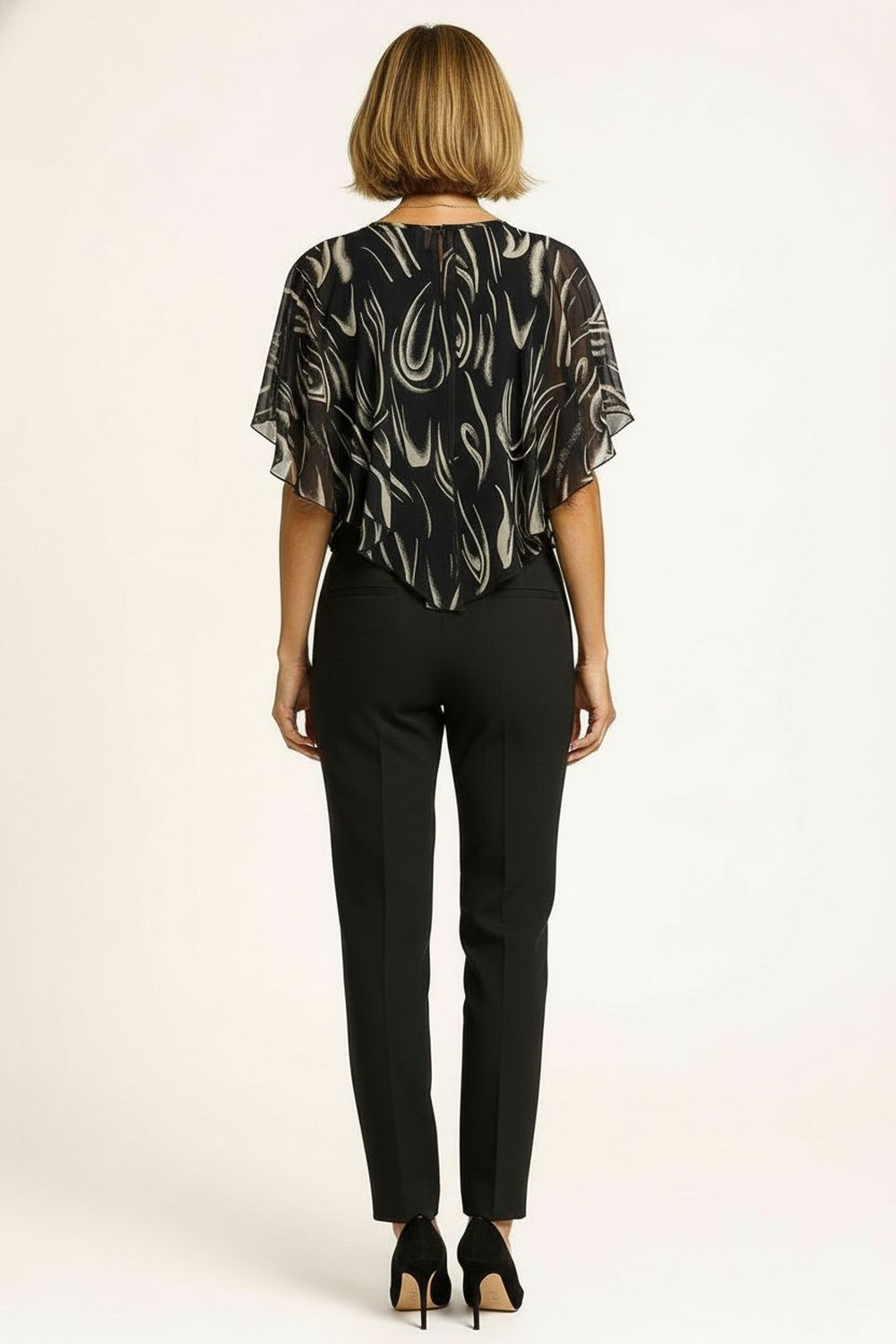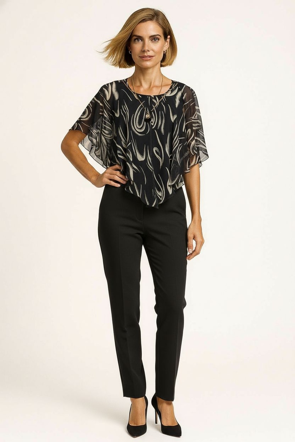 Blusa LORELL de caída suave con capa superior traslúcida y escote redondo, detalle metálico decorativo al frente que aporta un toque sofisticado, mangas amplias con caída fluida que permiten libertad de movimiento, silueta recta que brinda comodidad sin perder elegancia