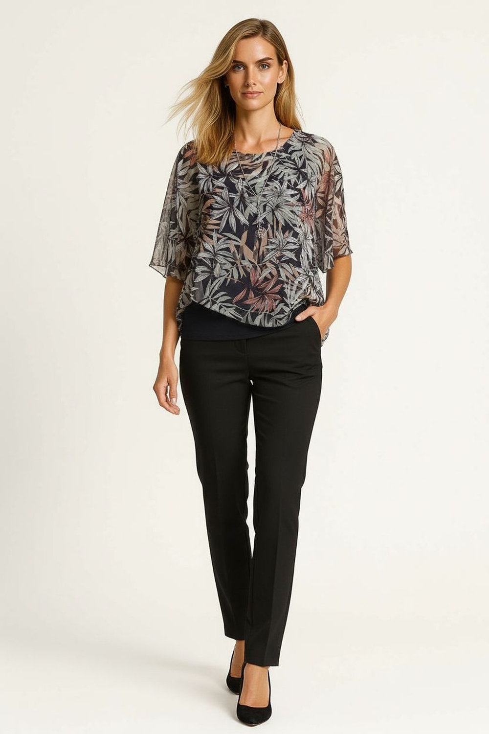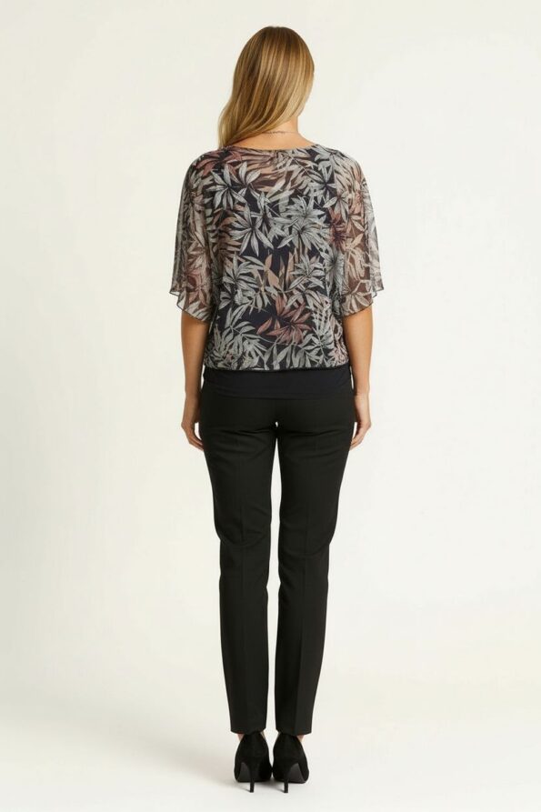 Blusa de corte amplio con caída ligera que aporta comodidad y movimiento, escote redondo con aplicación de collar decorativo que realza el diseño, mangas tres cuartos tipo murciélago que ofrecen amplitud y frescura, parte baja con elástico que define sutilmente la silueta, confeccionada en tejido suave y fluido que garantiza confort durante el día