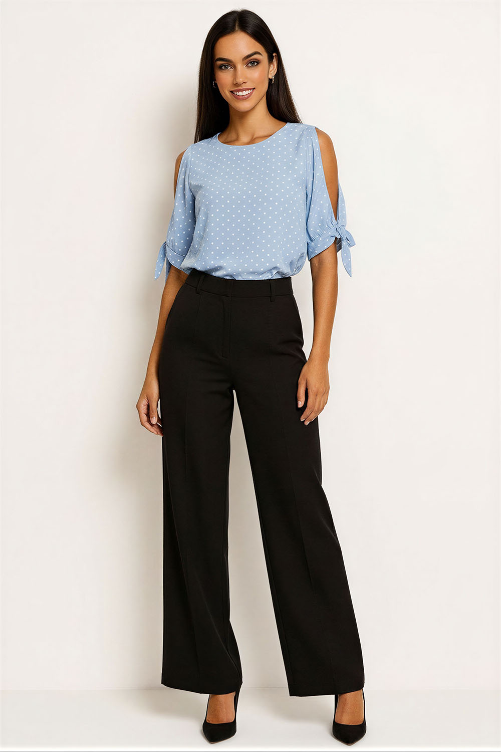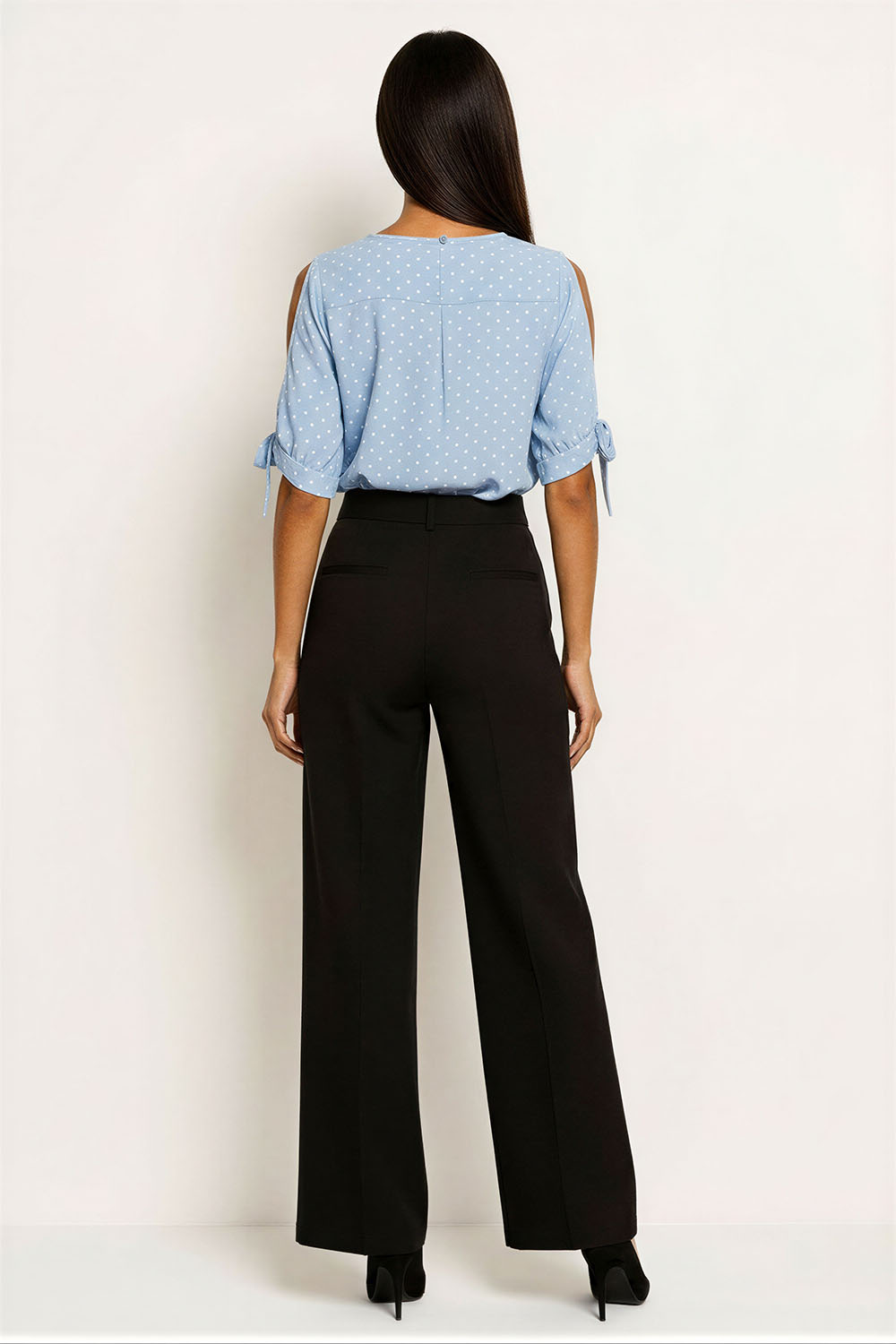 Blusa sin mangas con escote en V tanto al frente como en la espalda que aporta un detalle femenino, hombros decorados con volantes que realzan el diseño, confección en tejido ligero de caída fluida que brinda frescura y comodidad, corte recto que favorece distintas siluetas, acabados cuidados que destacan su estilo moderno