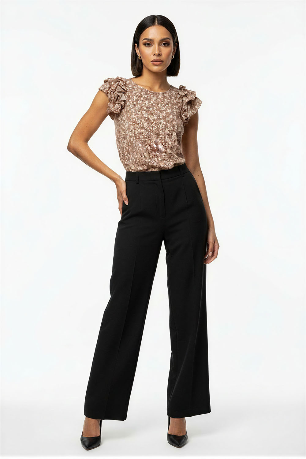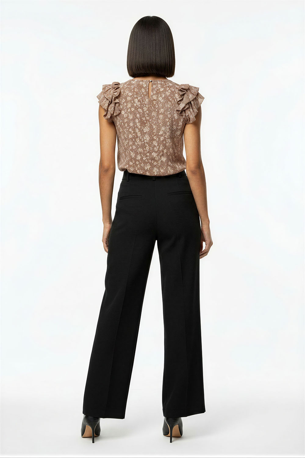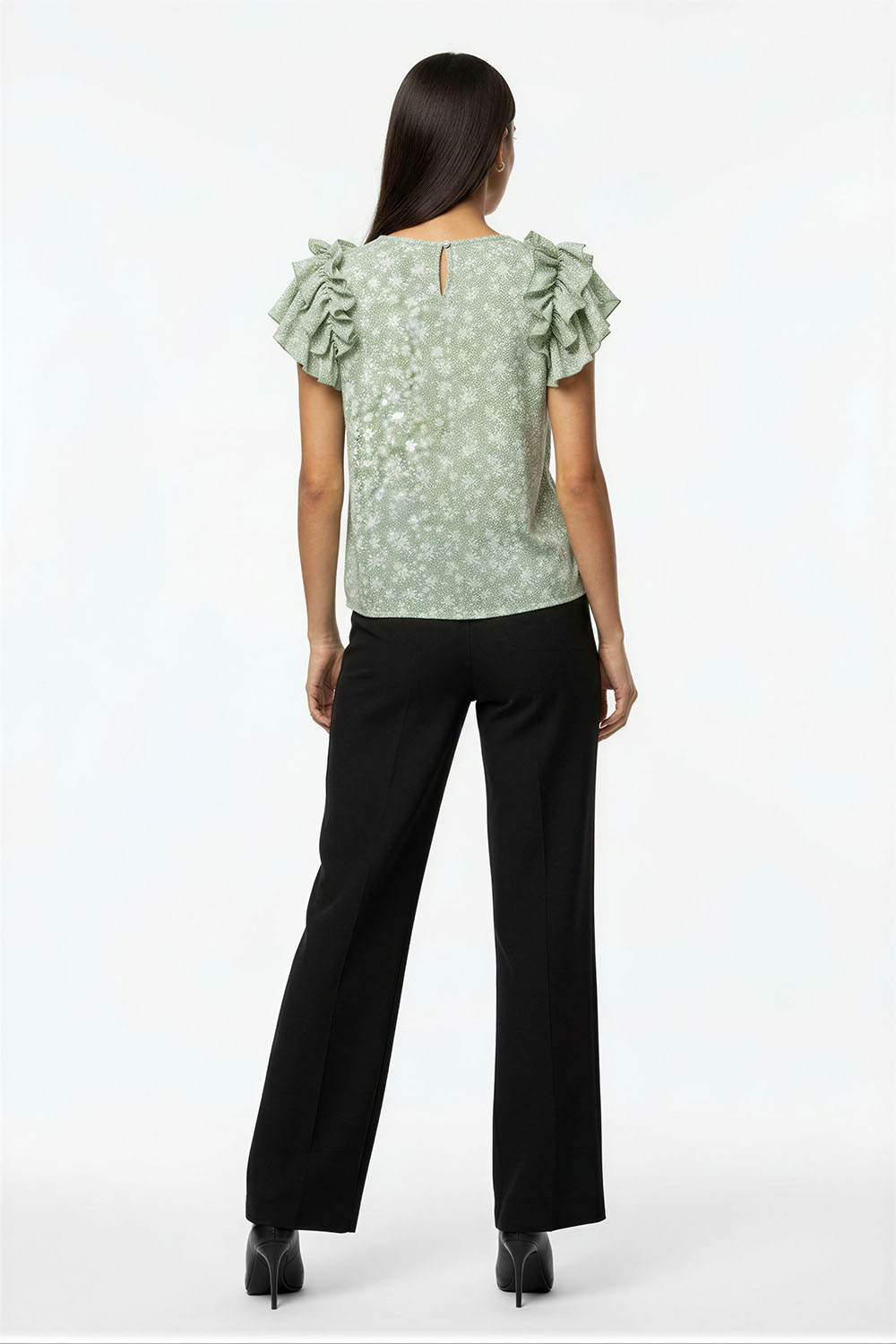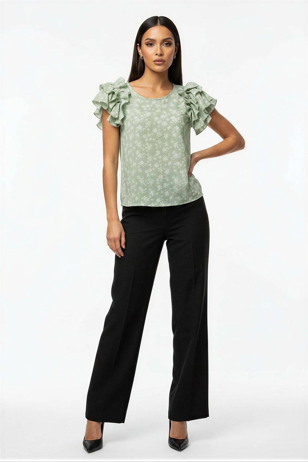 Blusa de corte recto con escote redondo que brinda ajuste cómodo, manga corta con diseño de olanes que aporta volumen y movimiento, confección ligera que favorece la frescura, largo a la cadera que permite libertad de uso, acabado suave al tacto que proporciona comodidad durante el día