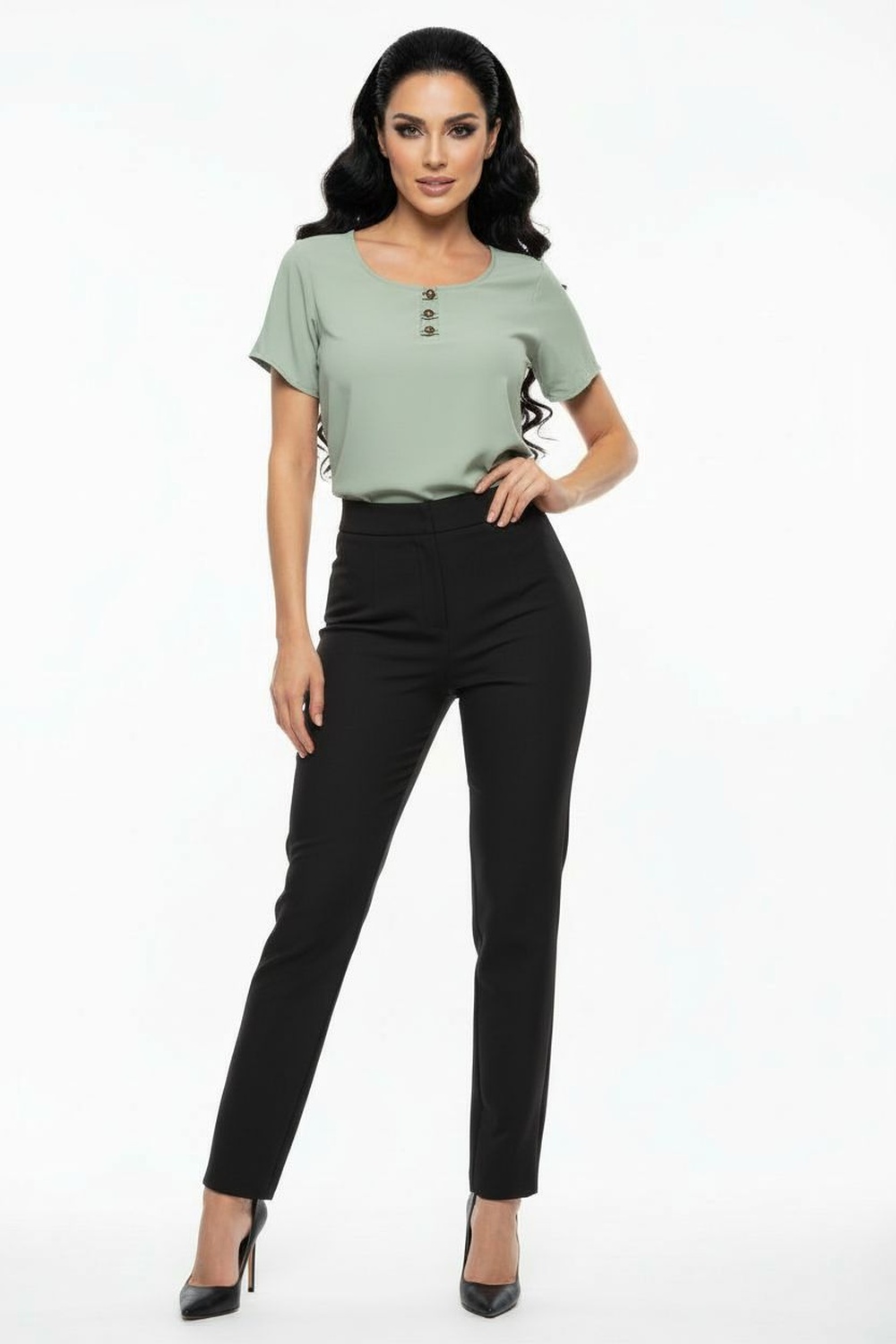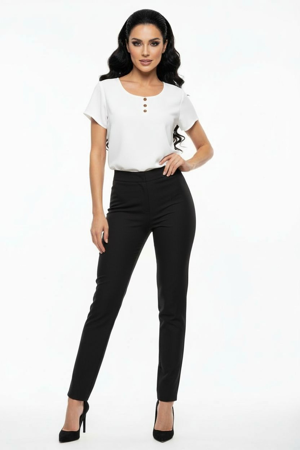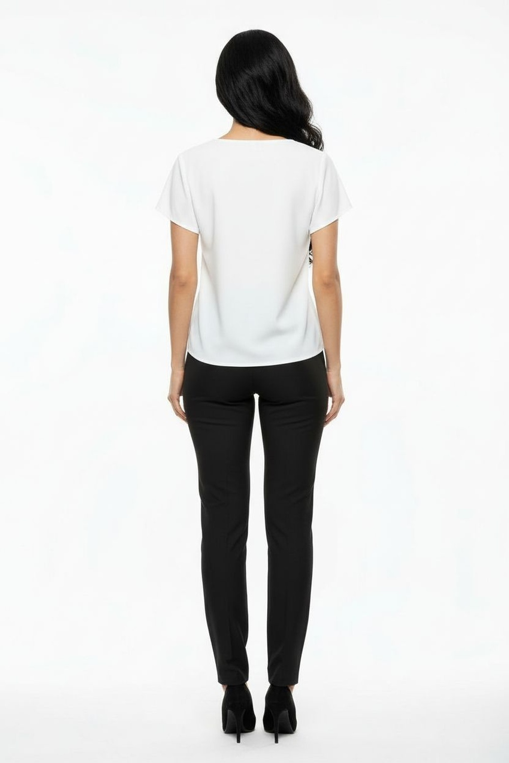 Blusa de manga corta con escote redondo, detalle frontal con aplicación decorativa, textura suave al tacto, caída cómoda para uso diario