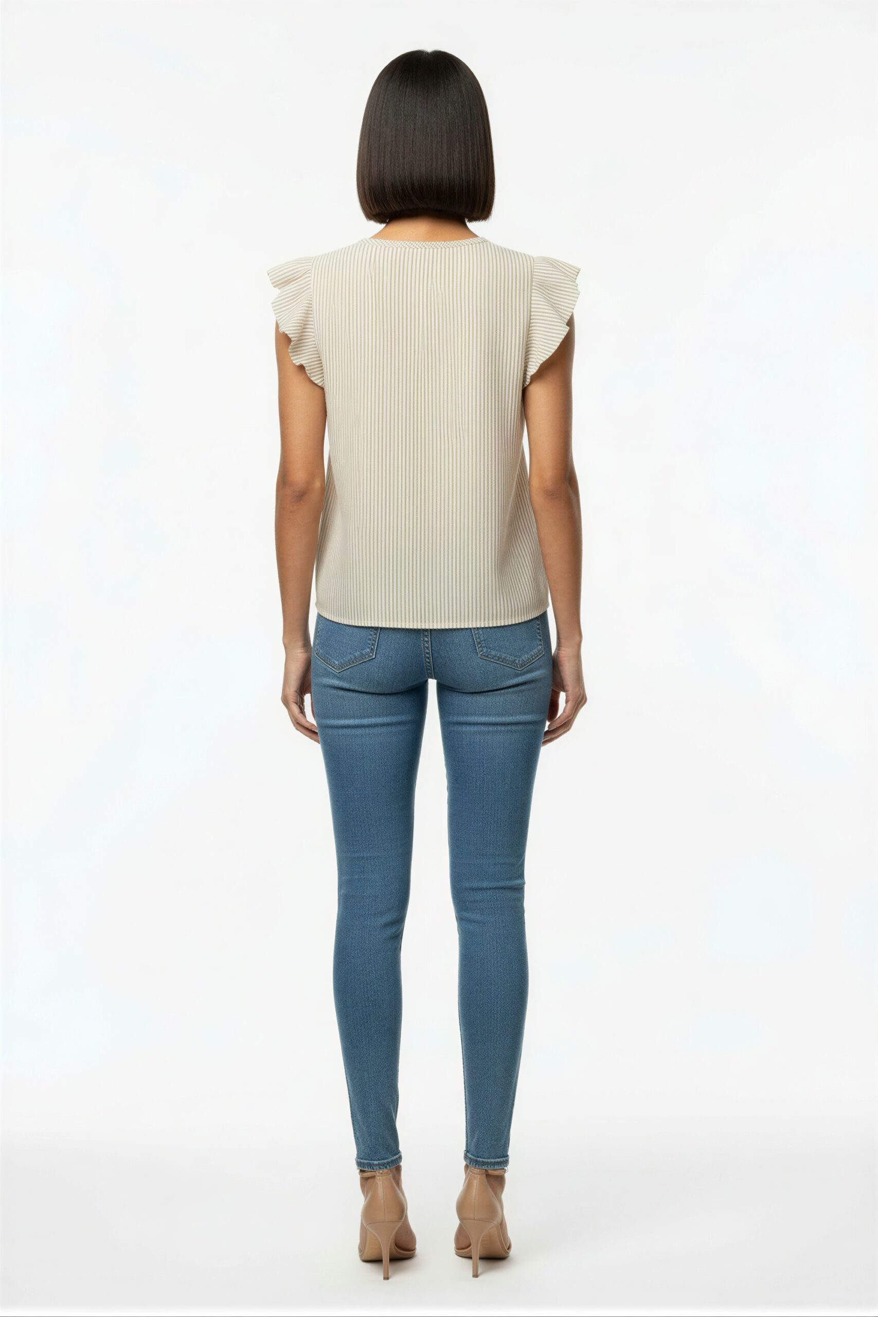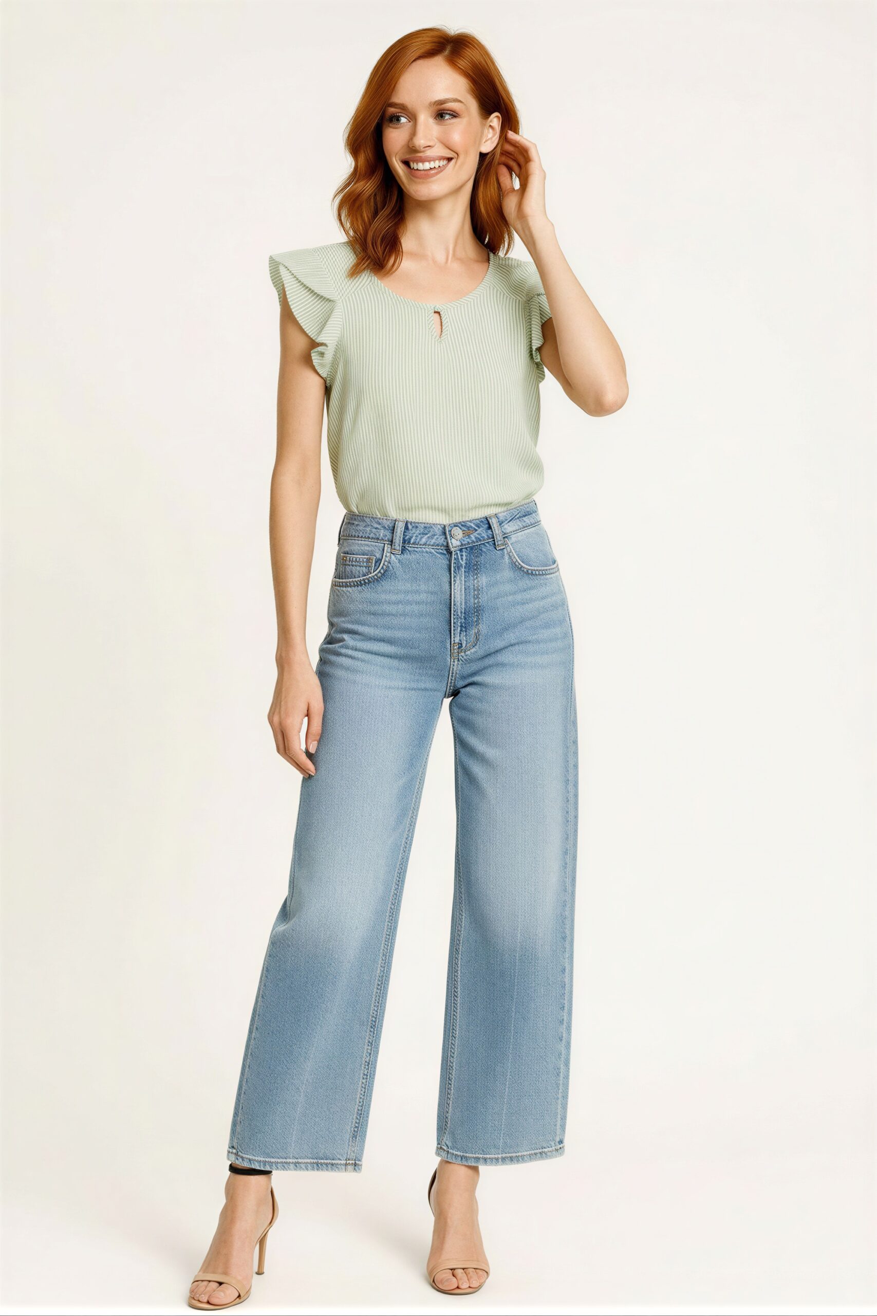 Blusa con cuello redondo y abertura frontal, manga corta con olan ligero, corte recto, caída ligera, ajuste cómodo