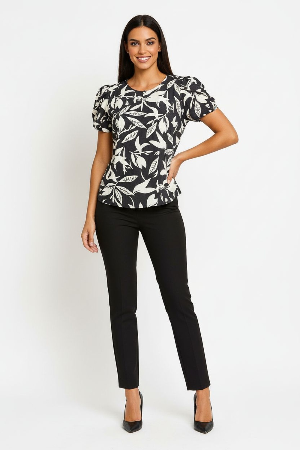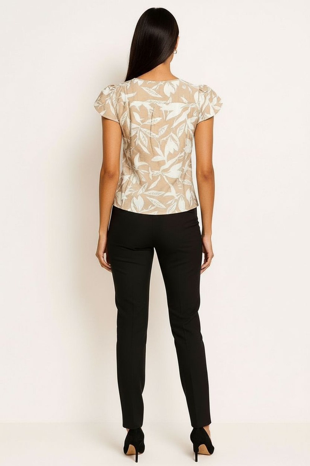 Blusa manga corta, escote redondo, aplicaciones decorativas en hombros, estructura ligera, terminación recta