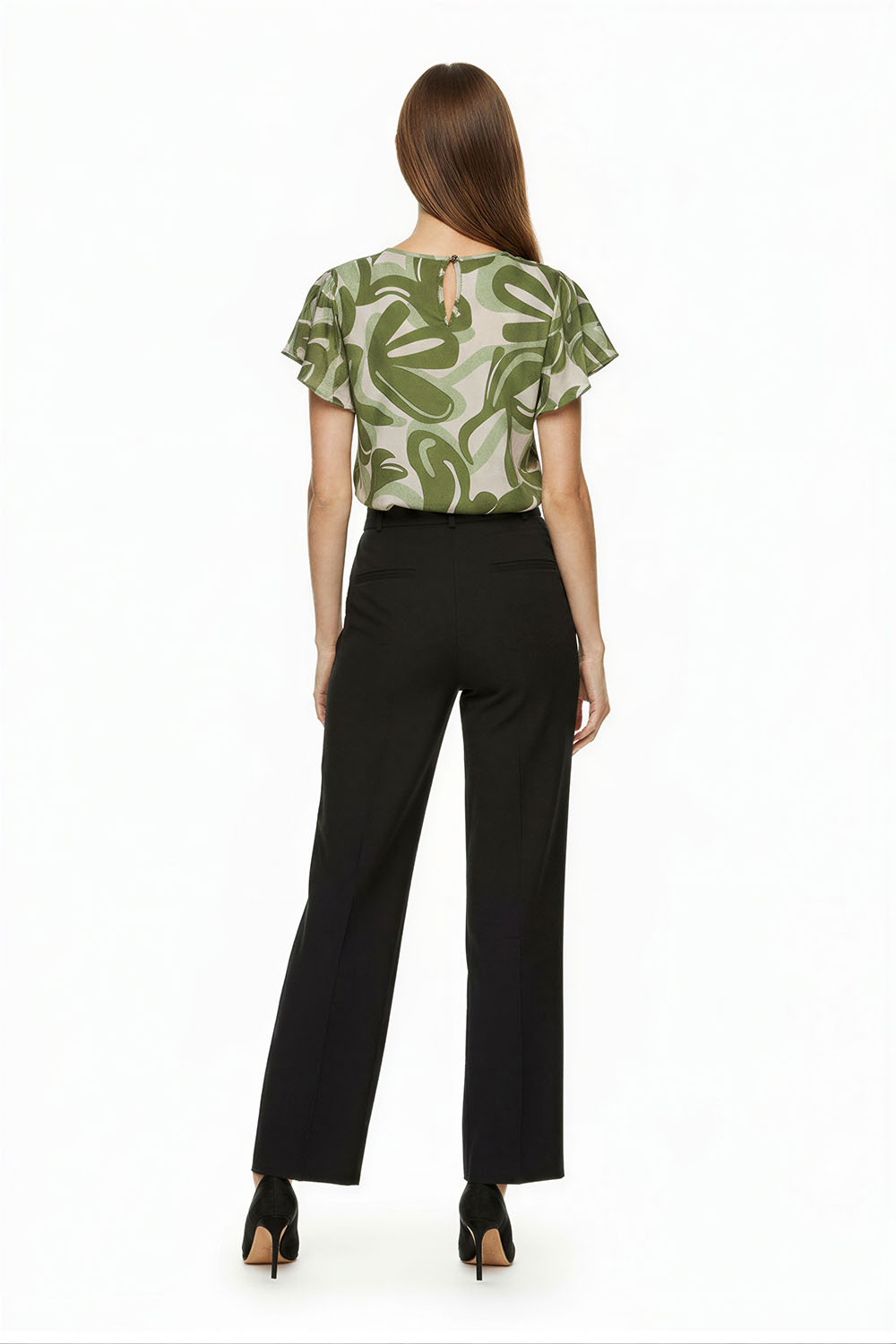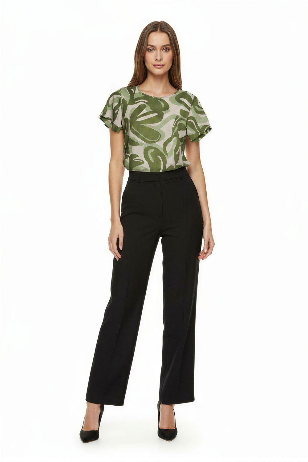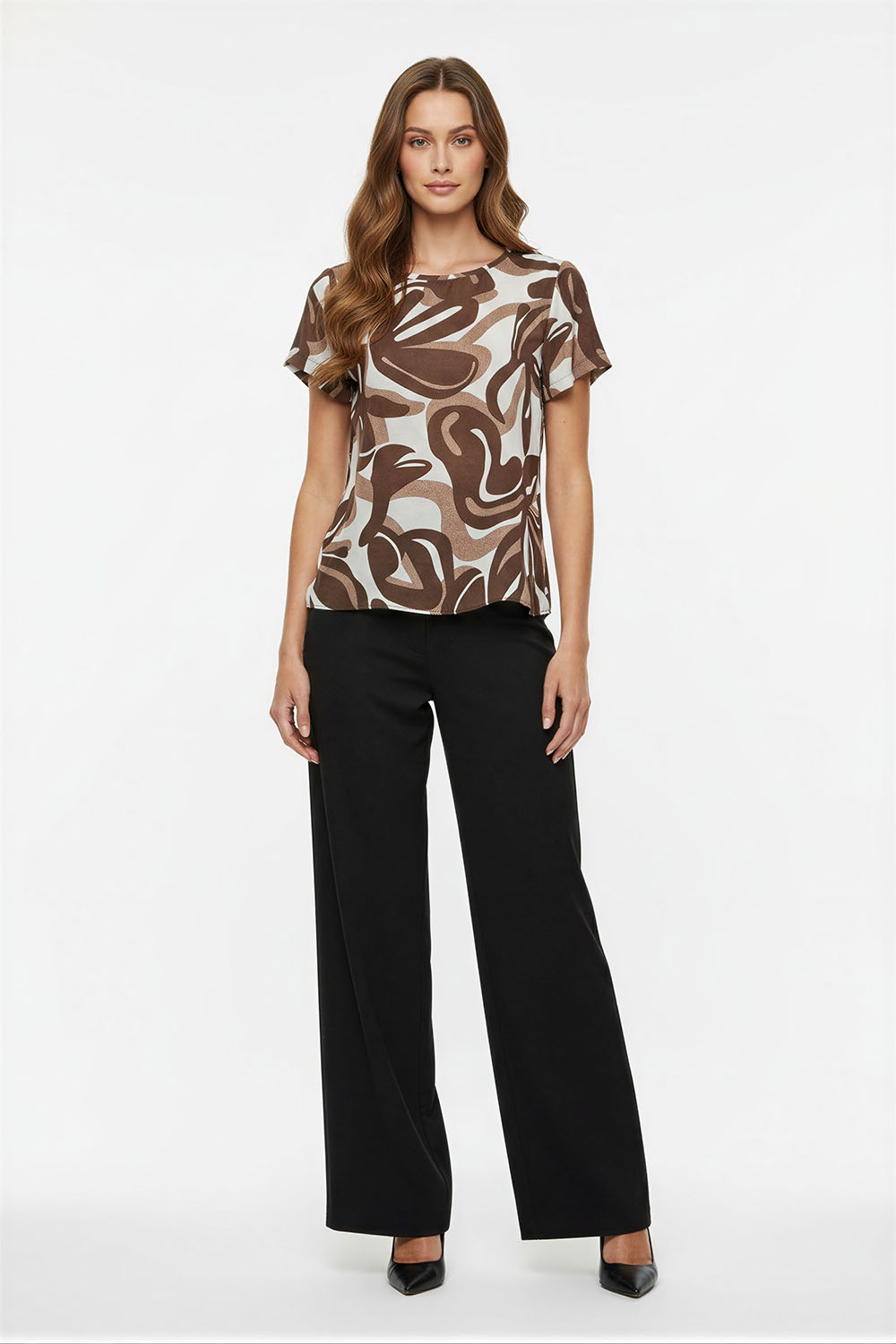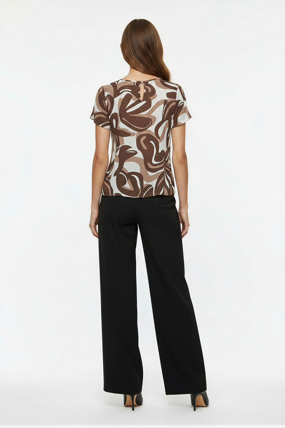 Blusa de corte recto con diseño limpio que aporta versatilidad, cuello redondo con abertura frontal y detalle decorativo, manga corta que brinda frescura, confección ligera que permite comodidad durante el día, caída suave que favorece el movimiento