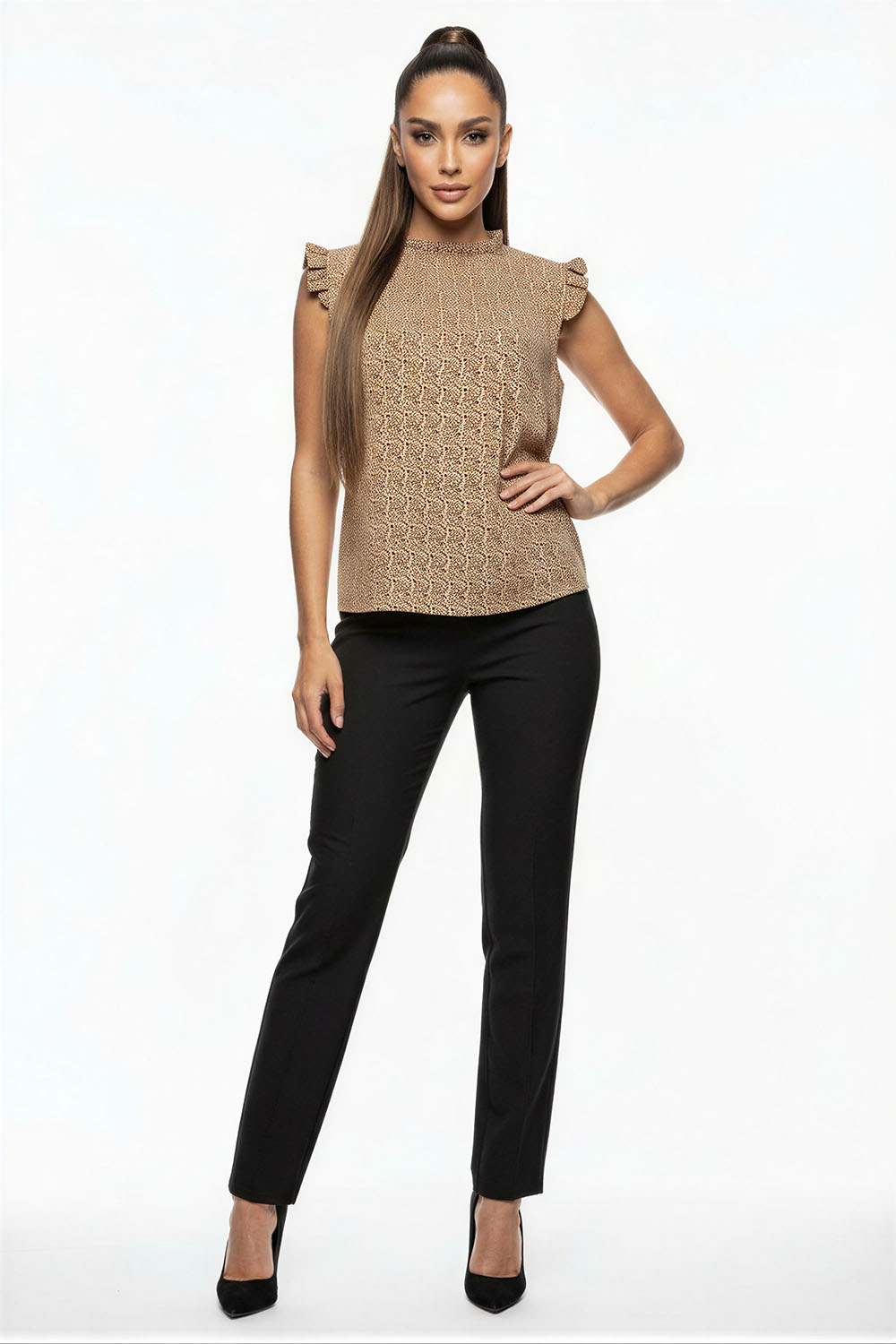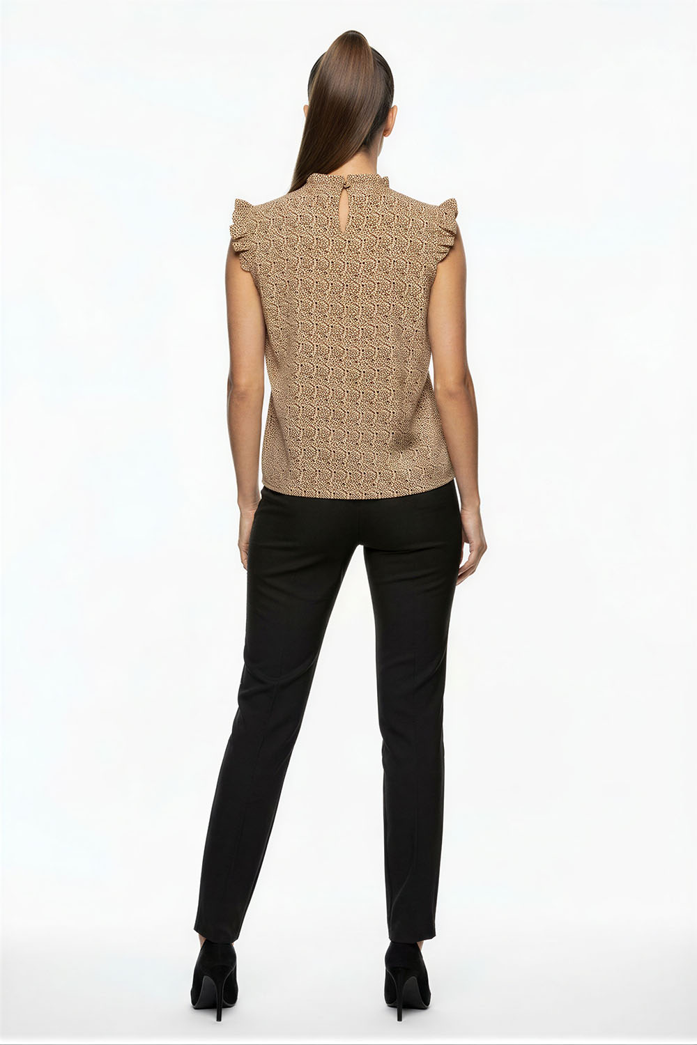 Blusa con cuello alto plisado que aporta volumen y elegancia, mangas cortas con olanes que brindan movimiento, corte recto que favorece la silueta, abertura trasera con botón que facilita el ajuste, confección ligera con caída suave