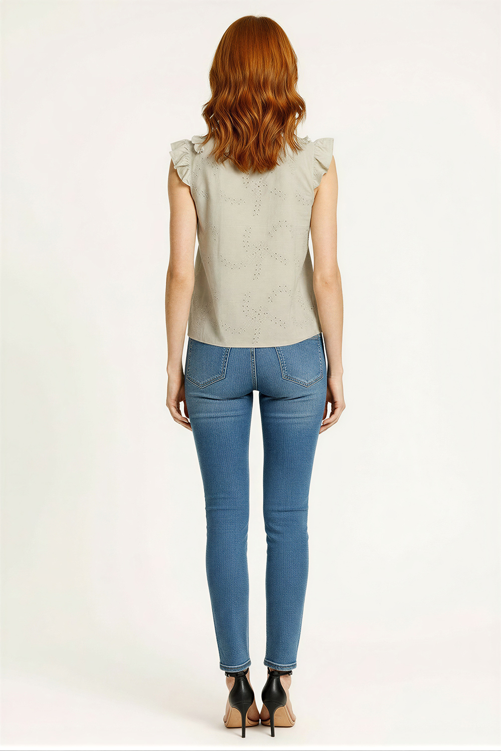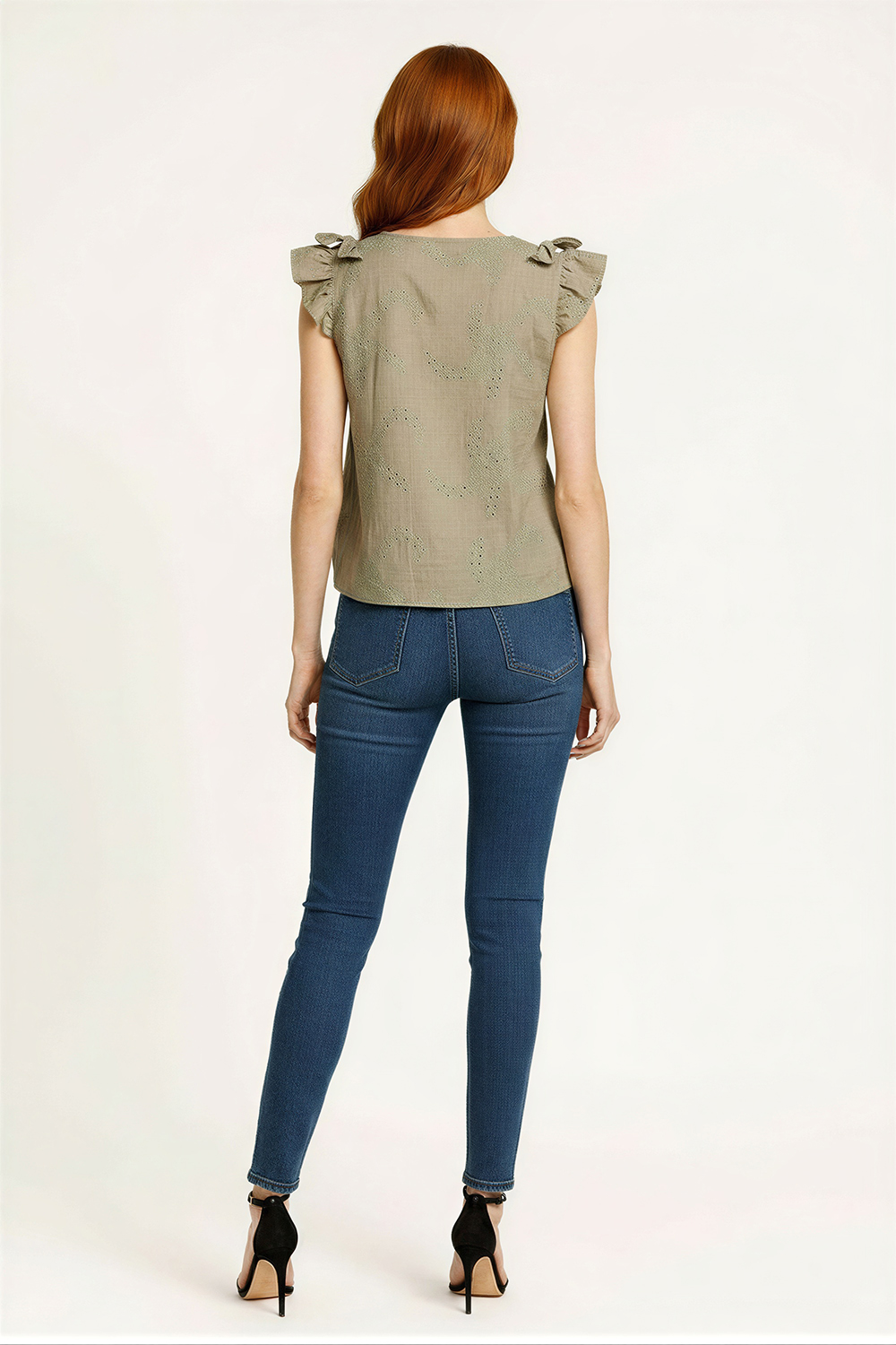 Blusa corta con escote en V que estiliza la parte superior, tirantes anchos con olanes que aportan volumen y detalle, diseño ajustado al torso que define la silueta, espalda descubierta con amarre tipo moño que permite ajuste personalizado, confección en tejido ligero con textura que brinda frescura y comodidad