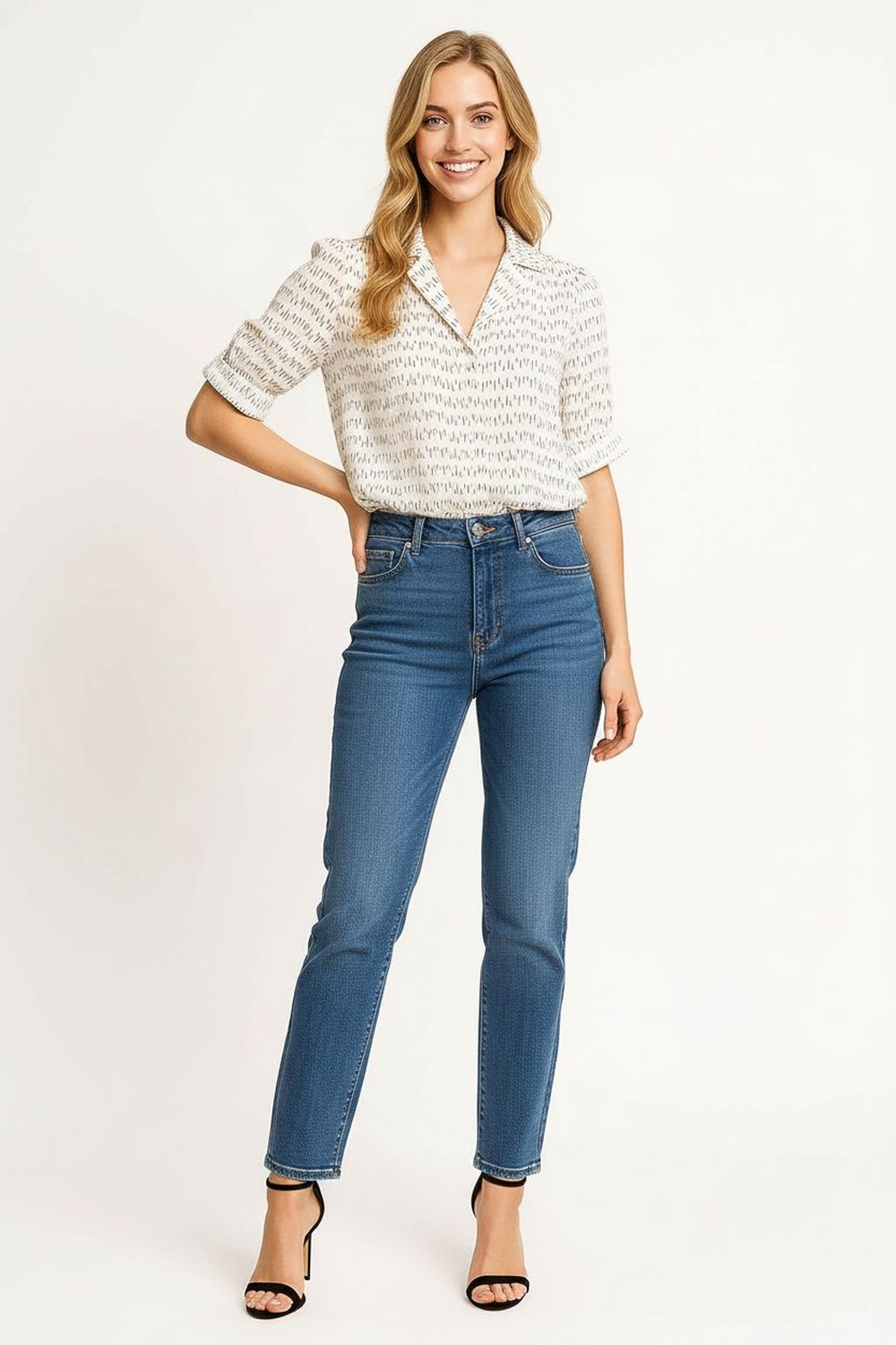 Blusa camisera con botones al frente, cuello estructurado, manga corta, silueta recta, ajuste cómodo, confección ligera