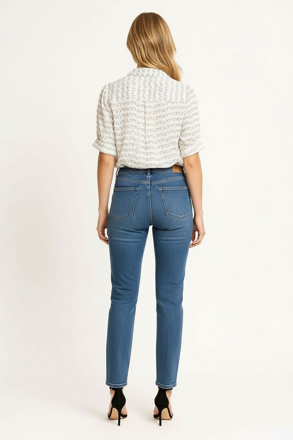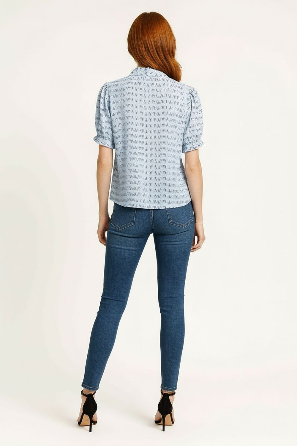 Blusa con detalle frontal, manga corta con ligero volumen, textura suave, estructura ligera, acabado limpio, caída natural