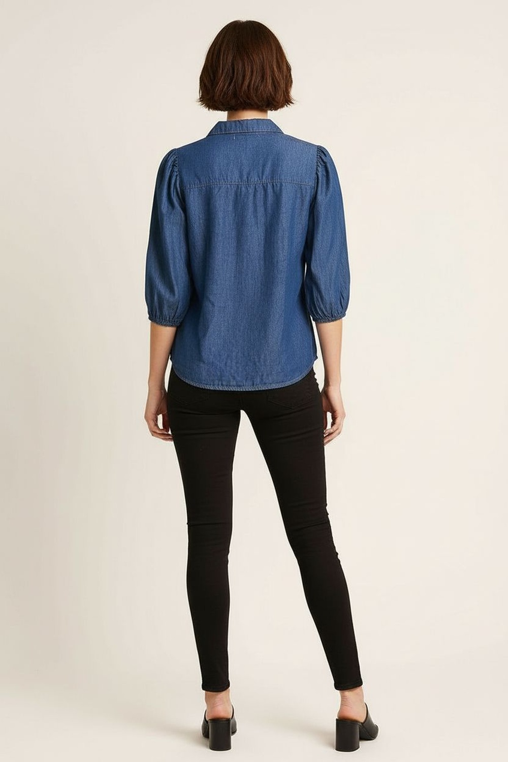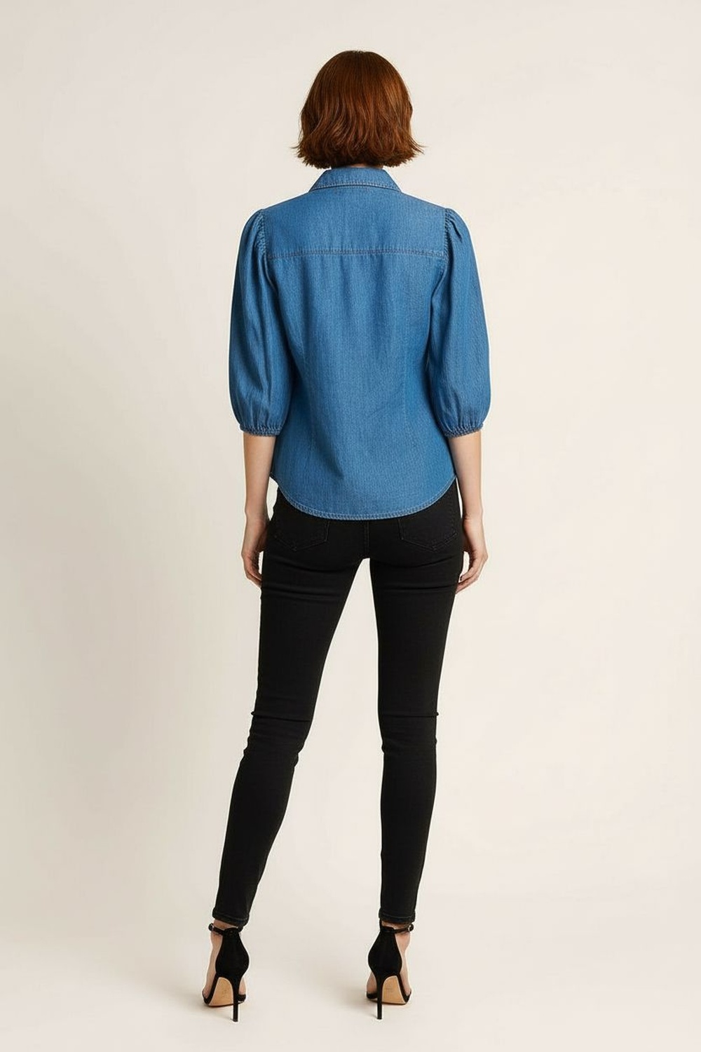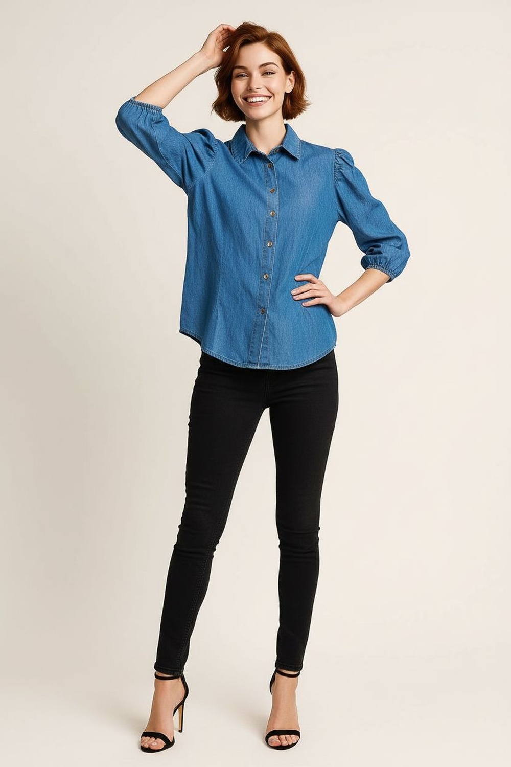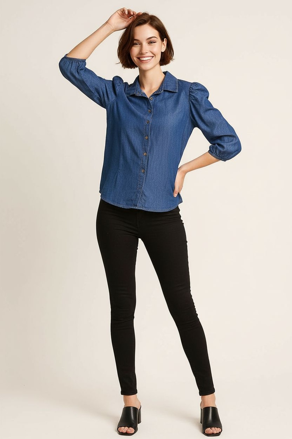 Blusa con cuello camisero y cierre frontal de botones, manga globo con volumen estructurado y puño ajustado que aporta definición, confección en tejido tipo mezclilla que brinda firmeza y presencia, corte recto con largo a la cadera que equilibra la silueta
