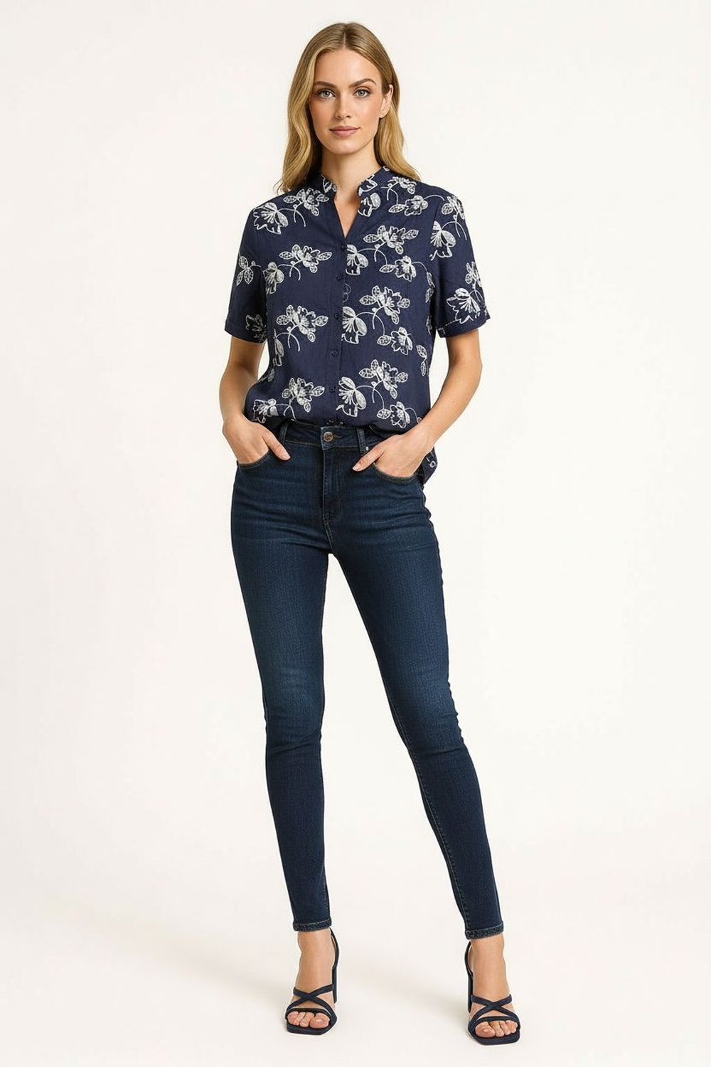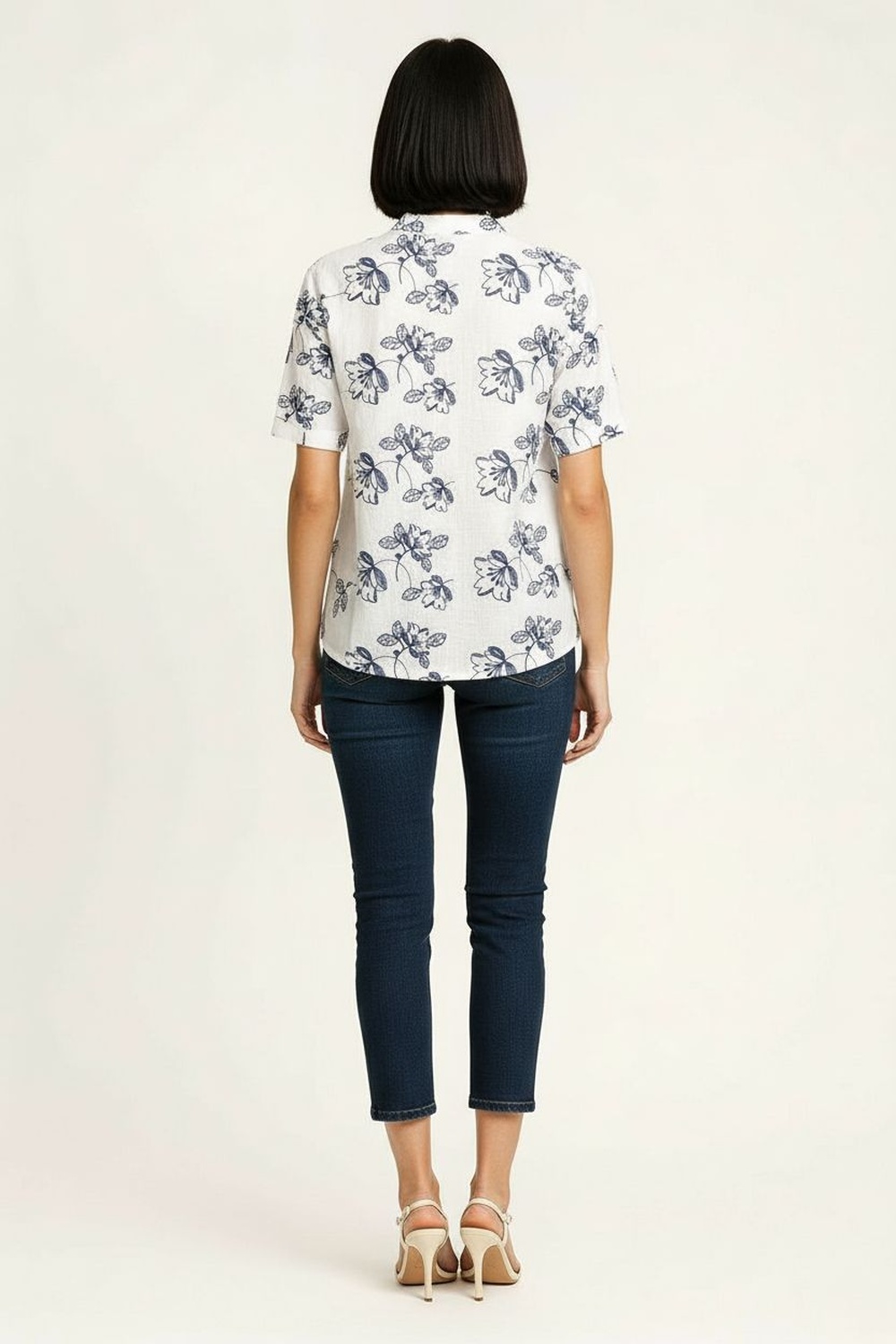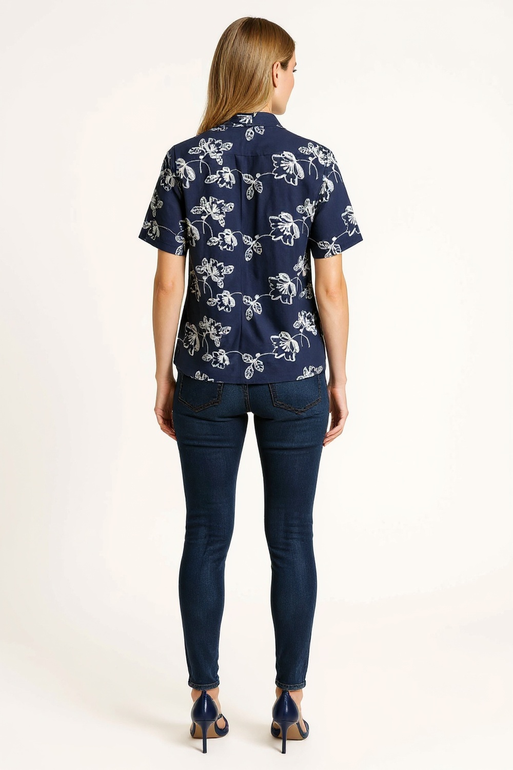 Blusa camisera con botonadura frontal completa, cuello camisero estructurado que mantiene su forma, diseño en tejido de encaje trabajado que aporta textura artesanal, mangas cortas con caída suave que ofrecen comodidad, bajo con terminación delicada que define el contorno