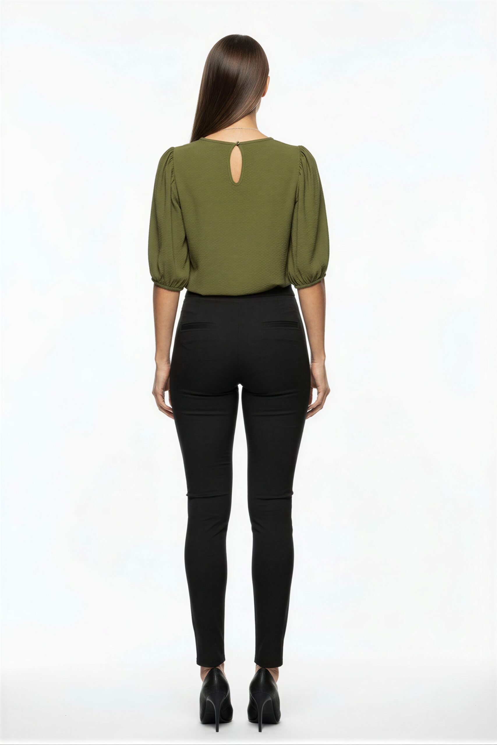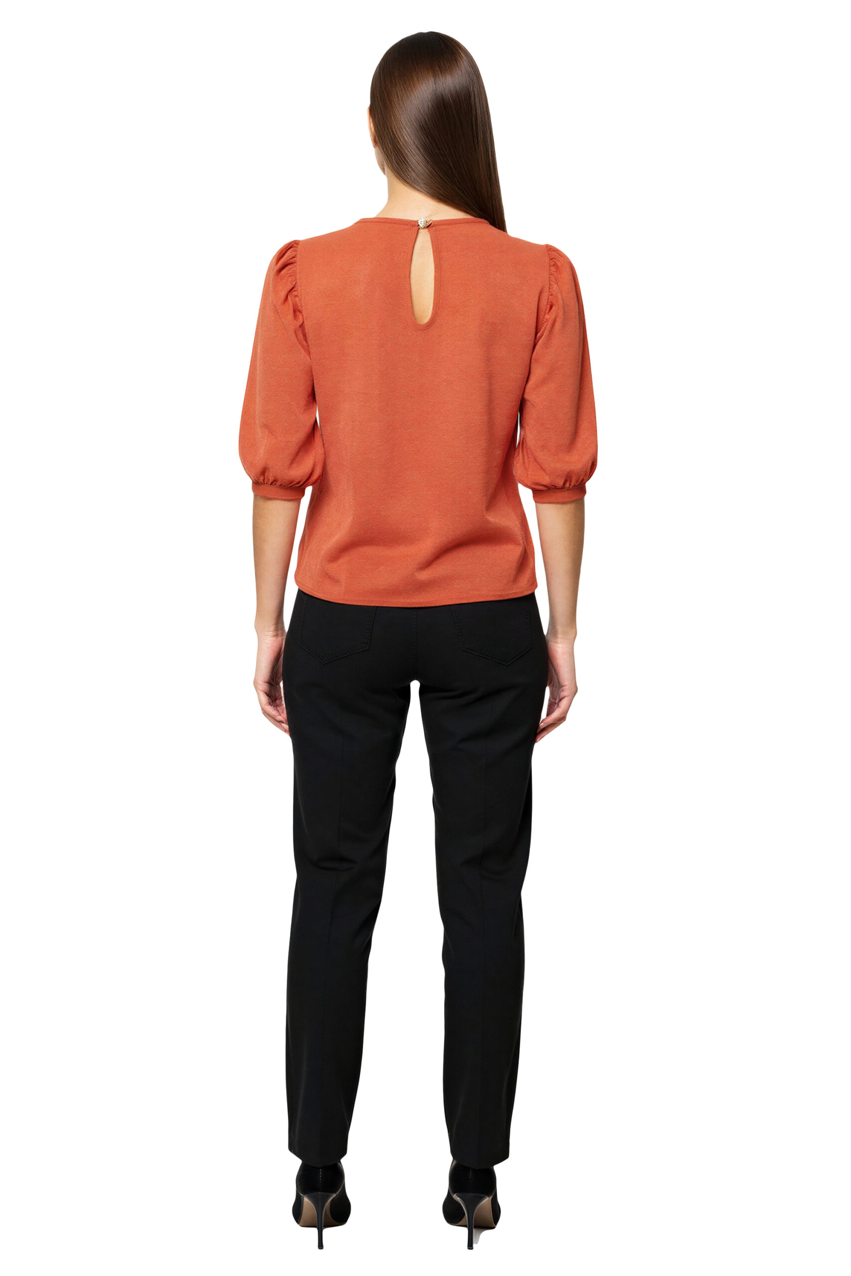 Blusa con cuello redondo, manga corta con volumen y frunce en hombros, textura ligera, caída recta, ajuste cómodo