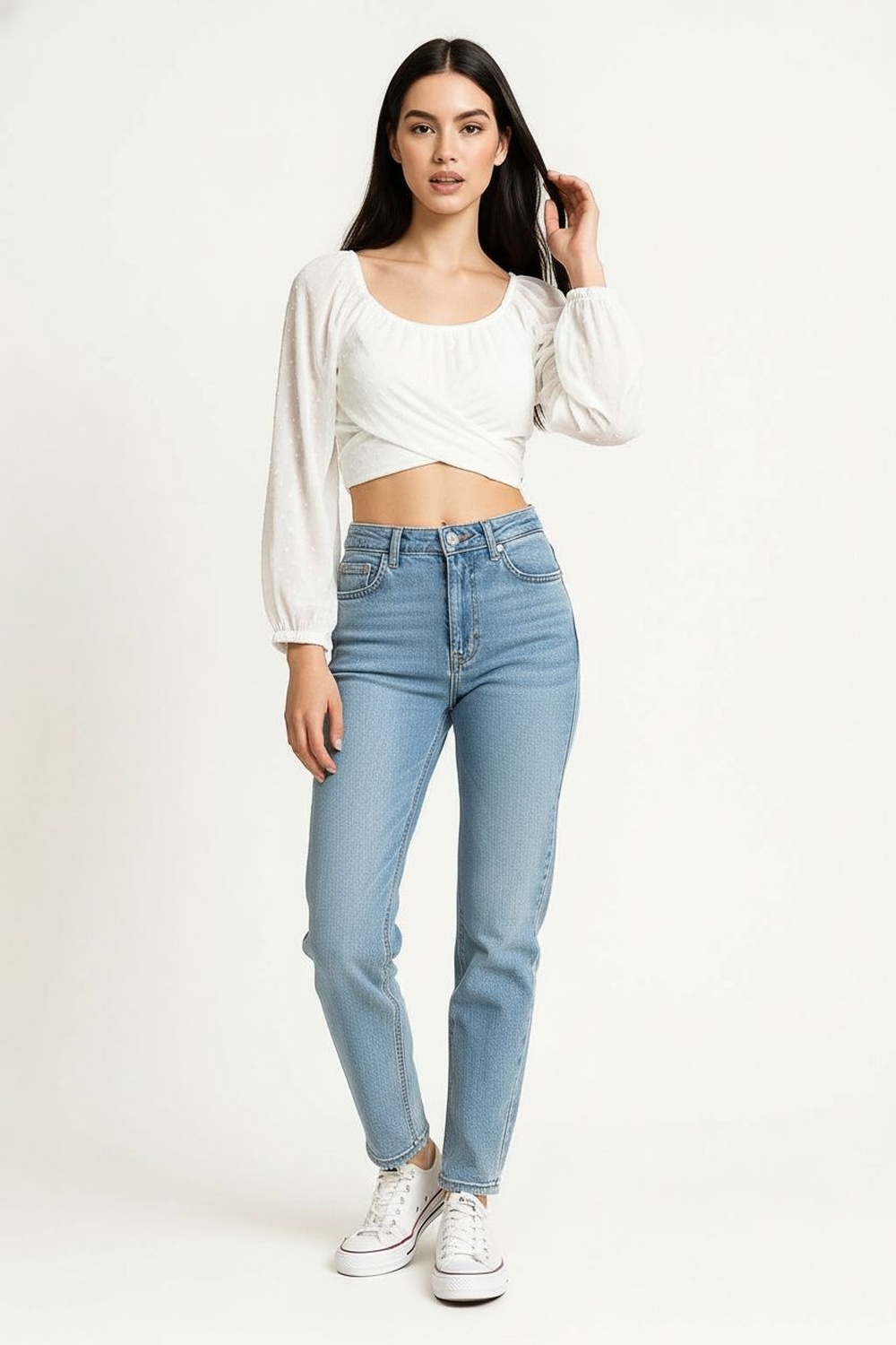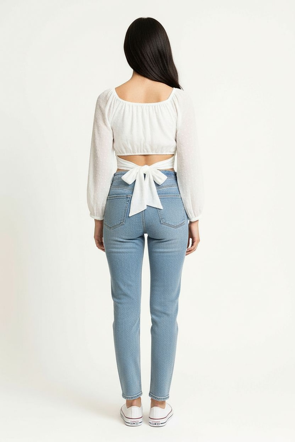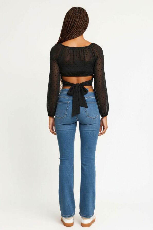 Blusa de manga larga con escote cuadrado que realza la figura, diseño cruzado al frente y amarre posterior que permite ajustar el fit, confeccionada en tejido ligero con caída natural que aporta comodidad y un toque femenino
