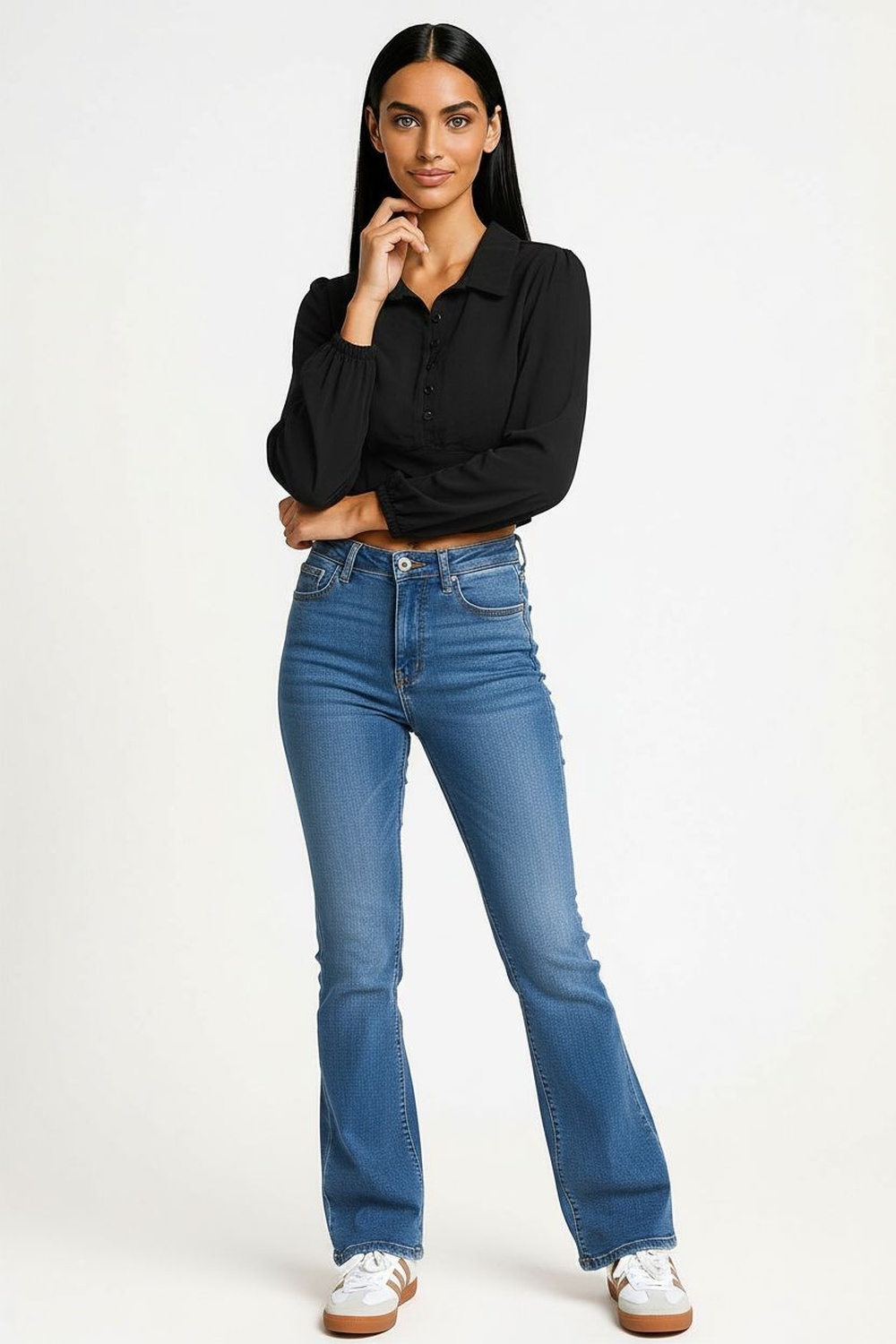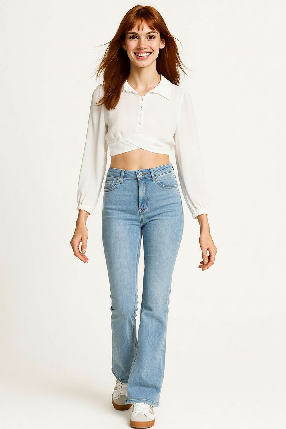 Blusa crop tipo camisera diseño de corte amplio y relajado con caída fluida, cuello clásico y botonadura frontal completa, manga corta amplia que aporta comodidad y movimiento, ideal para looks casuales, effortless chic