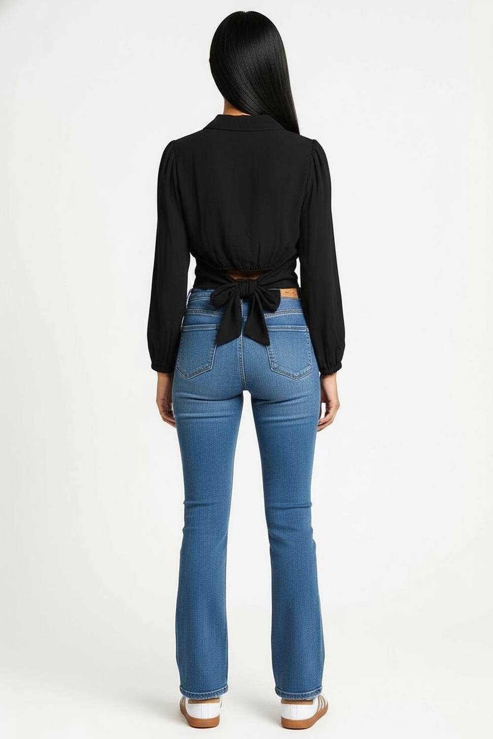 Blusa manga larga con cuello camisero y botones frontales, corte cruzado con amarre en espalda que ajusta la cintura y define la silueta, hombros ligeramente estructurados que aportan elegancia, prenda confeccionada en tejido suave y fluido para máximo confort