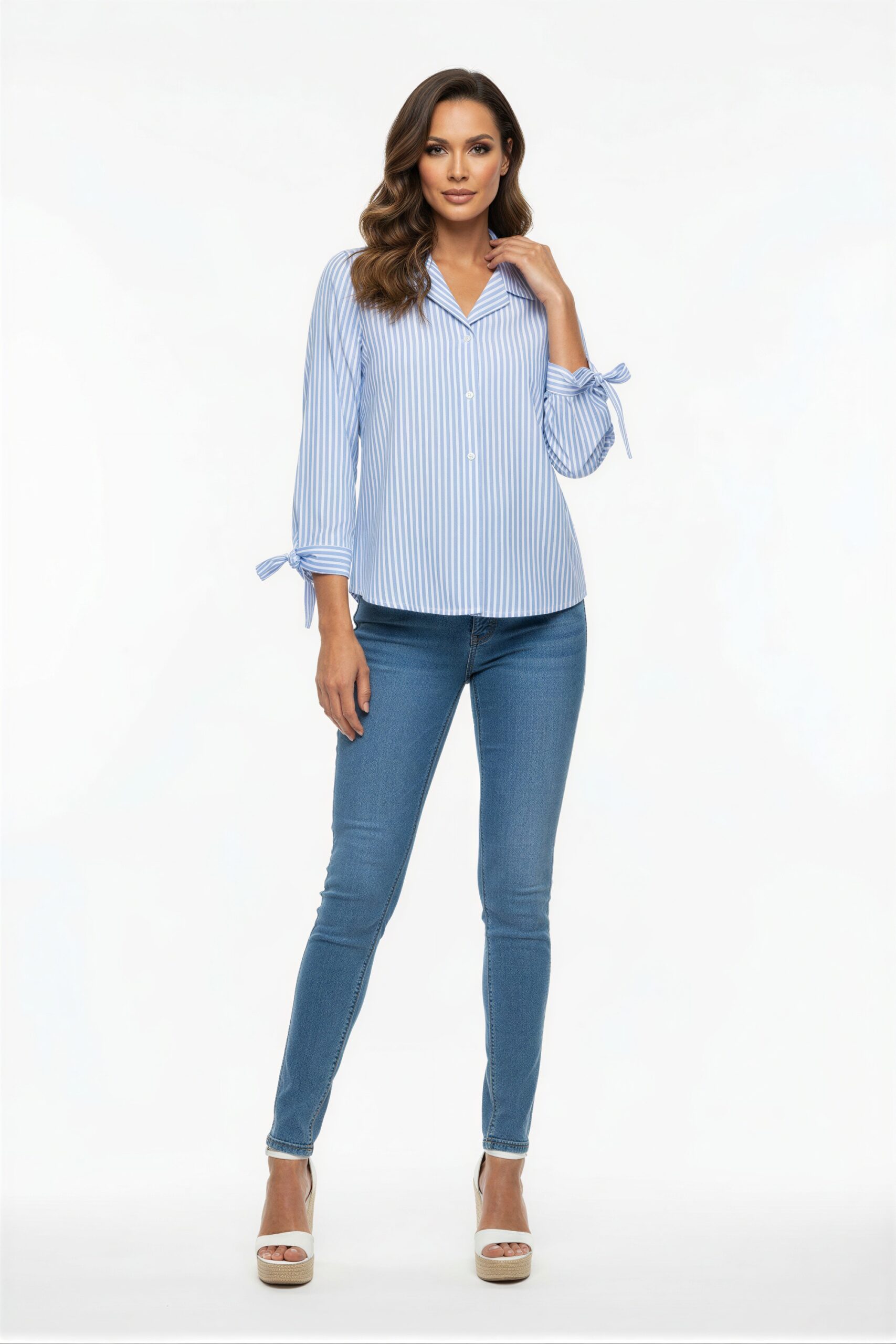 Blusa cruzada con escote en V, ajuste en cintura, corte con vuelo, estructura ligera, caída fluida, acabado suave