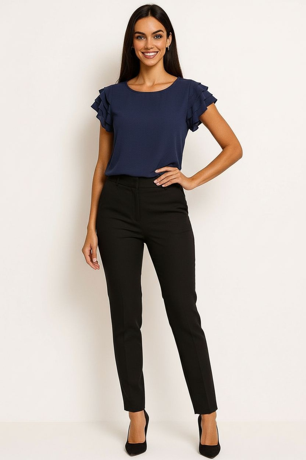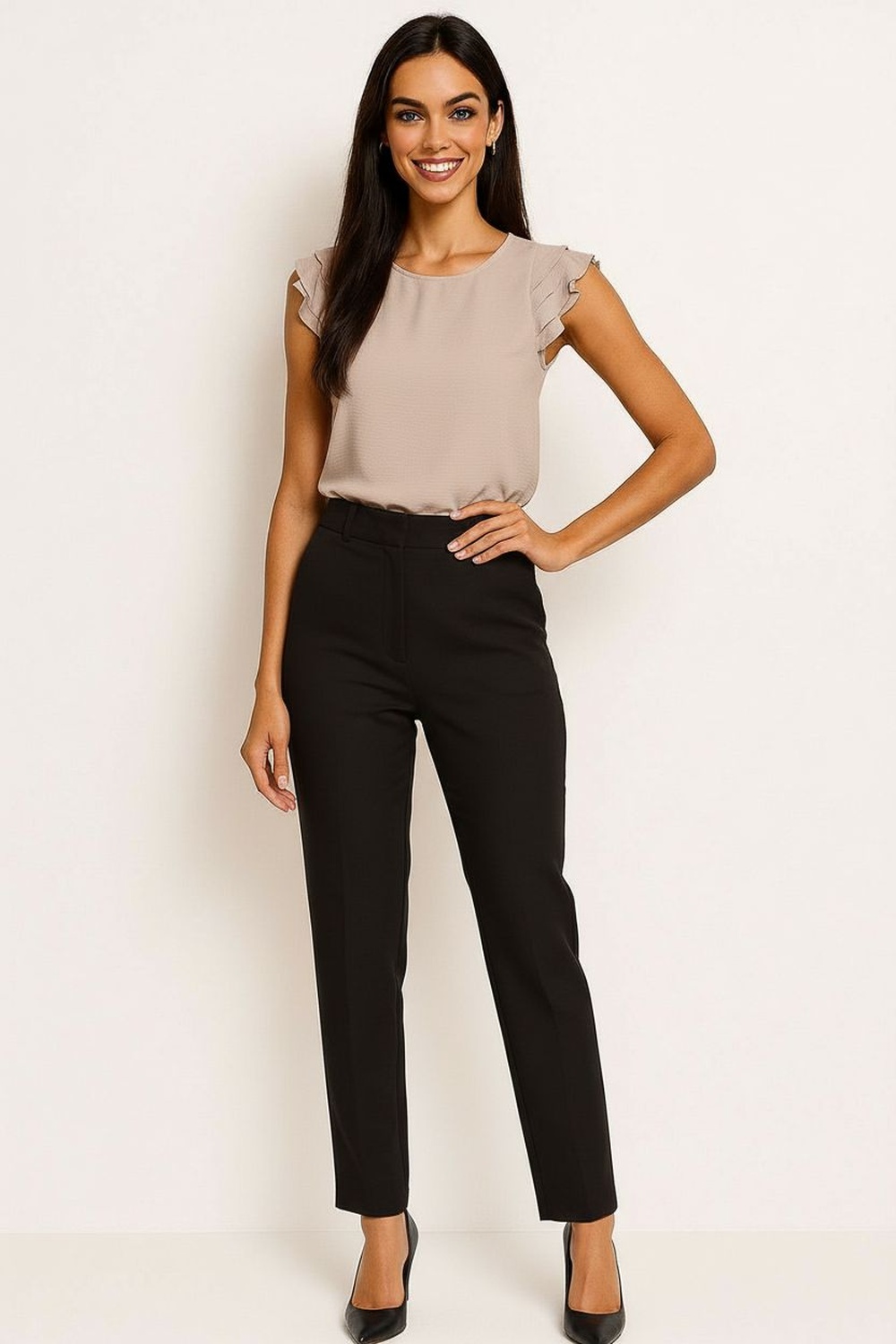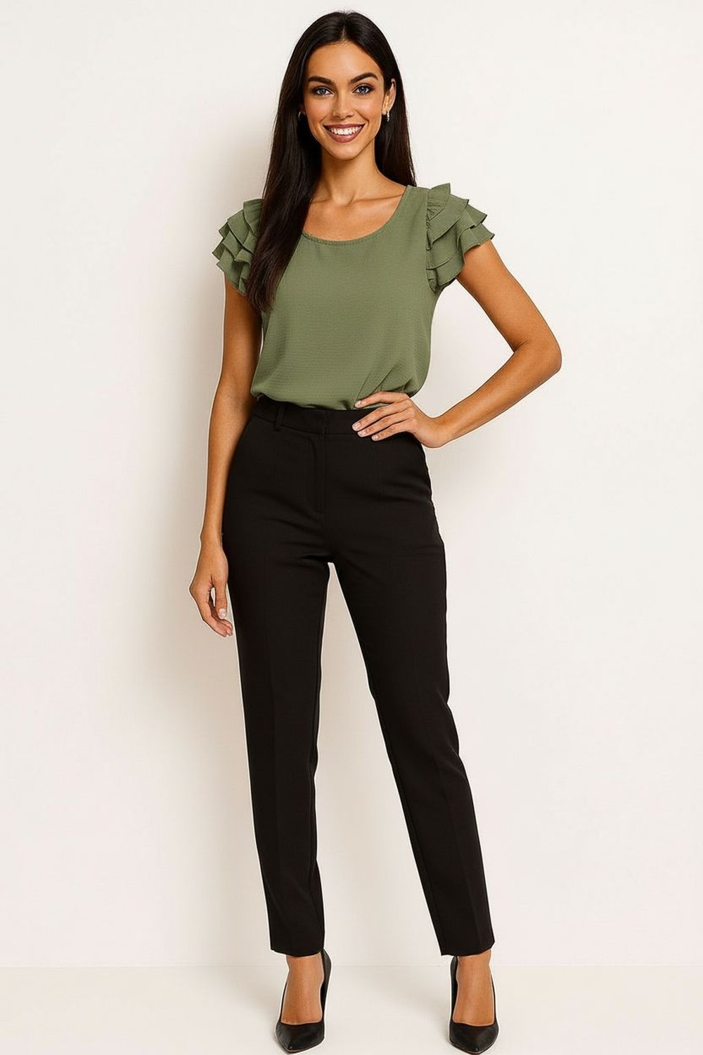 Blusa de tirantes delgados ajustables con escote en forma suave, botonadura frontal funcional que facilita el ajuste, corte en cintura con olan inferior que aporta volumen y movimiento, confección ligera con caída fluida y largo a la cadera