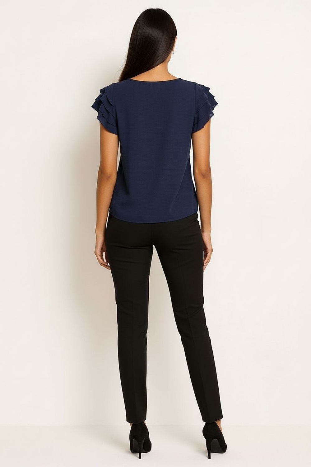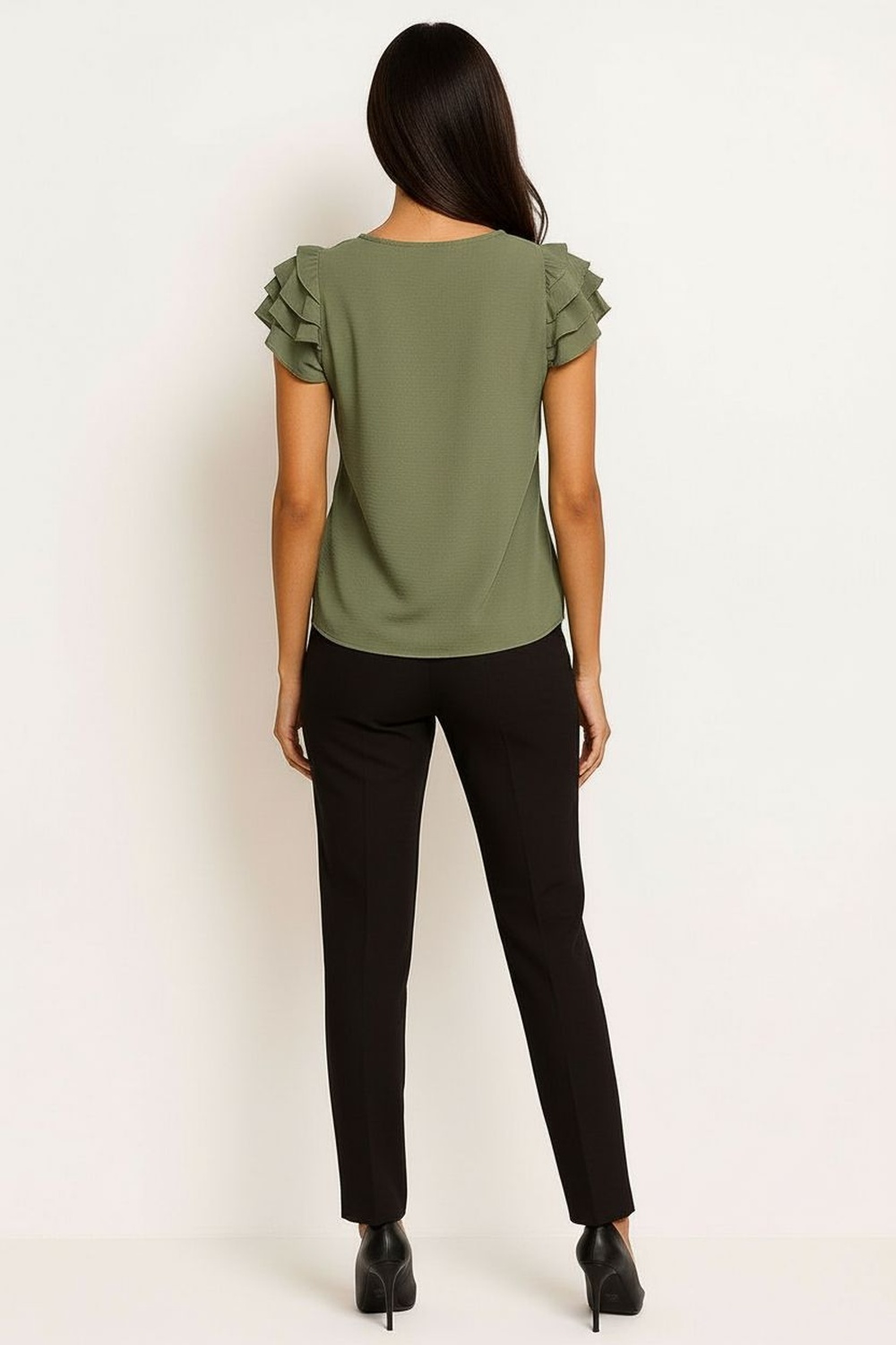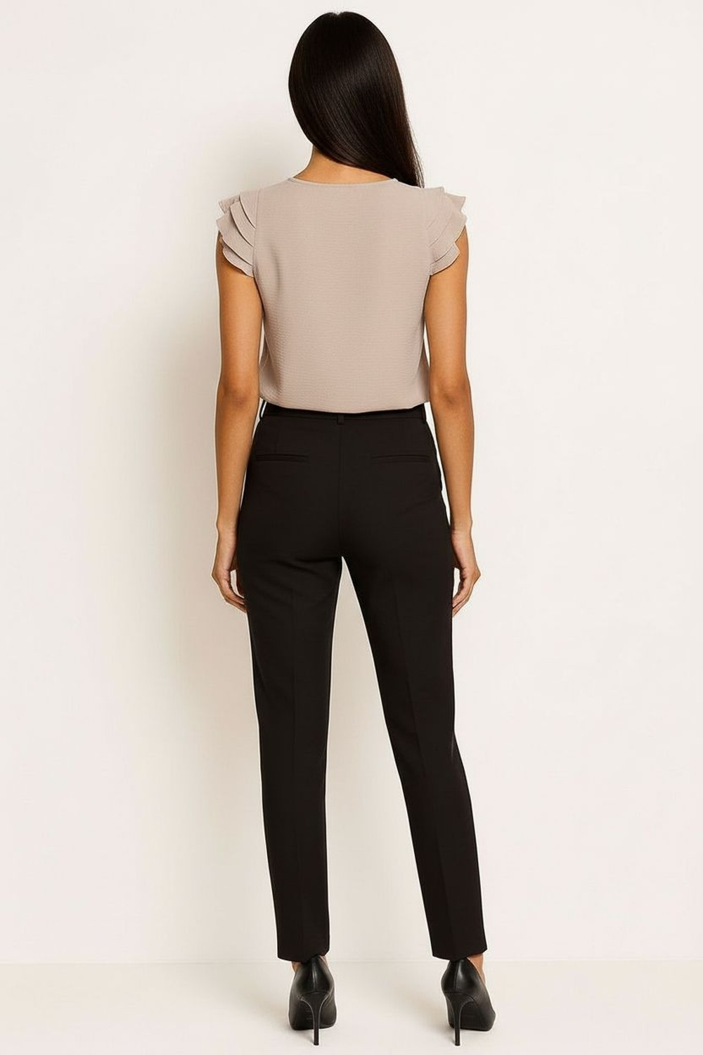 Blusa de tirantes delgados ajustables con escote en forma suave, botonadura frontal funcional que facilita el ajuste, corte en cintura con olan inferior que aporta volumen y movimiento, confección ligera con caída fluida y largo a la cadera