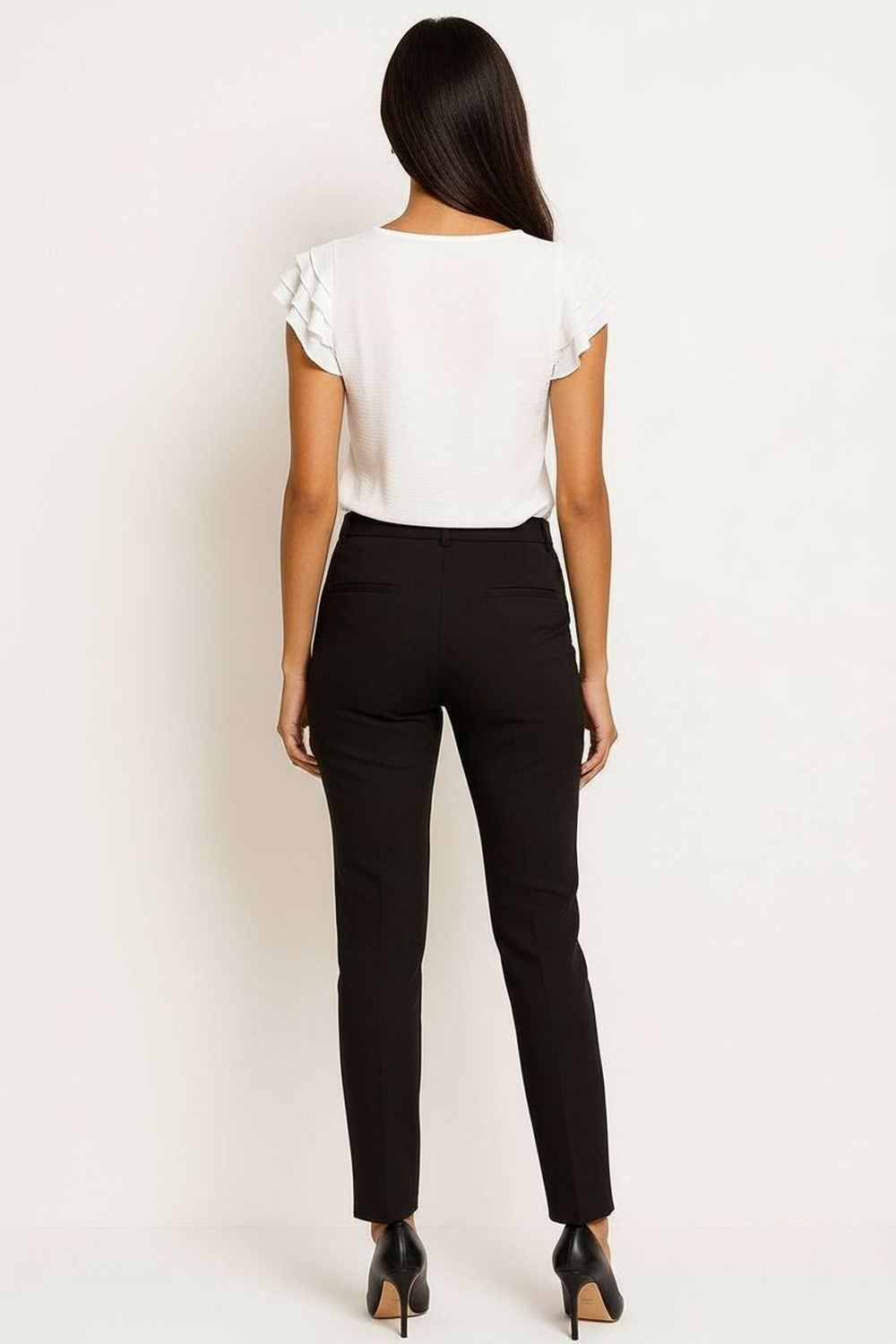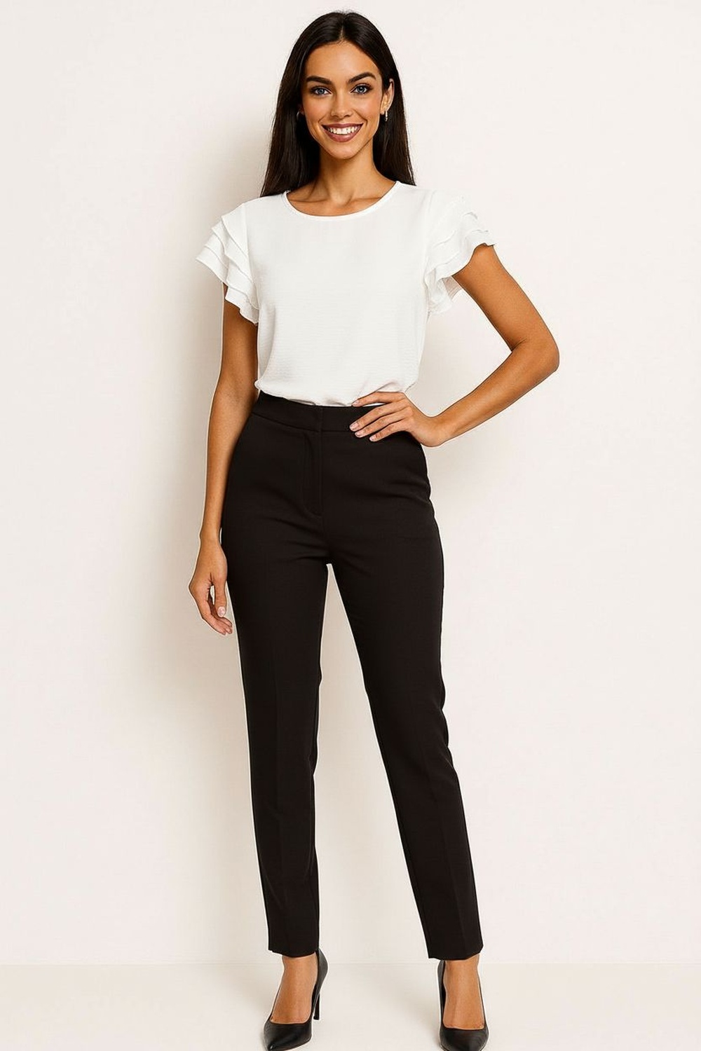 Conjunto compuesto por top corto con tirantes finos y detalles frontales decorativos, estructura que se ajusta de manera uniforme al torso, pantalón de tiro medio con corte ligeramente abierto en la parte baja, confección que equilibra firmeza y comodidad, caída continua que estiliza visualmente la figura