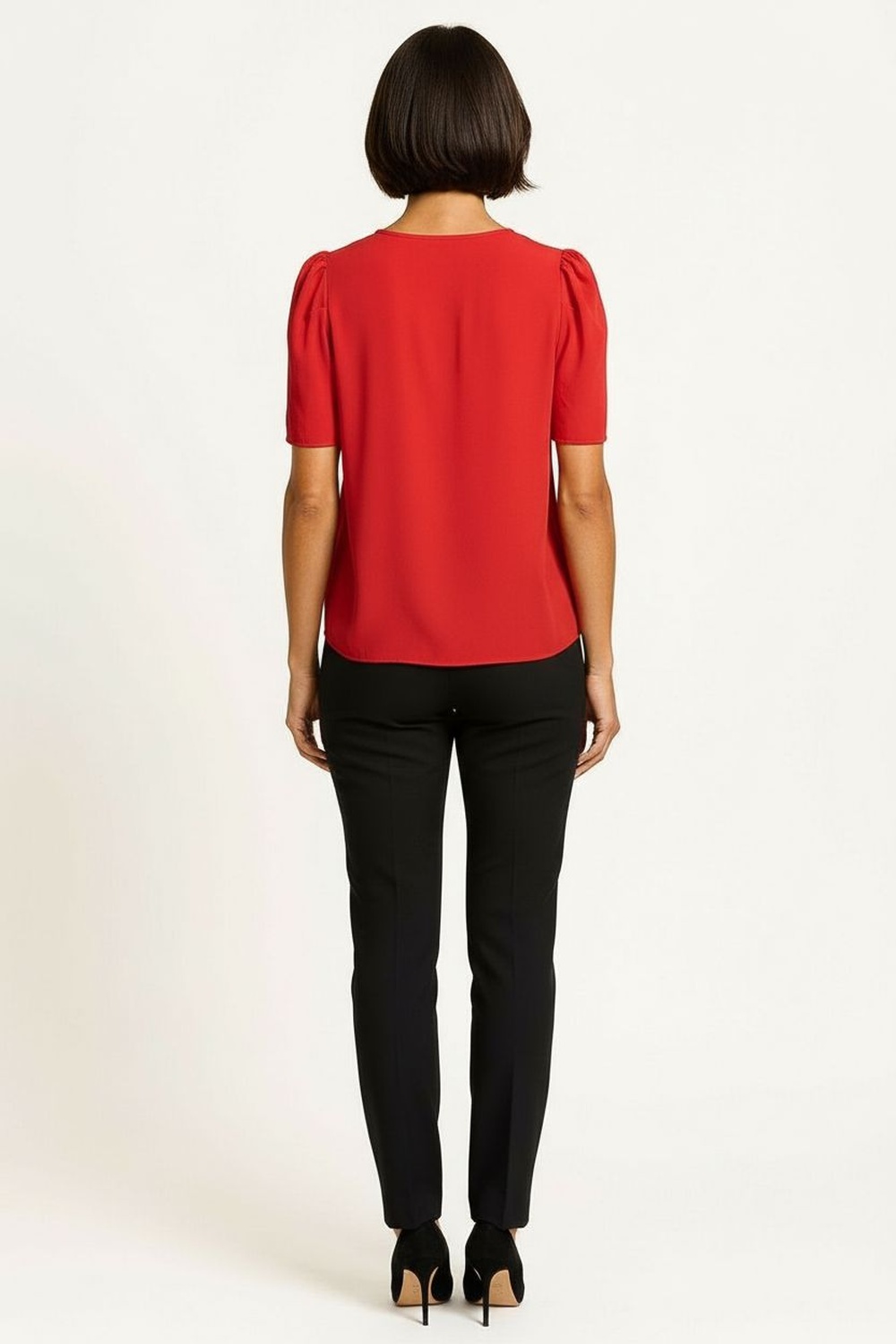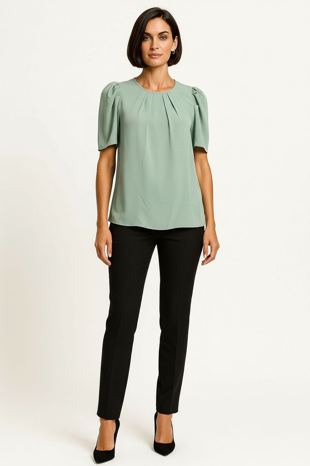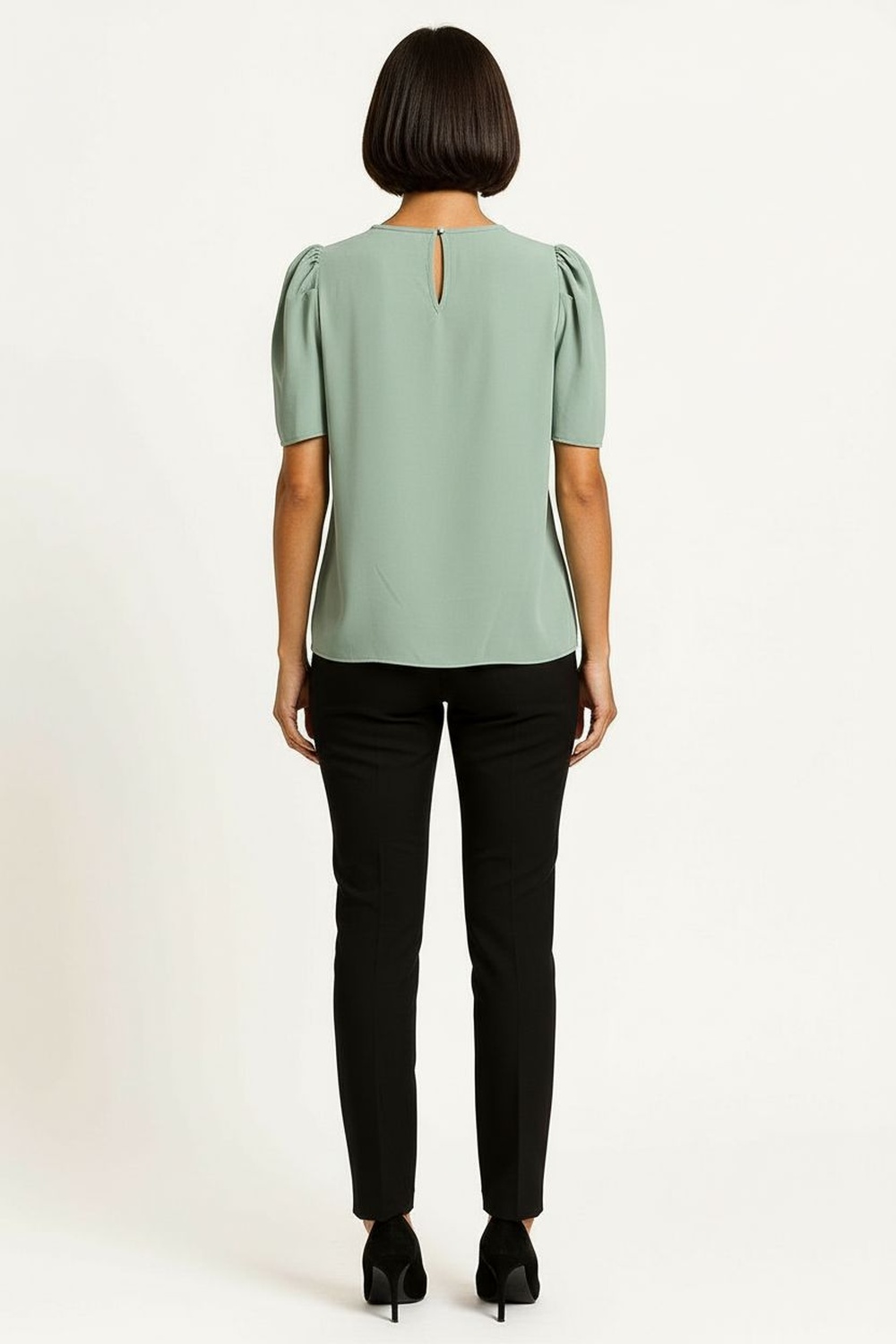 Blusa, manga abullonada, pliegues al frente, caída ligera, terminaciones limpias