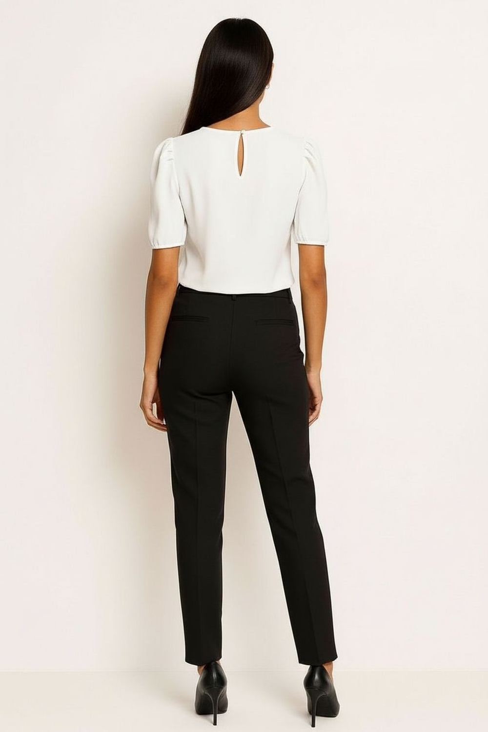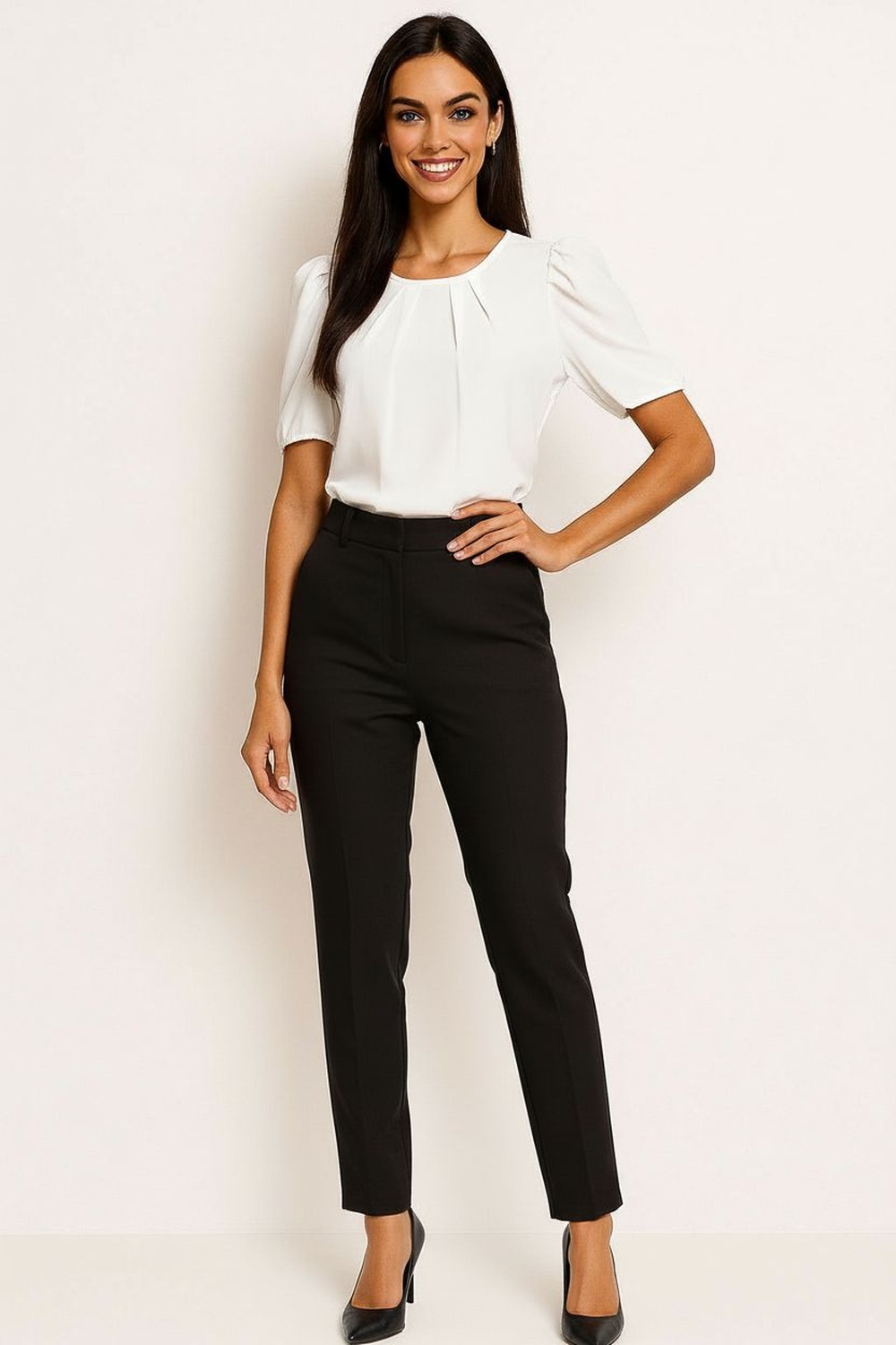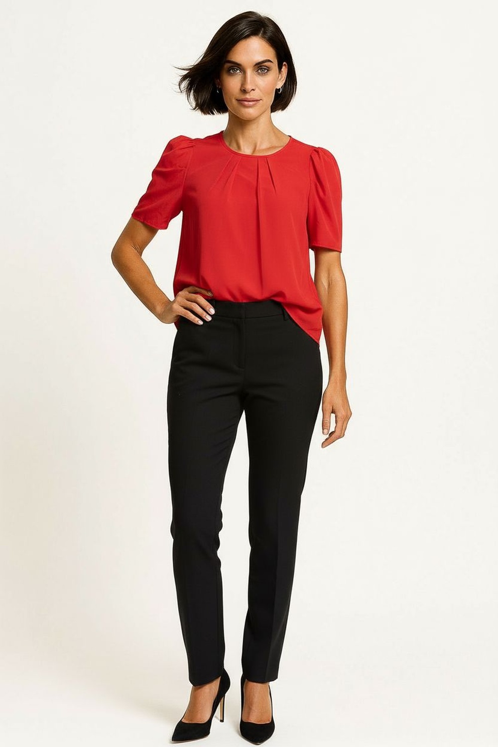 Blusa, manga abullonada, pliegues al frente, caída ligera, terminaciones limpias