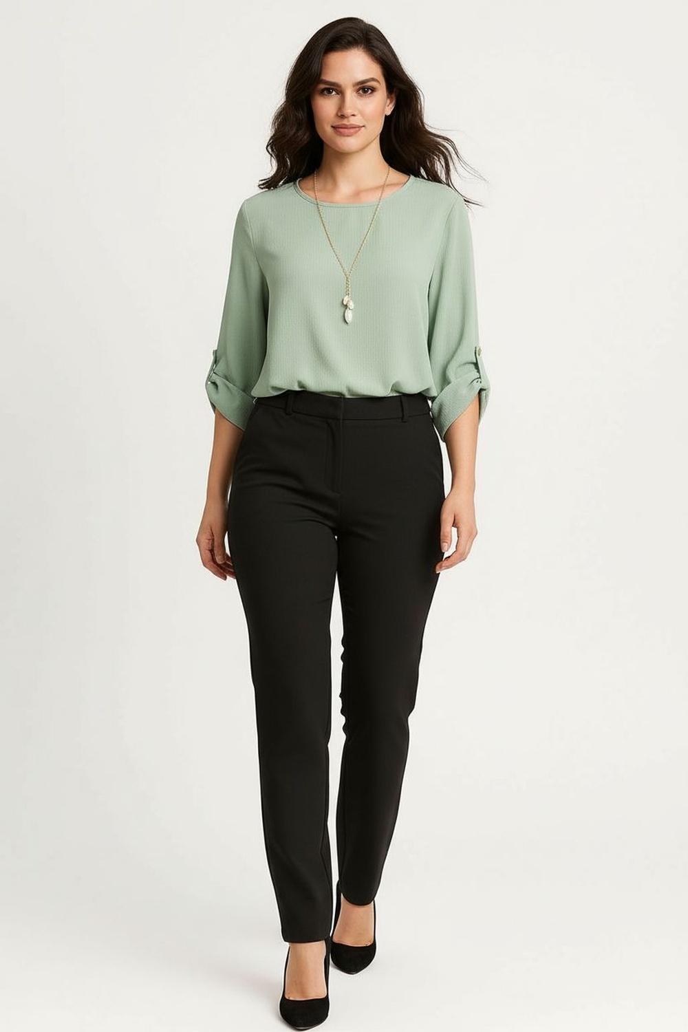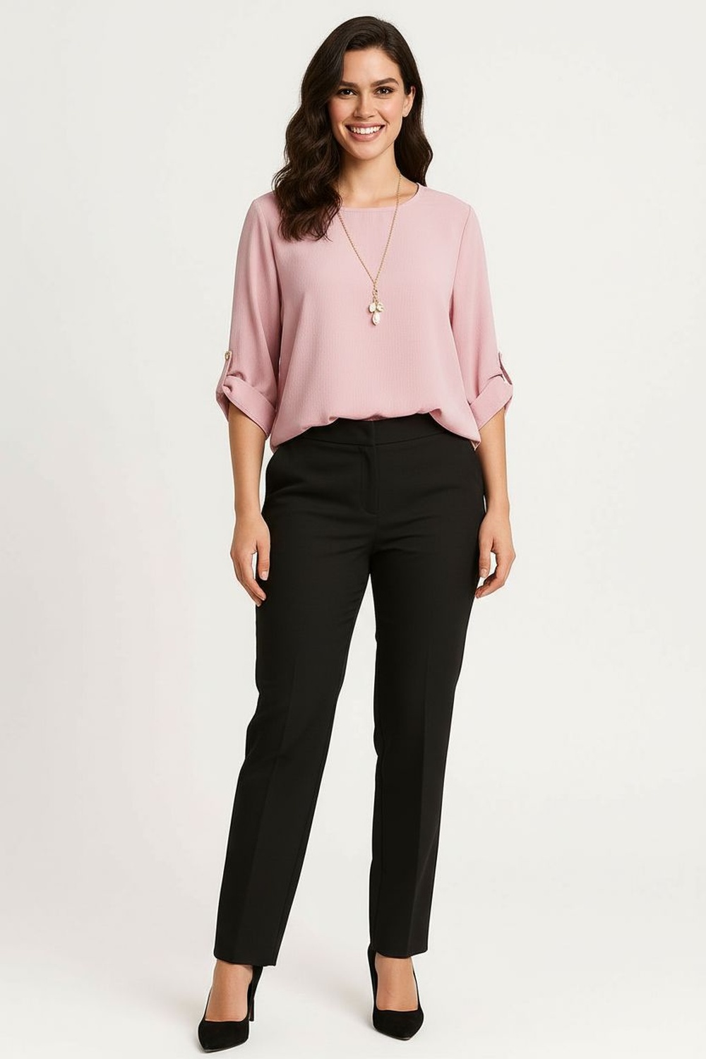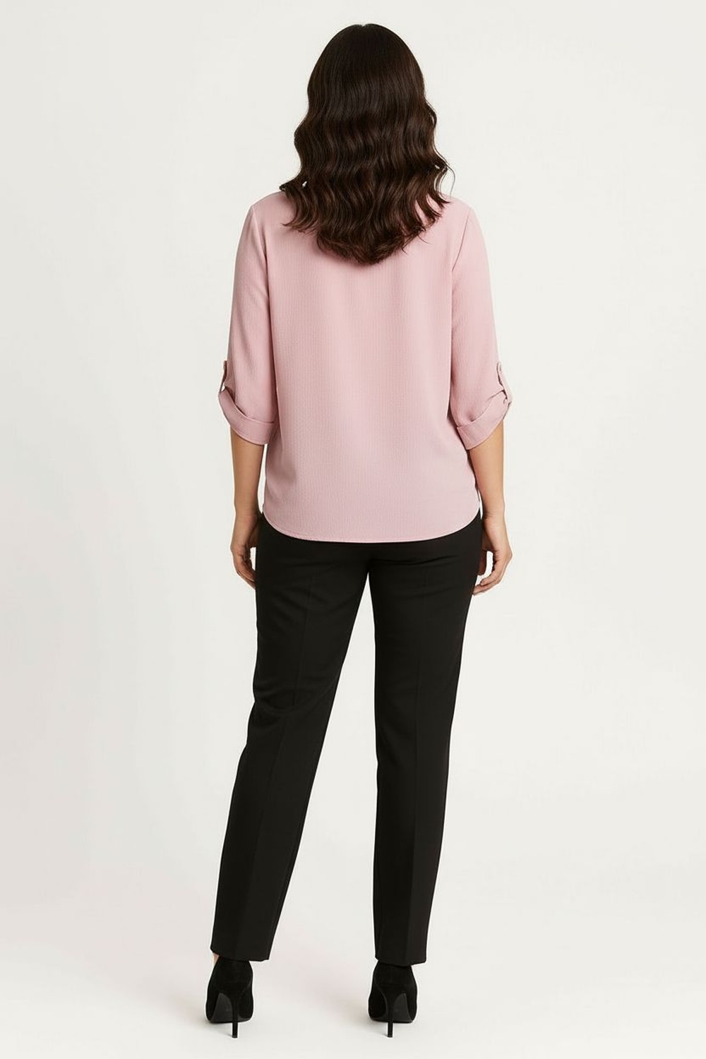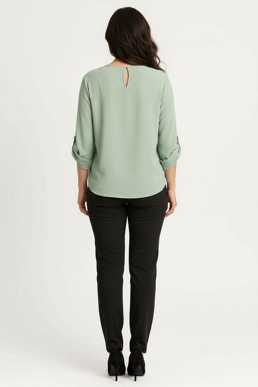 Blusa de manga tres cuartos con ajuste mediante botón lateral que permite recoger la manga, escote redondo con terminado discreto que aporta equilibrio al diseño, silueta amplia con caída ligera que brinda comodidad y libertad de movimiento, largo extendido que cubre cadera y estiliza la línea corporal